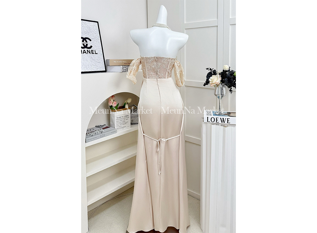 一字肩设计凸显肩颈线条修身长裙展现曼妙身姿