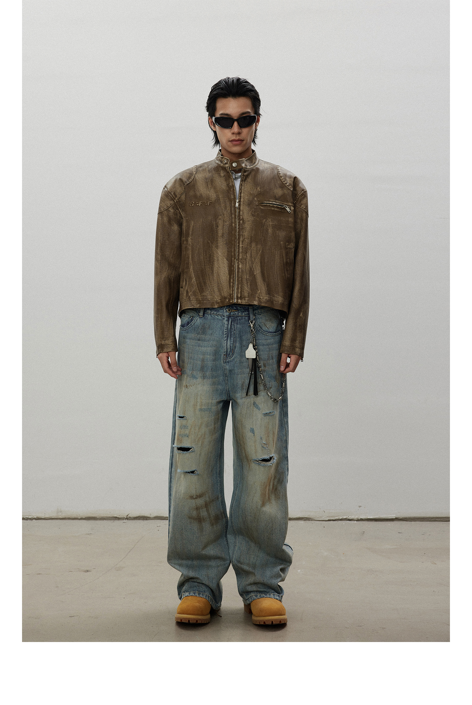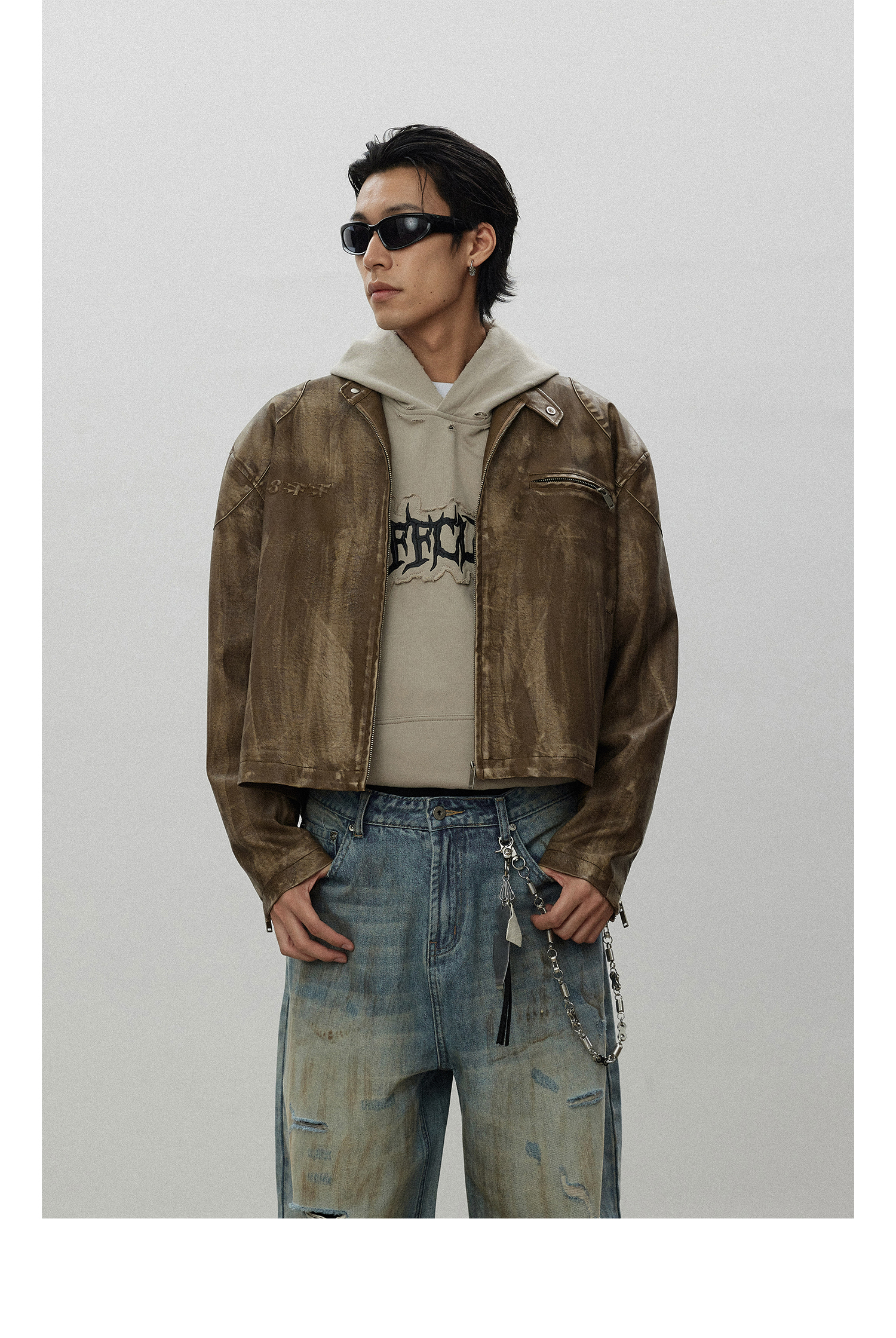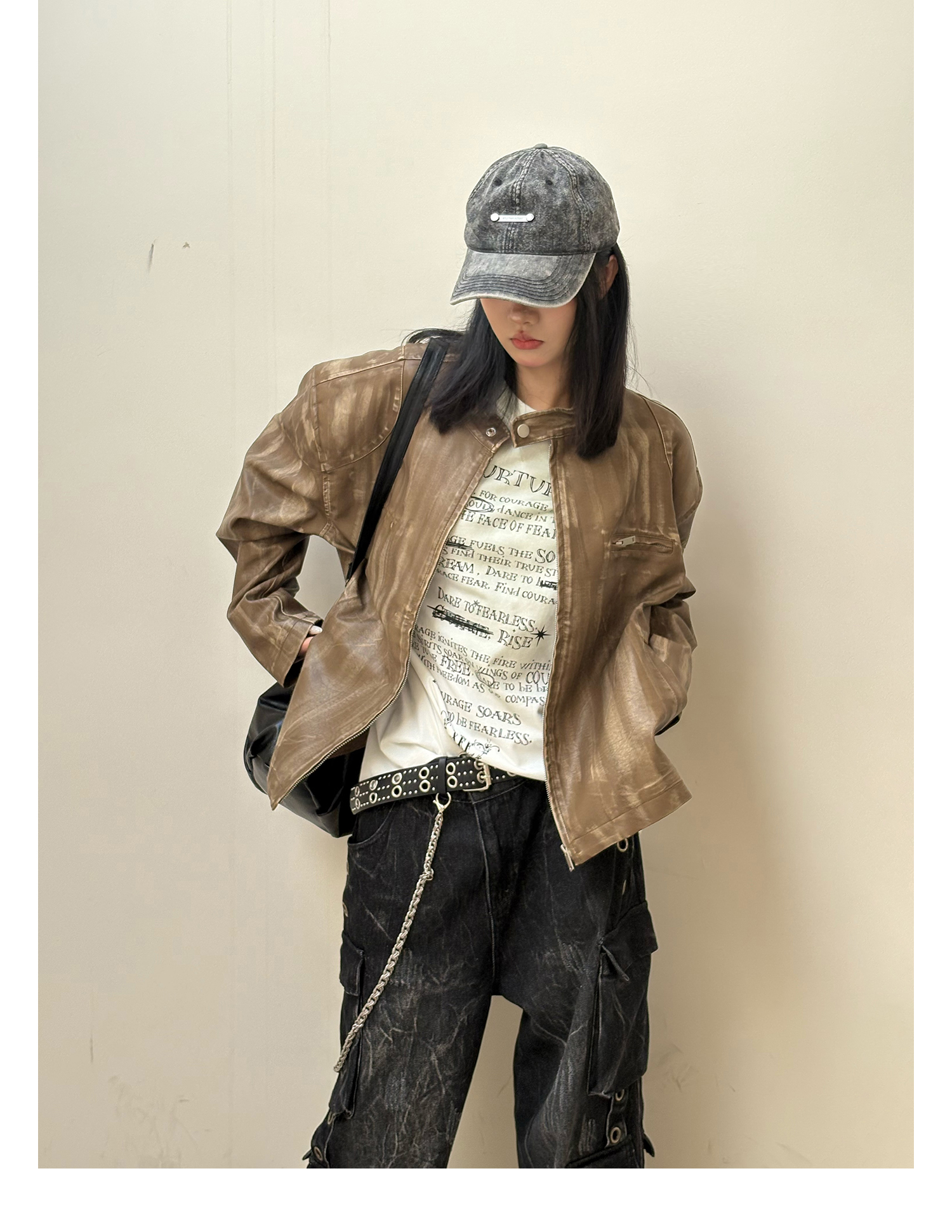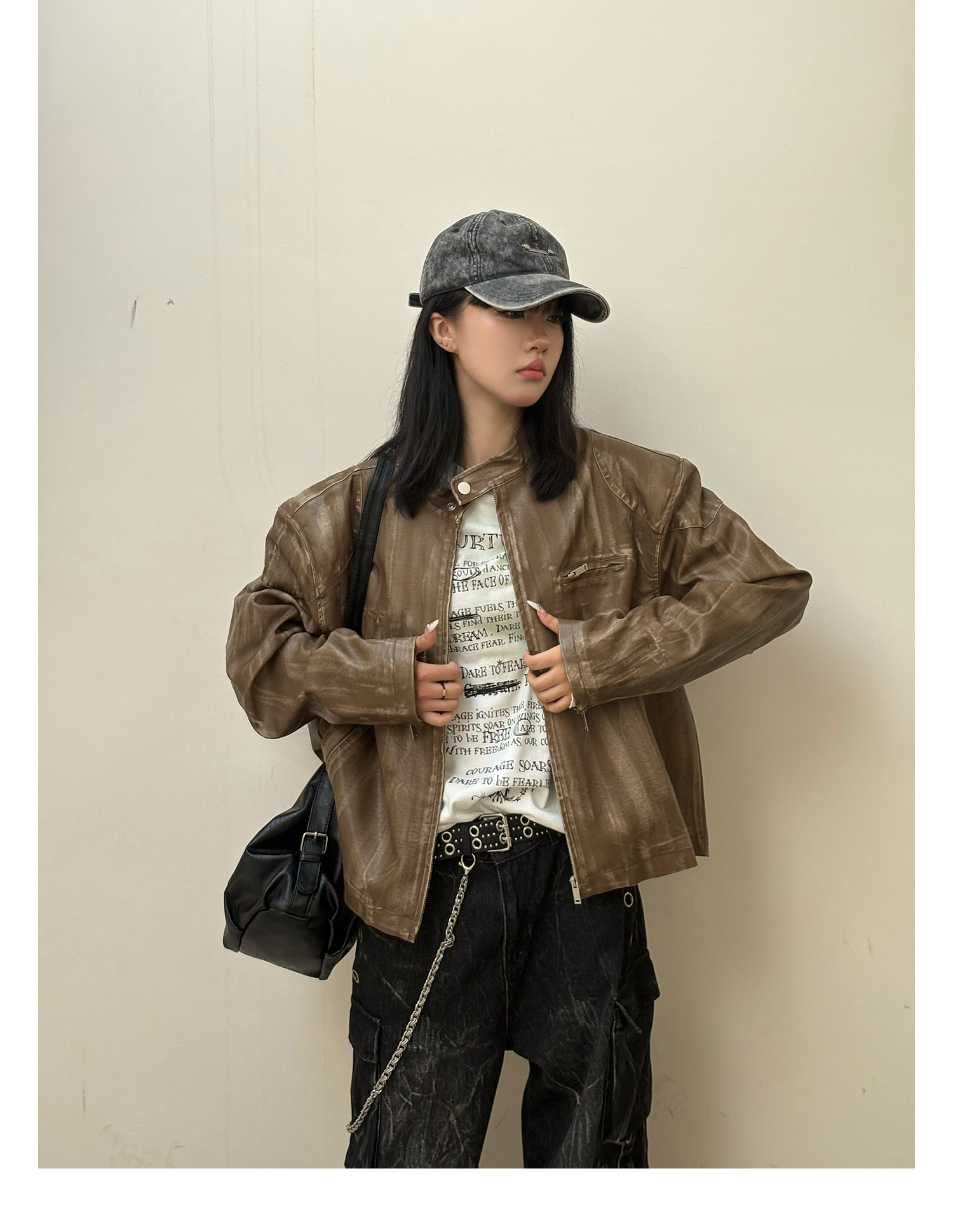 8Ff/25Ss Wang Xingyue Style American Retro Stand Collar Biker Jacket Loose Distressed Short Leather Jacket Trendy