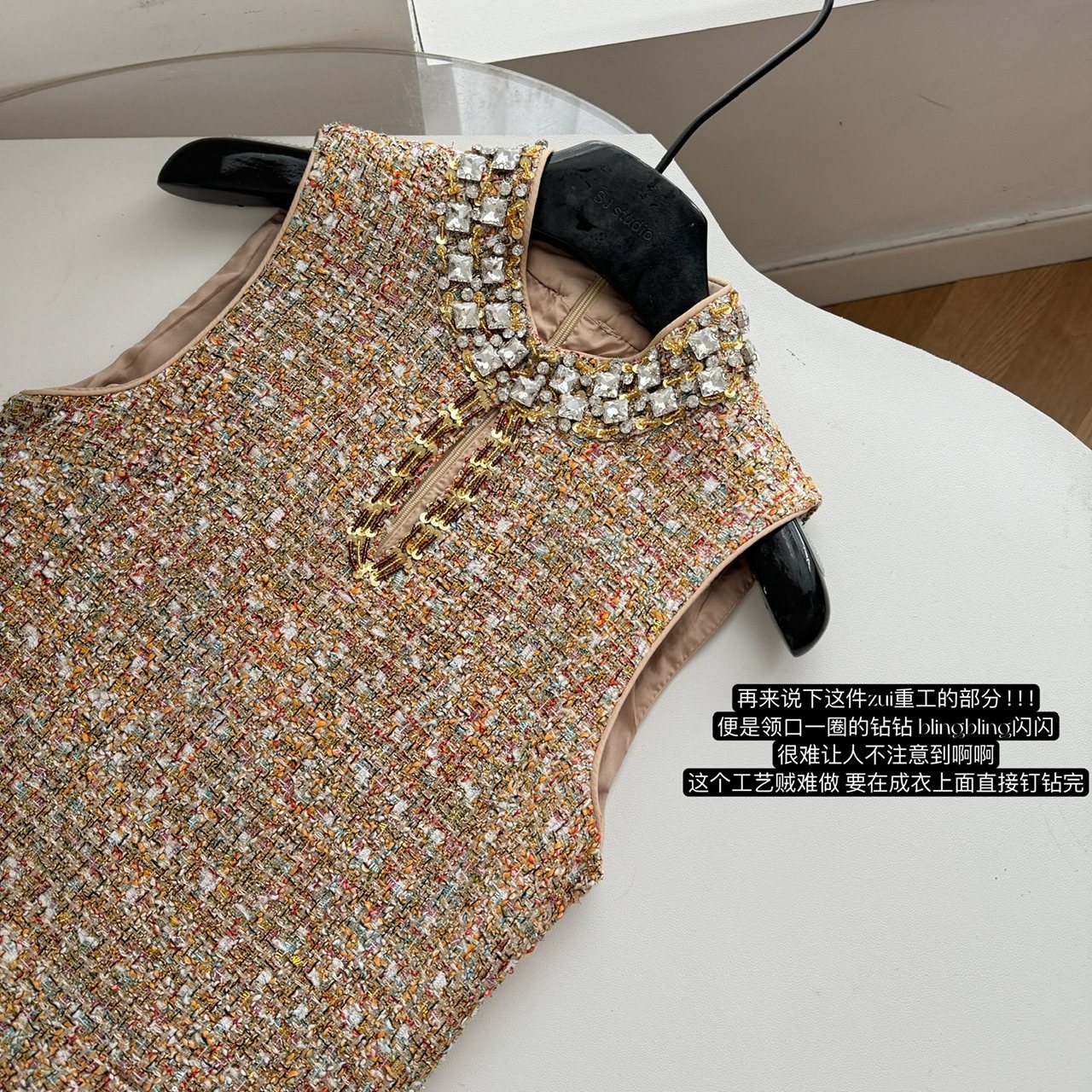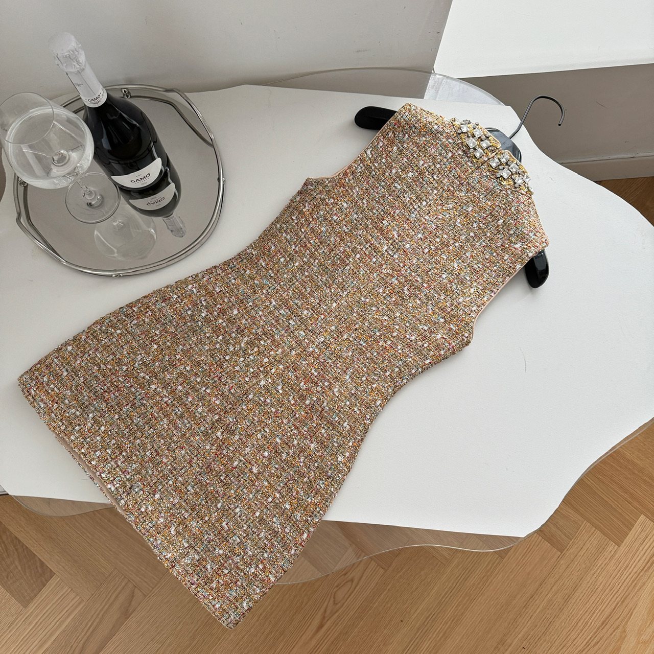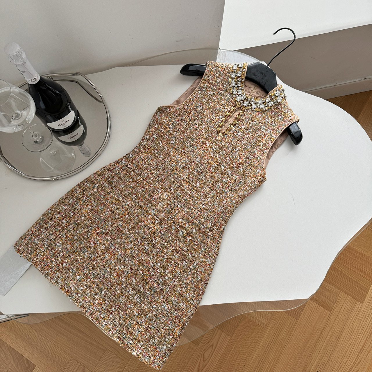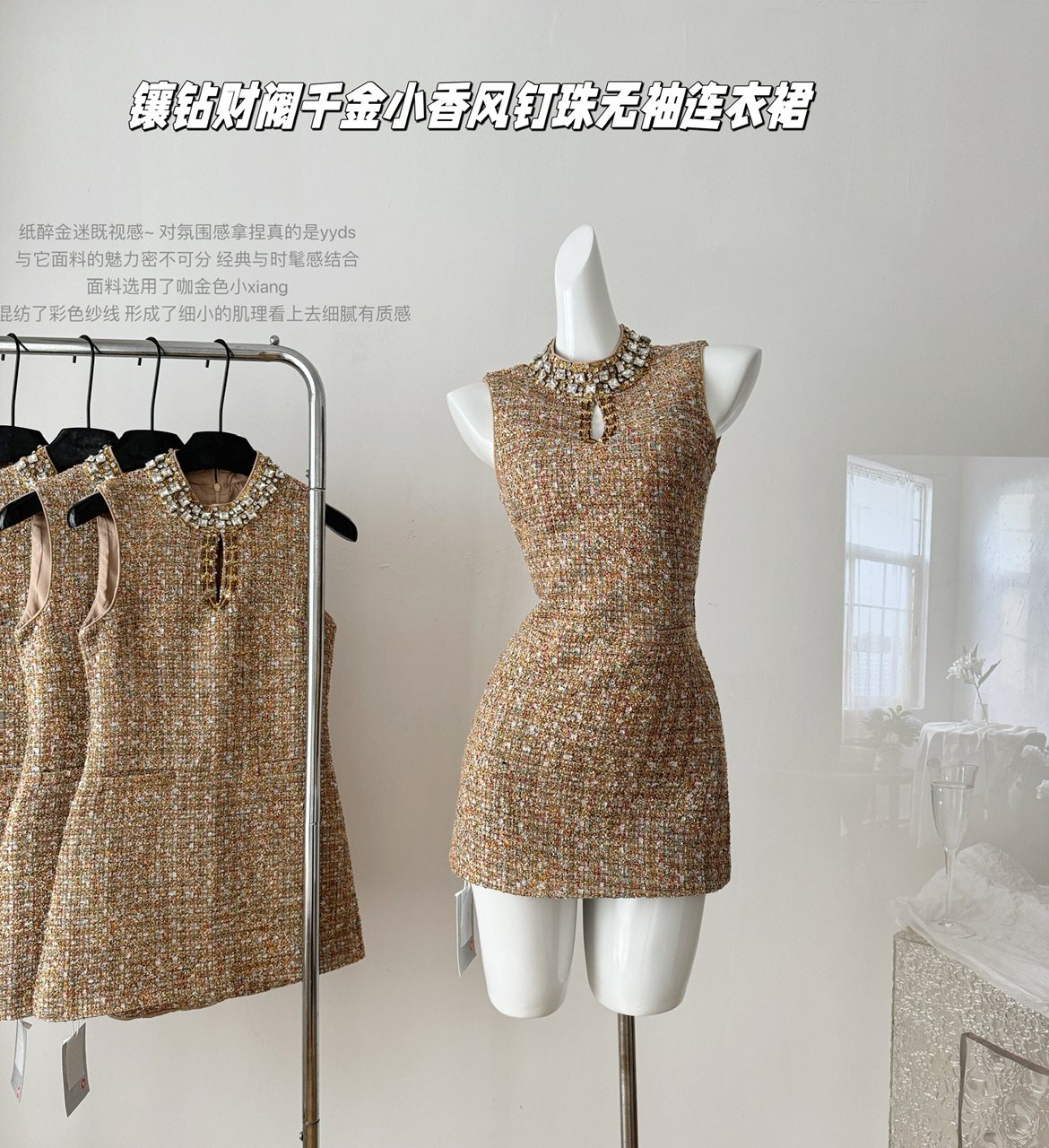Peach Blossom Handmade Heavy Rhinestone-Embellished Rich Heir Dress Summer Chanel-Style Beaded Waist-Cinching Sleeveless Dress for Women