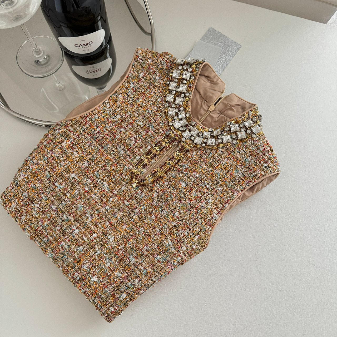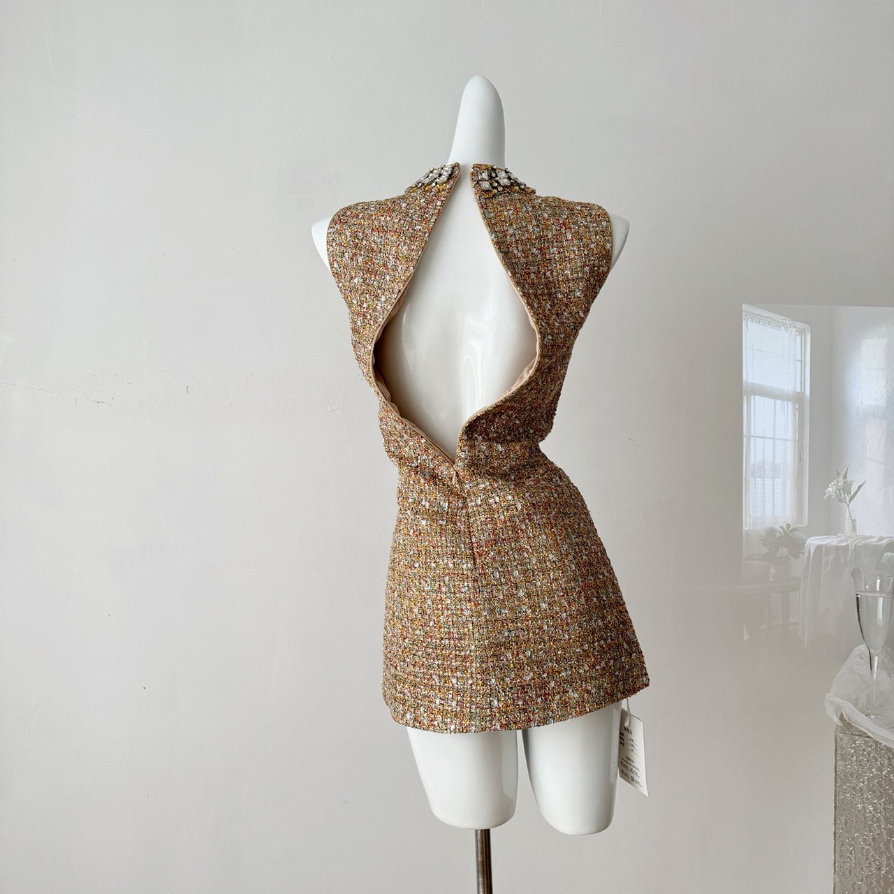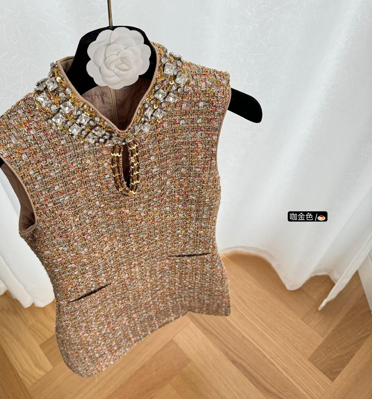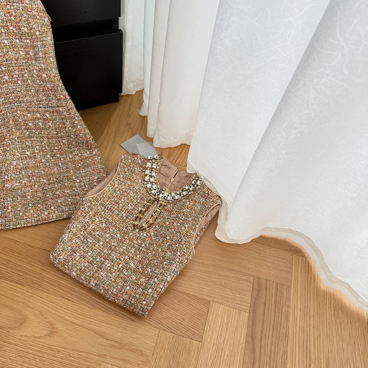 Peach Blossom Handmade Heavy Rhinestone-Embellished Rich Heir Dress Summer Chanel-Style Beaded Waist-Cinching Sleeveless Dress for Women