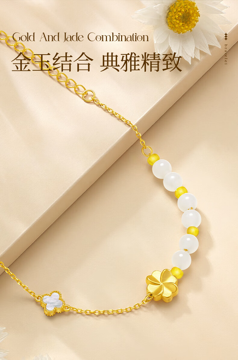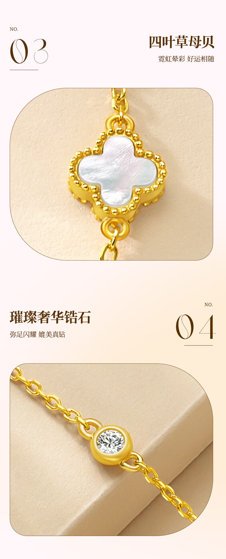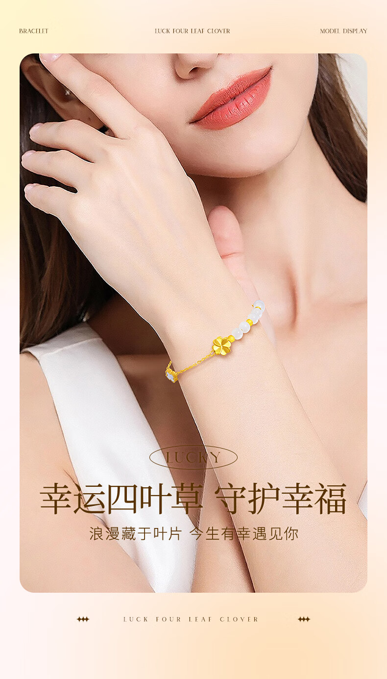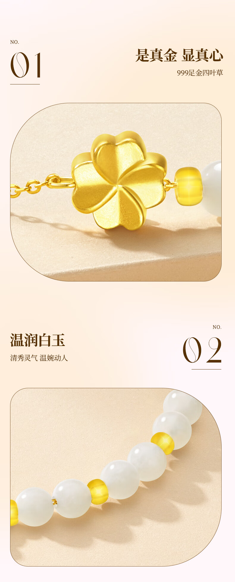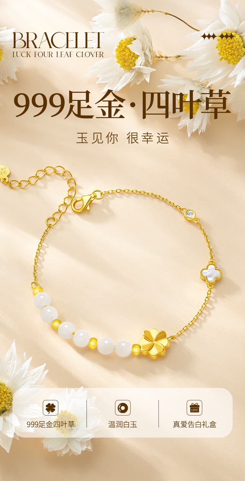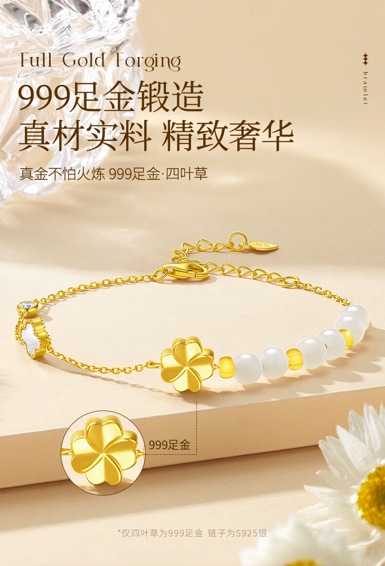 999 Pure Gold Four-Leaf Clover Gold Bracelet, Birthday Gift for Girls, Chinese Valentine's Day Gift for Girlfriend or Wife