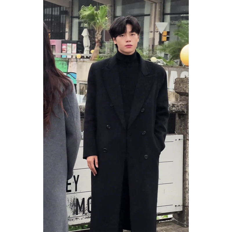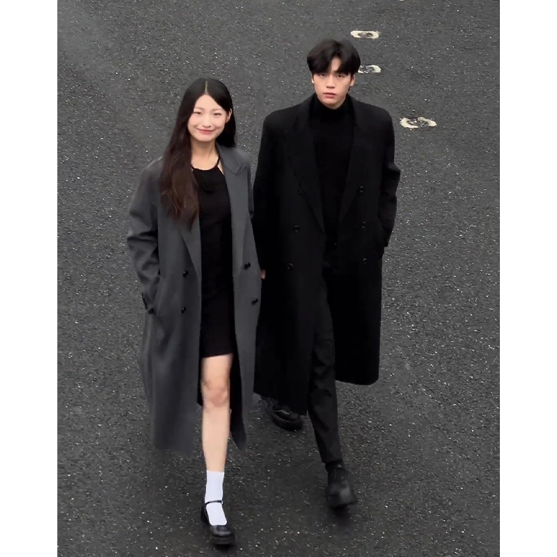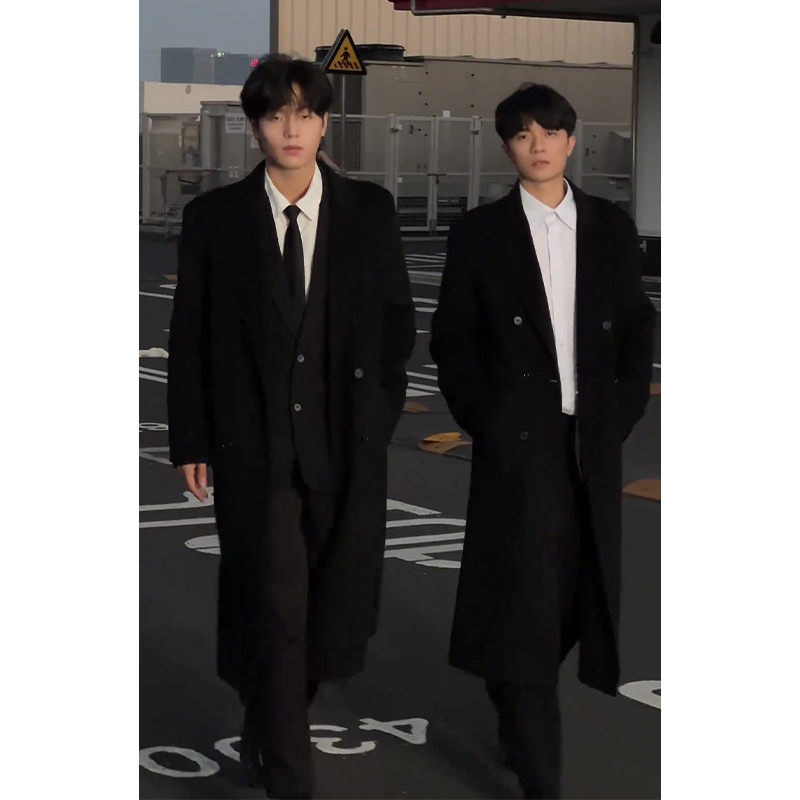 Black Woolen Coat for Men, Mid-Length, Spring and Autumn, Korean Style, Trendy Over-The-Knee Military Trench Coat, Lazy Style, High-End Feel Jacket