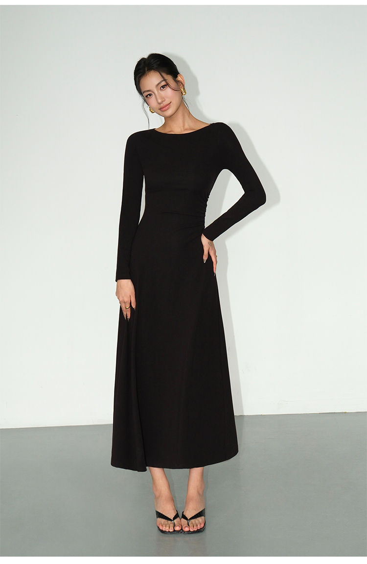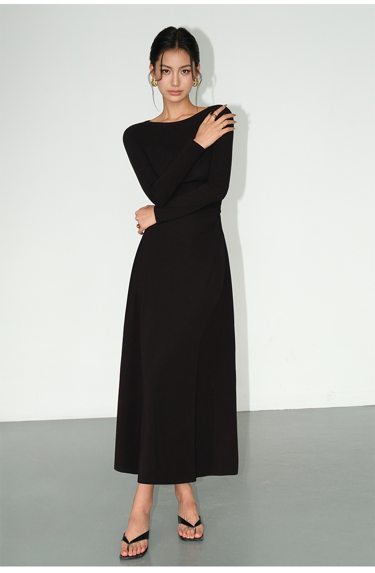 Neva Hu Black Long-Sleeved Slim-Fit Dress for Women, French-Style High-End Off-Shoulder Elegant Waist-Cinching Long Dress
