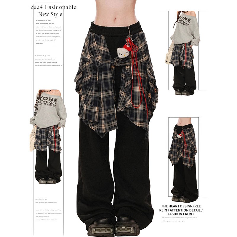 American Retro Patchwork Plaid Faux Two-Piece Pants for Women, New Loose Slimming Black Casual Sweatpants for Spring and Autumn