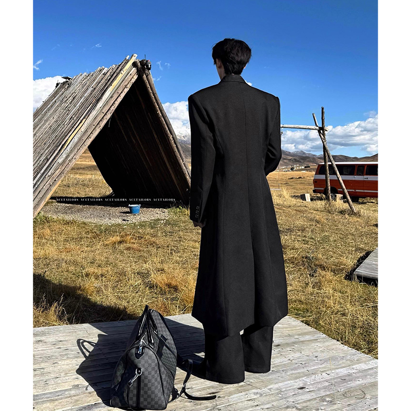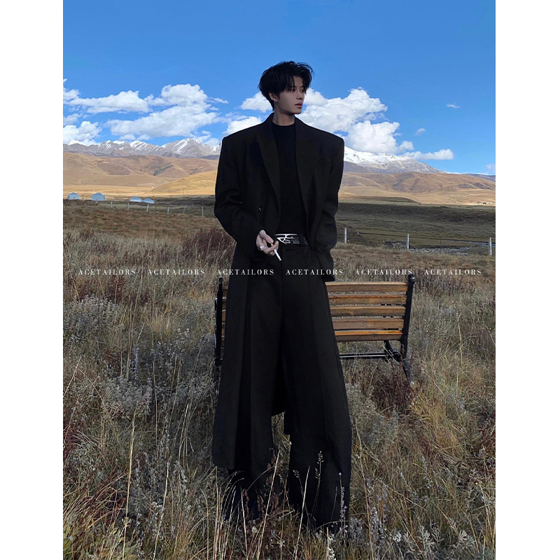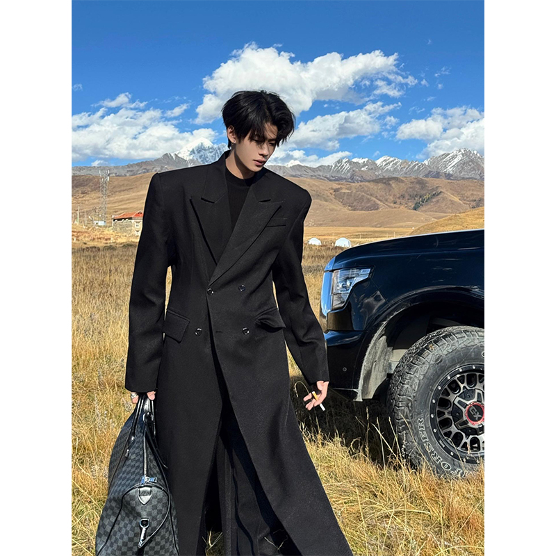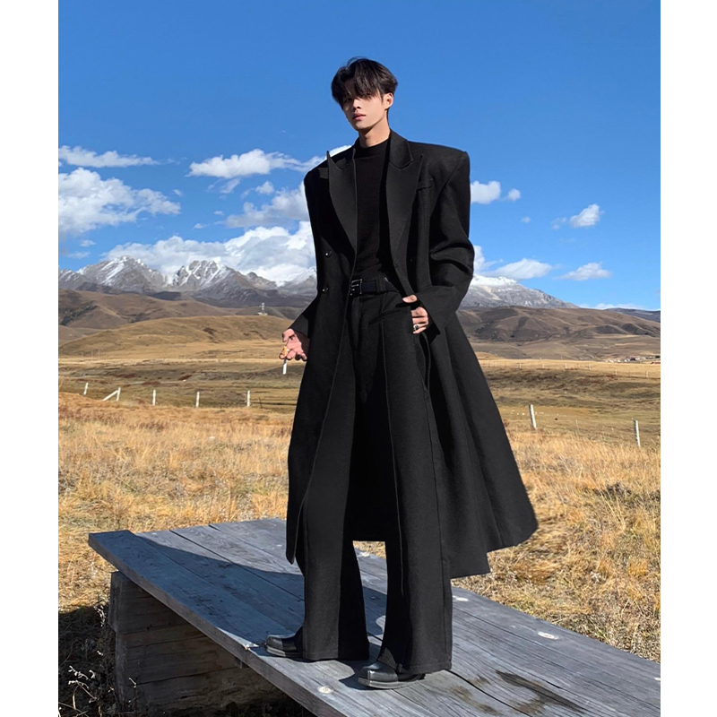 Black Mid-Length Woolen Coat for Men, Autumn and Winter, High-End Godfather Style Trench Coat, Korean Style Padded Shoulder Woolen Jacket