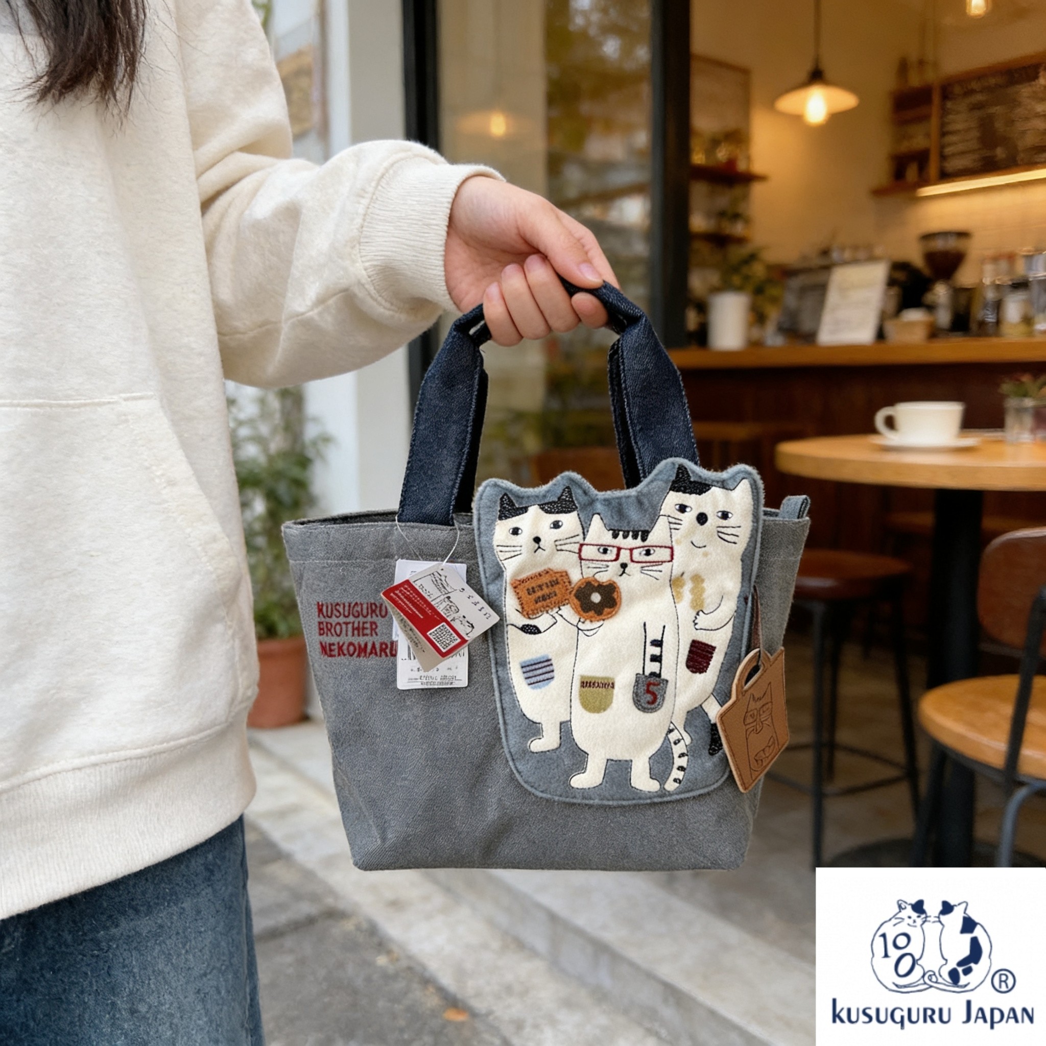 Japanese Original Kusuguru New Three-Dimensional Glasses Cat Embroidered Handbag Tote Bag with Lunch Bag 960