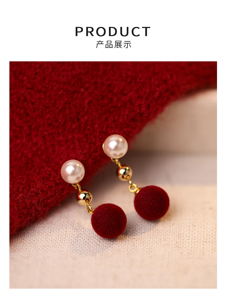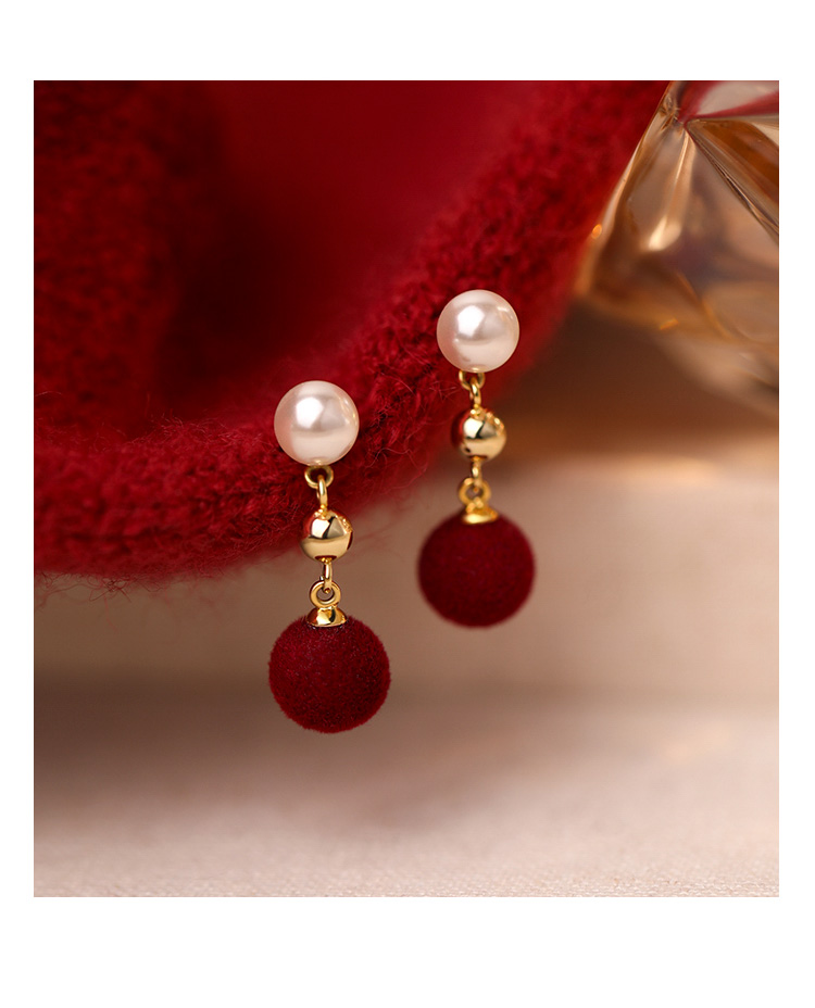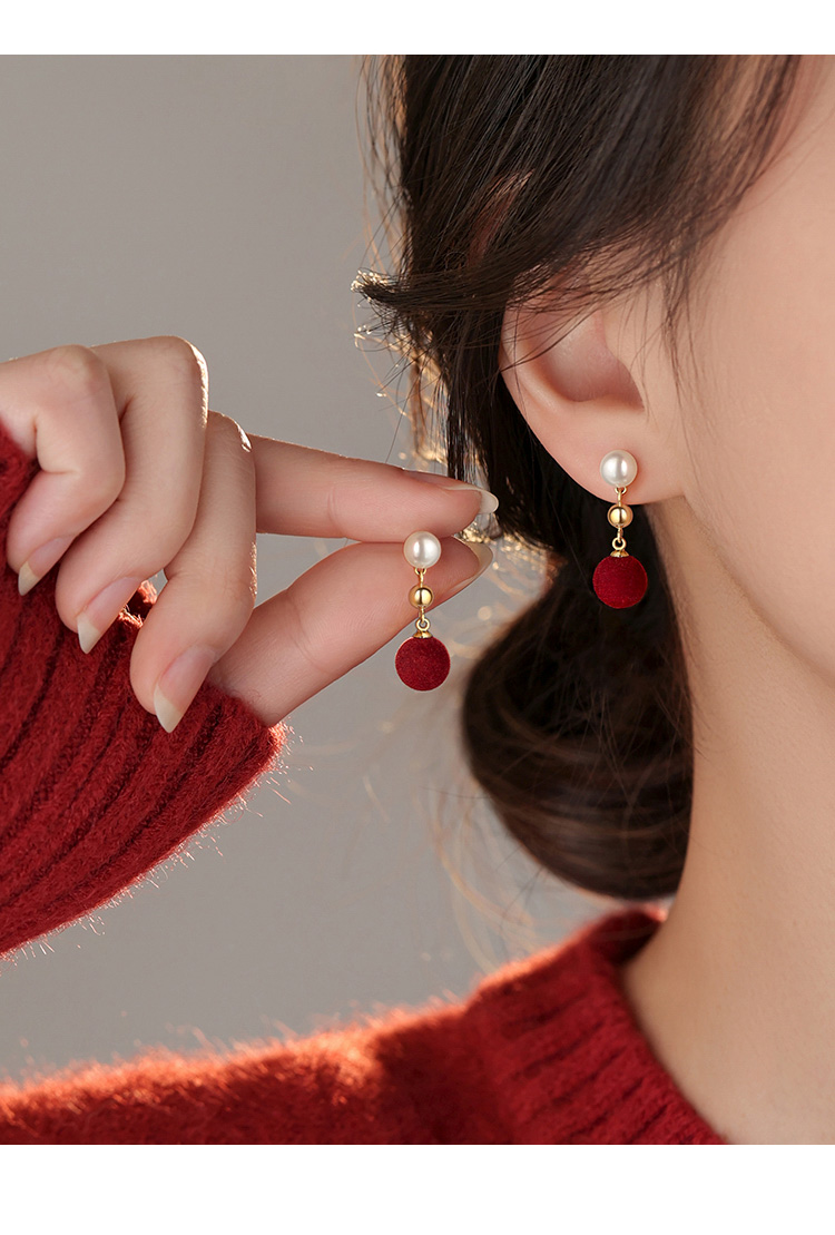 【Xiangnan】999 Silver Red Velvet Ball Pearl Earrings for Women in Their Zodiac Year 2025 Snake Year New Year Earrings Festive Ear Accessories