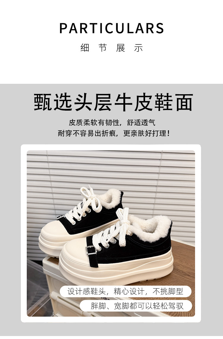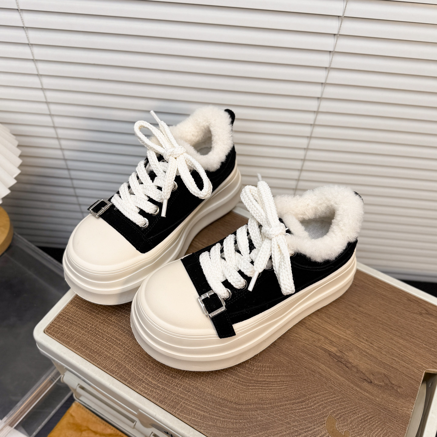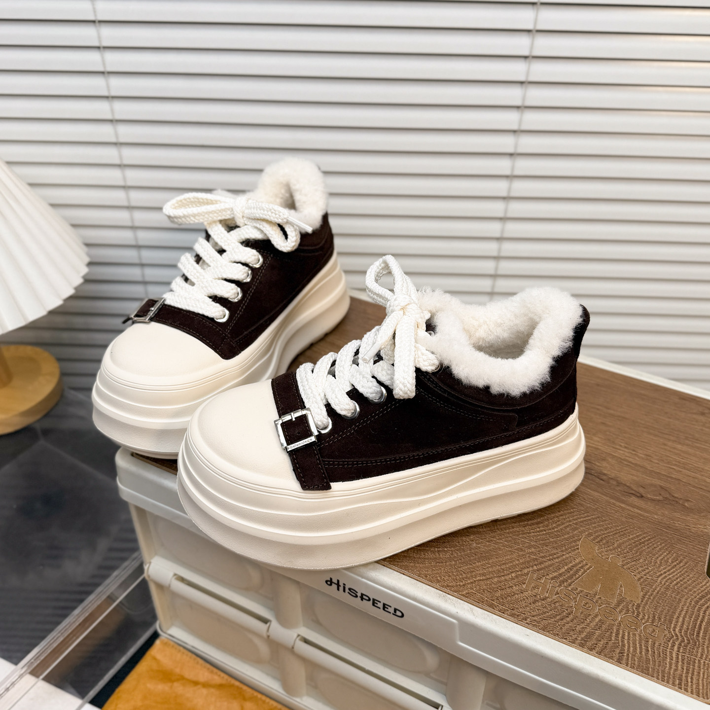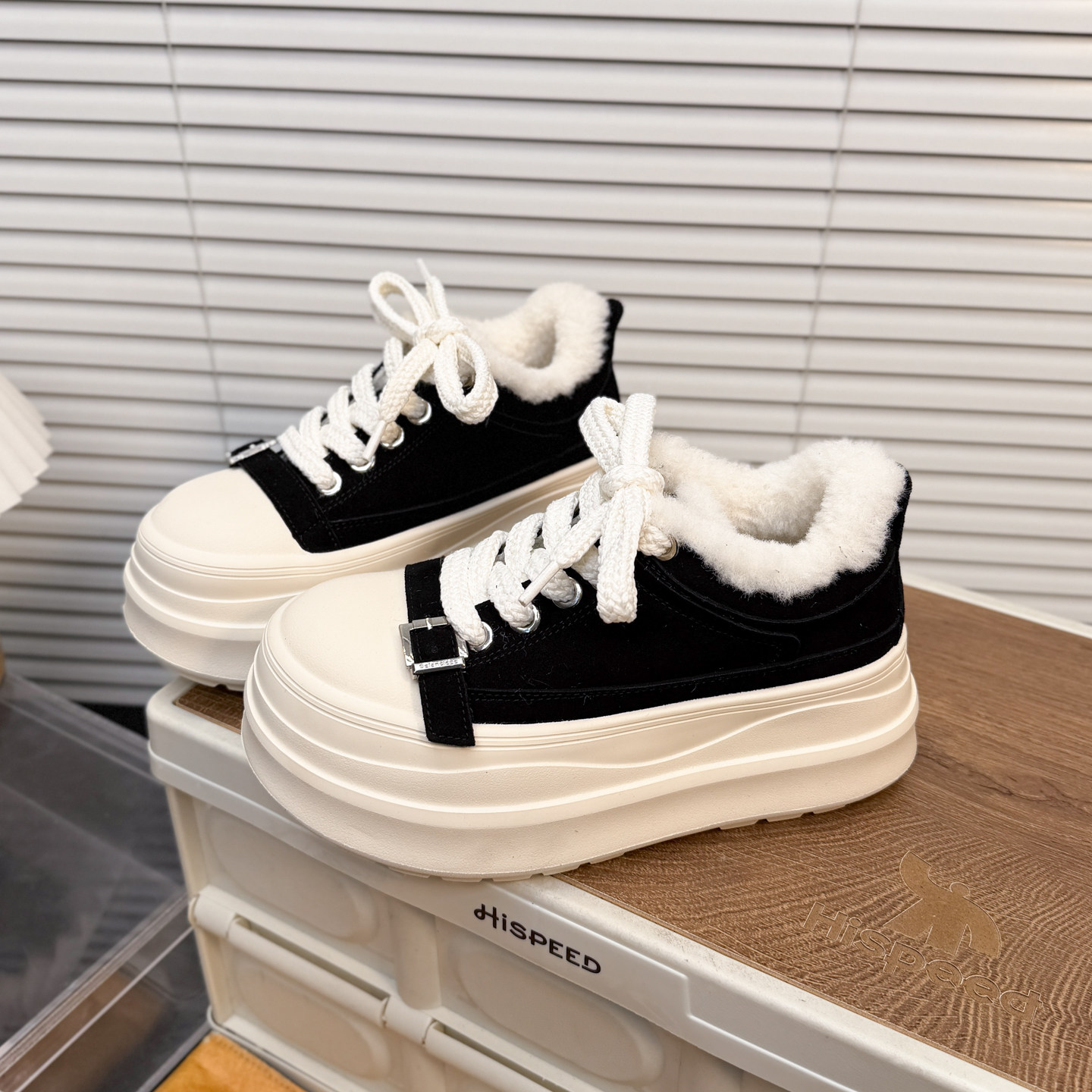 Hong Kong Retro Lamb Wool Thick-Soled Height-Increasing Sneakers for Women, Winter Genuine Leather Fleece-Lined Casual Warm Cotton Shoes, Versatile Furry Shoes