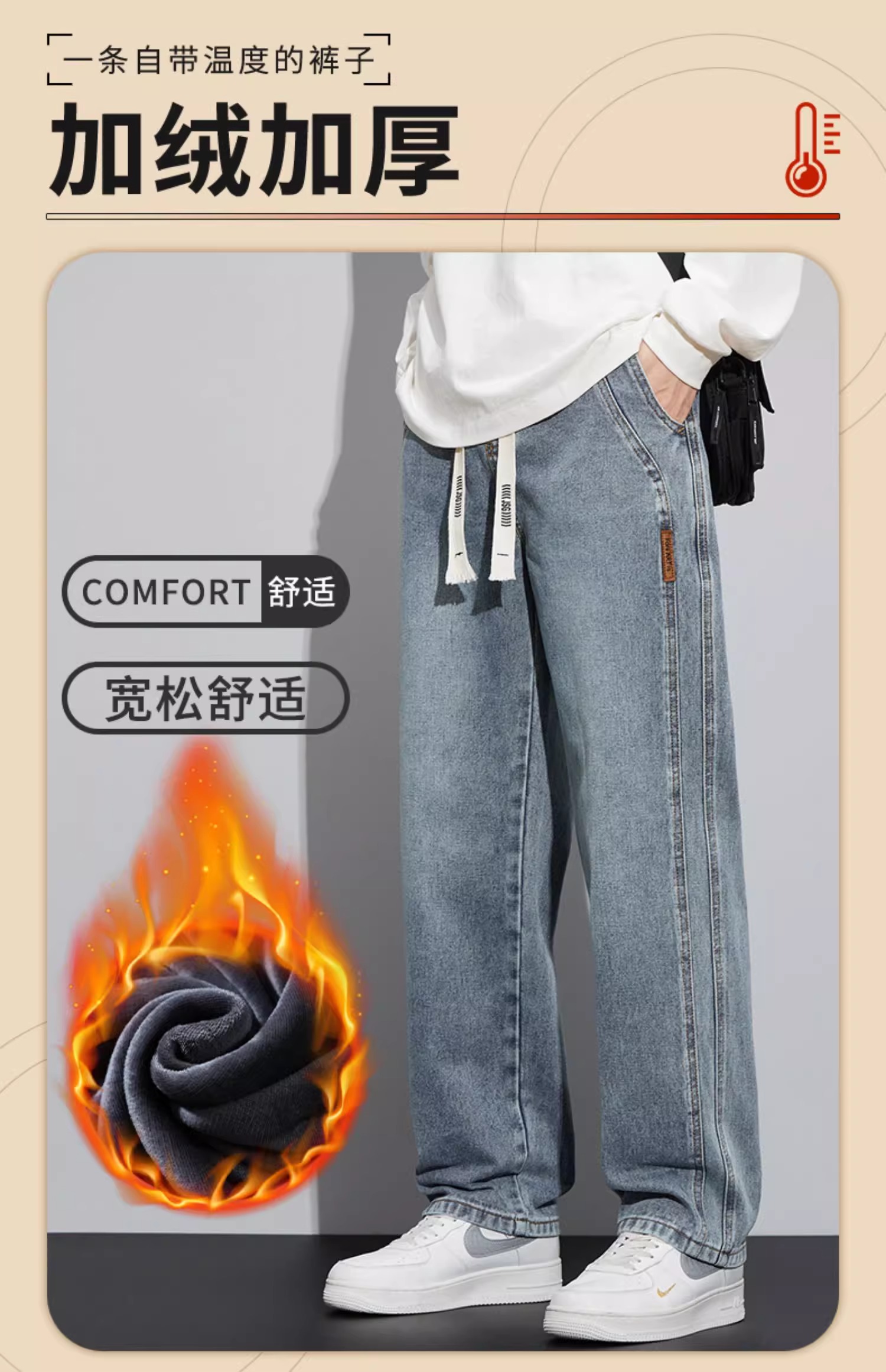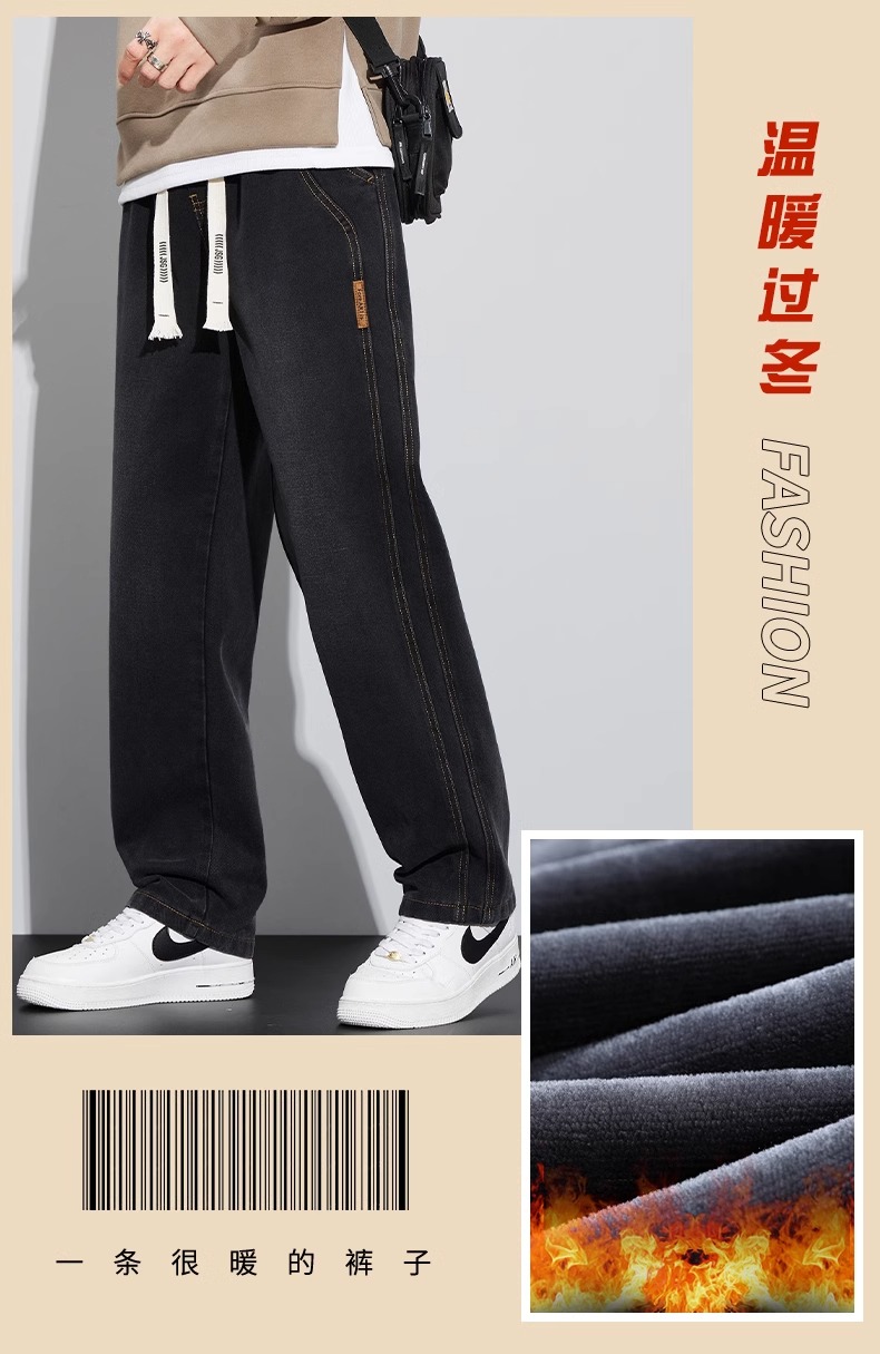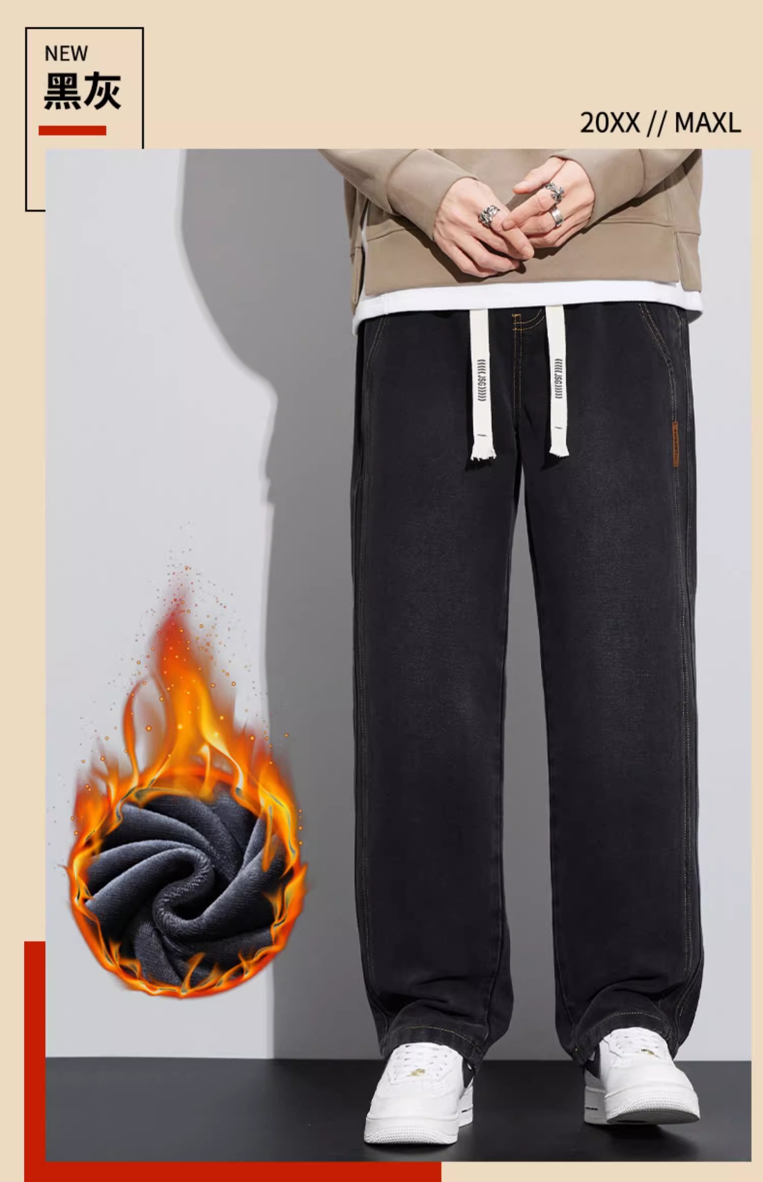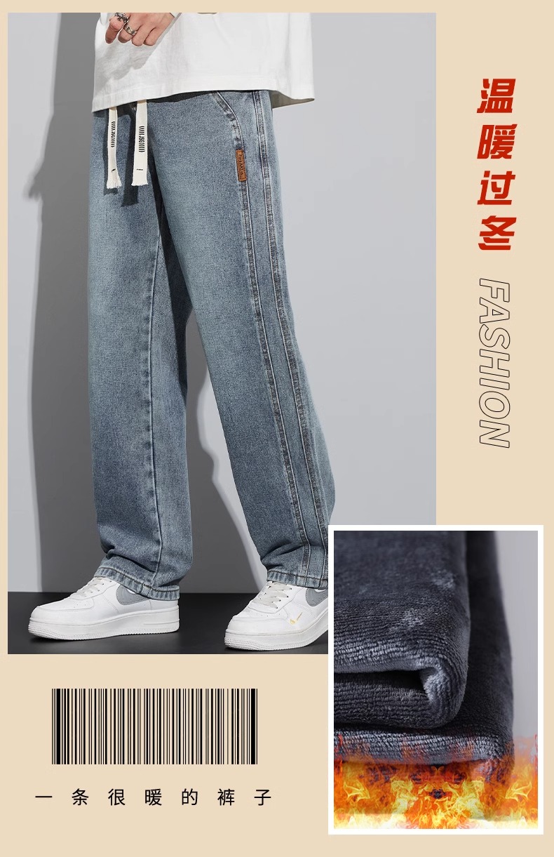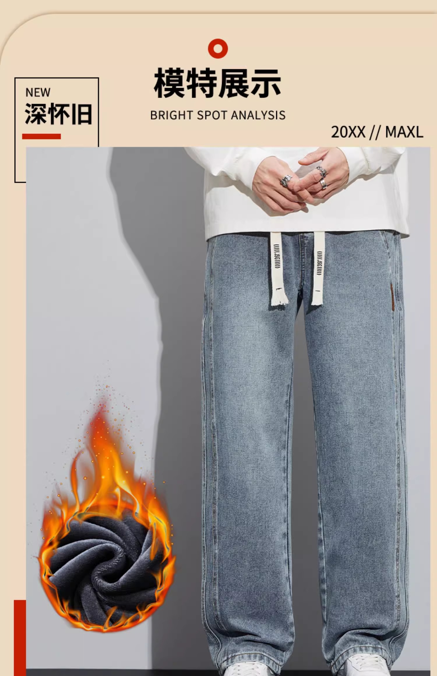 Woodpecker Brand Autumn and Winter Loose Straight-Leg Fleece-Lined Thick Jeans for Men, American High Street Workwear Casual Long Pants