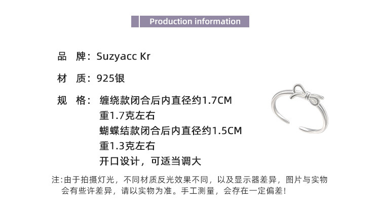Suzyacc Kr Simple and Versatile High-End Sterling Silver Bowknot Slim Ring Niche Design Index Finger Ring