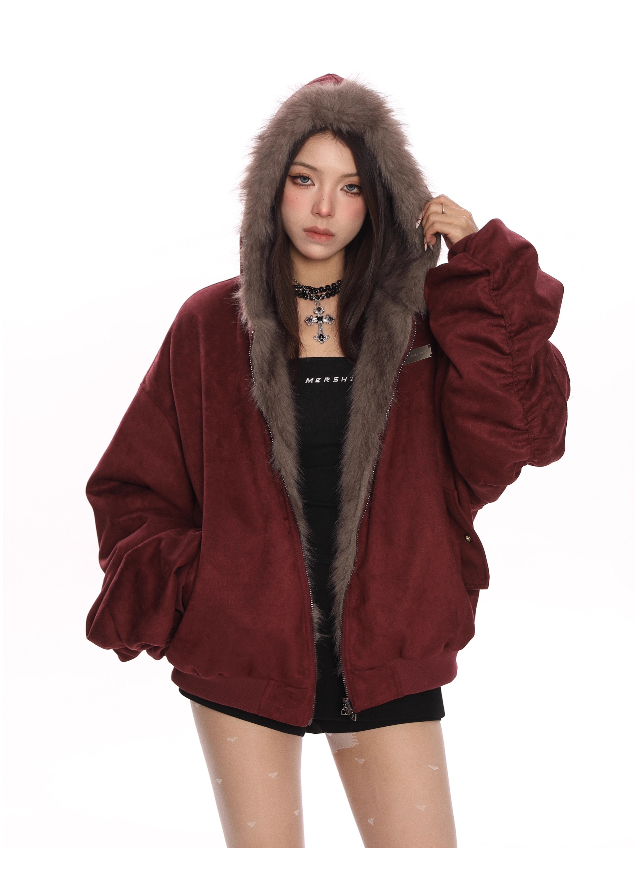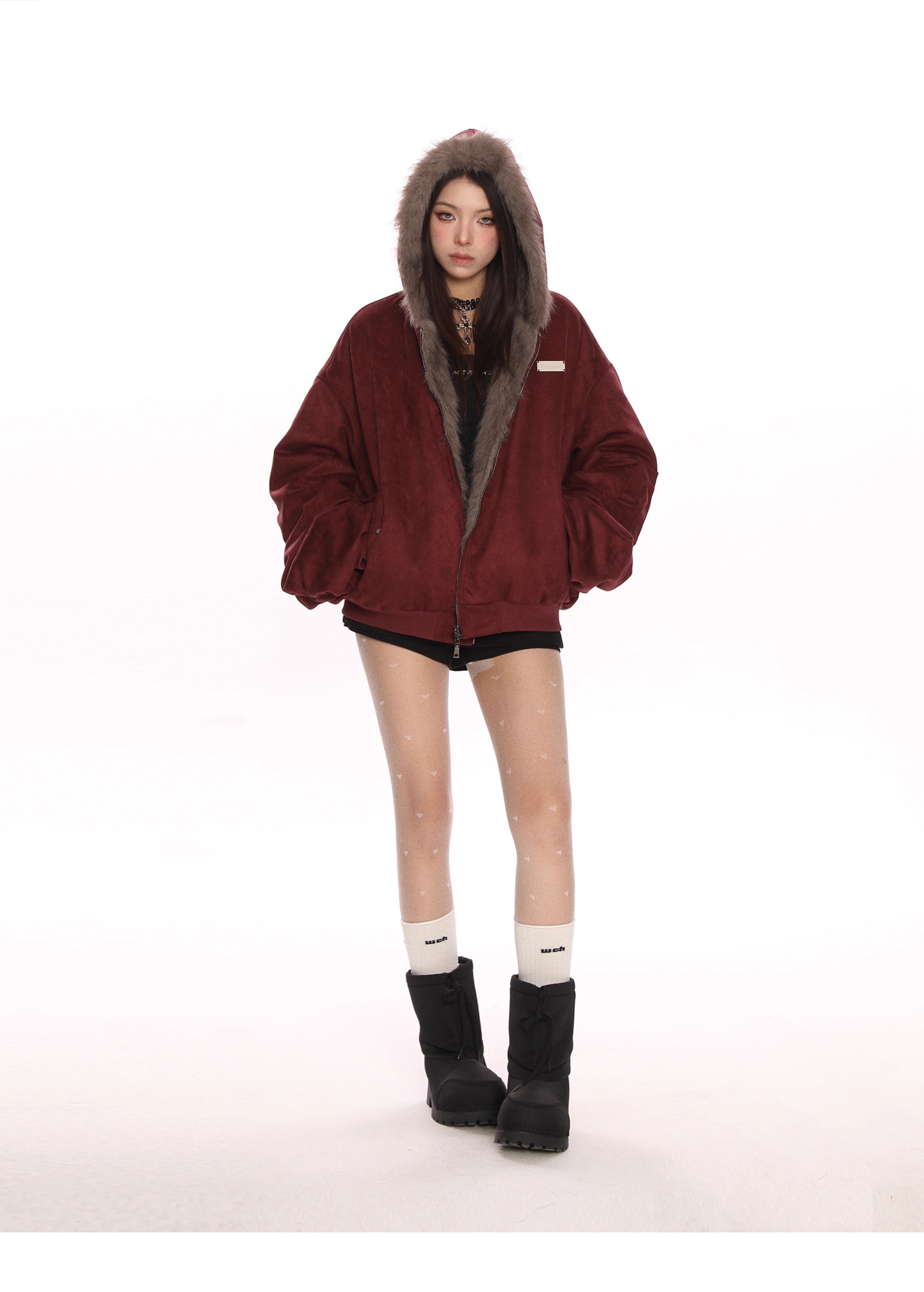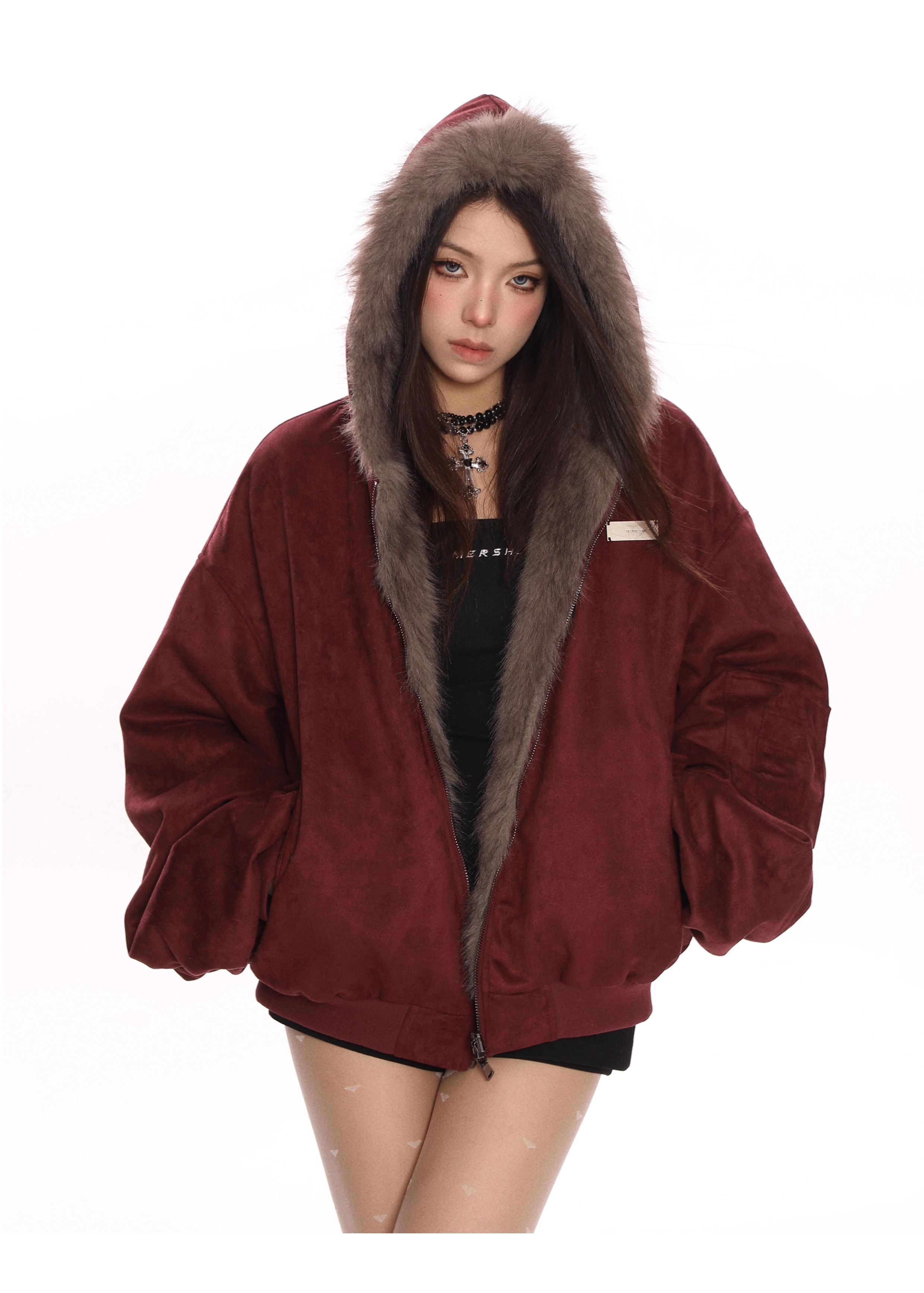 Biggold Burgundy Suede Eco-Friendly Fur Reversible Cotton Jacket for Women Winter Thickened Warm Cotton Coat