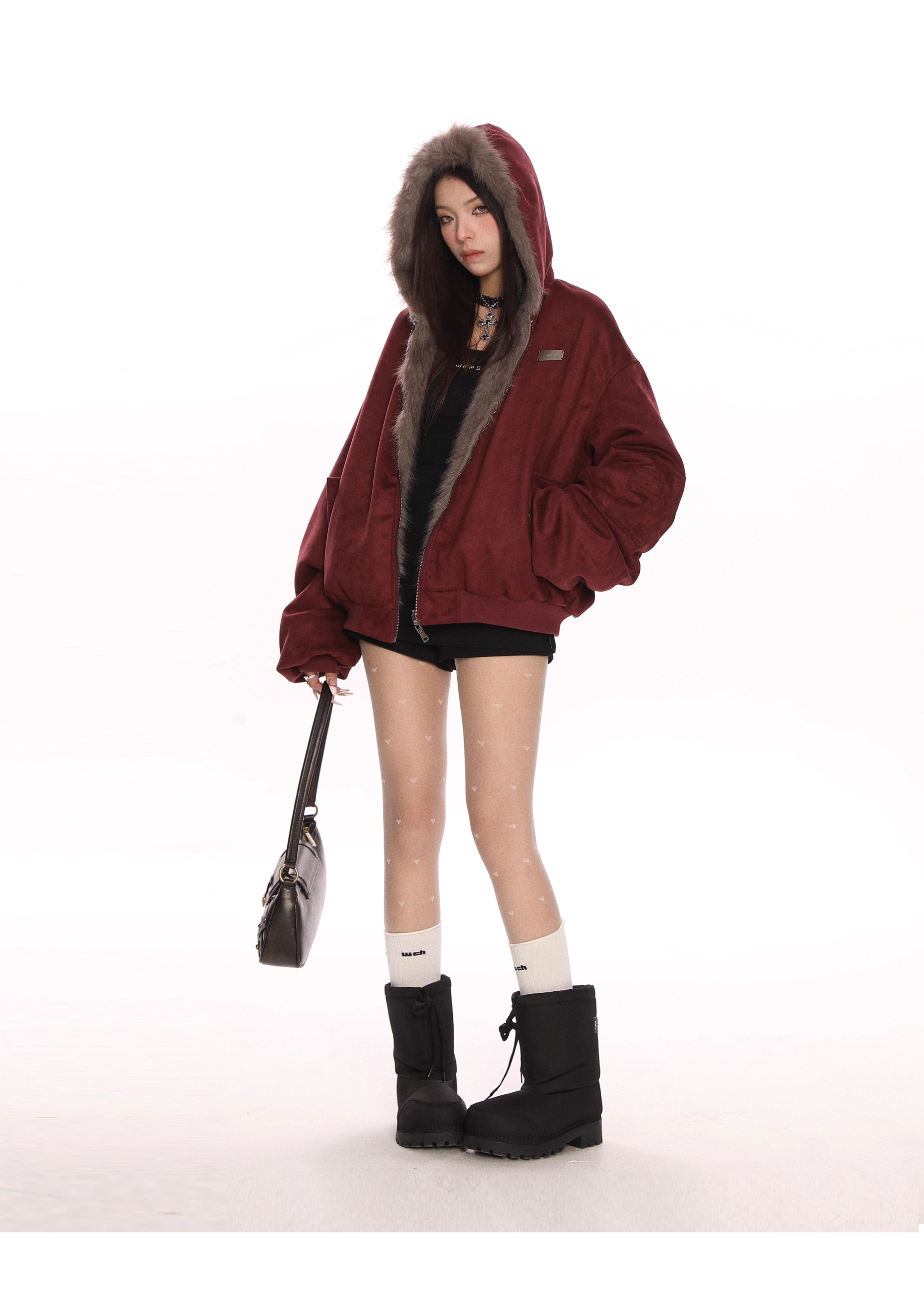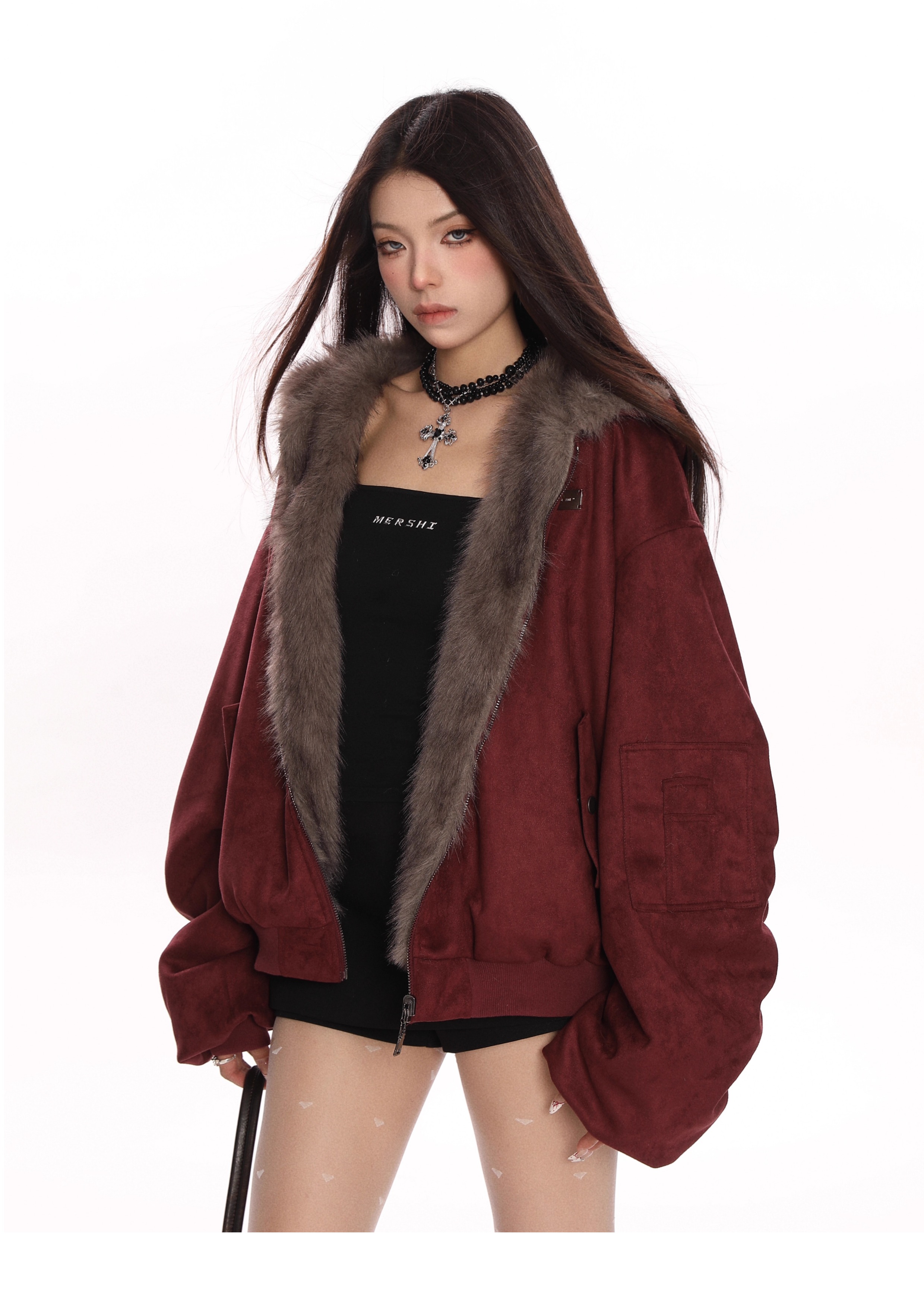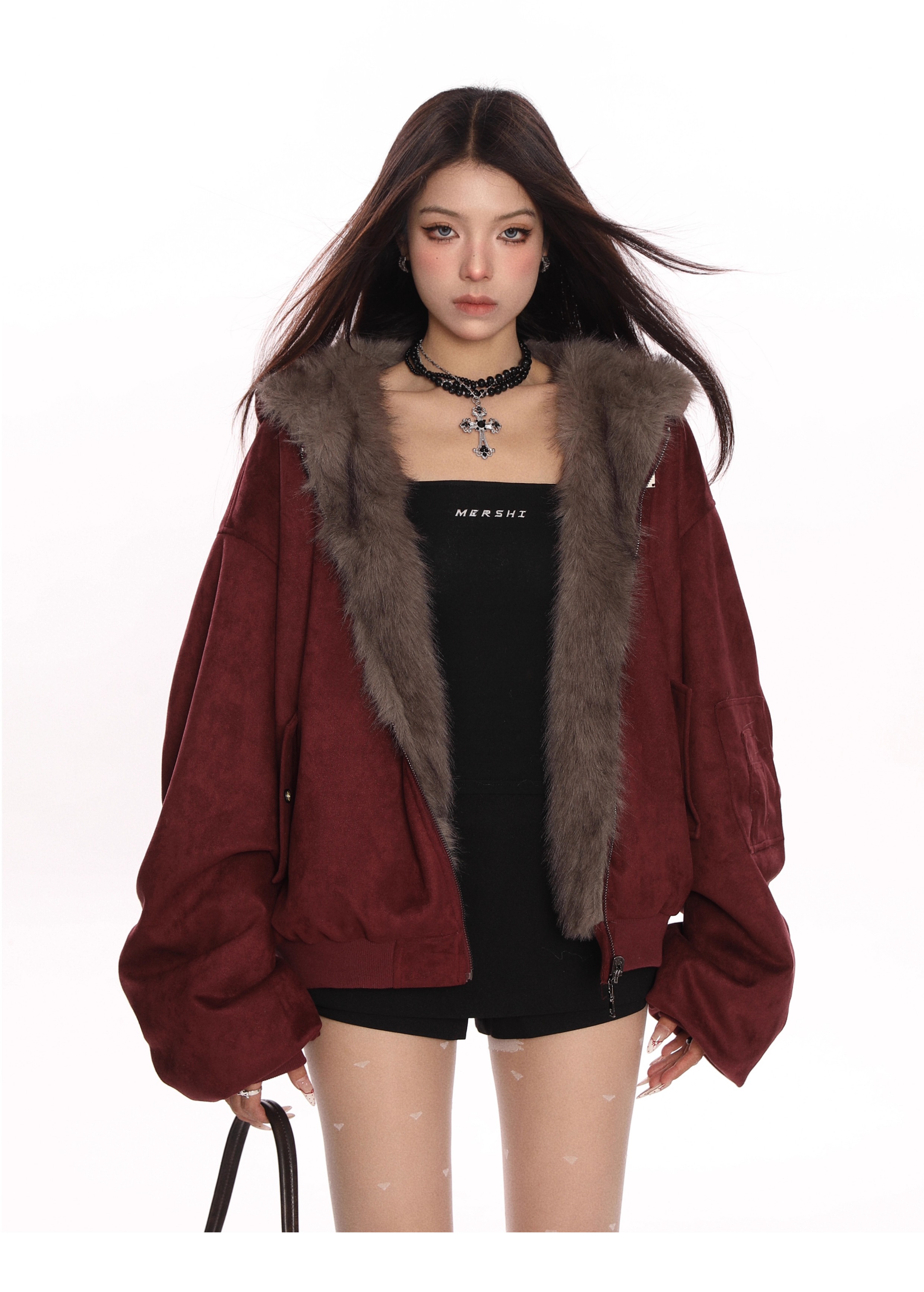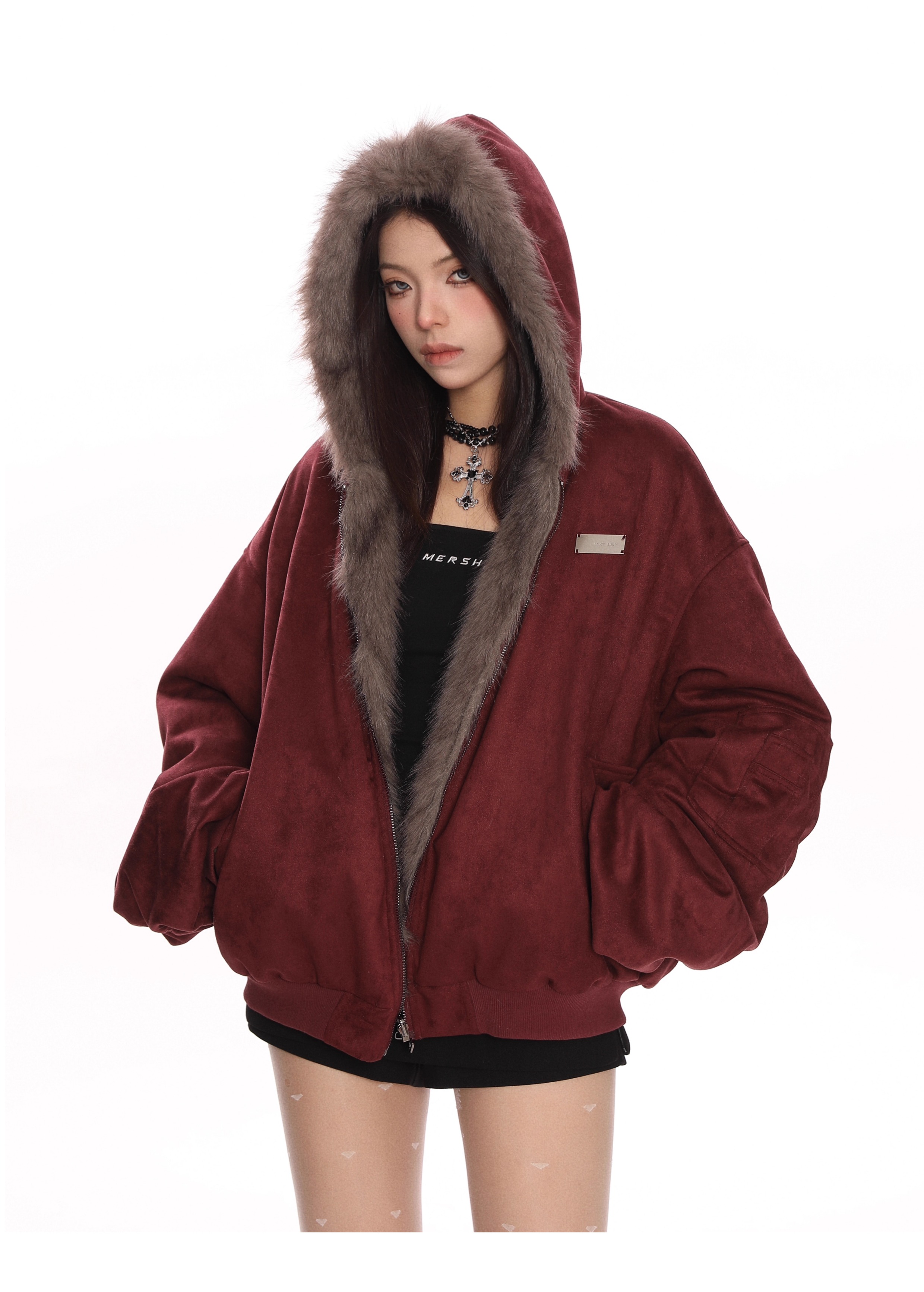 Biggold Burgundy Suede Eco-Friendly Fur Reversible Cotton Jacket for Women Winter Thickened Warm Cotton Coat