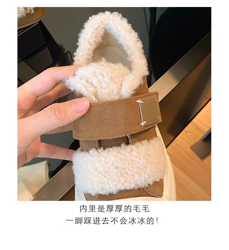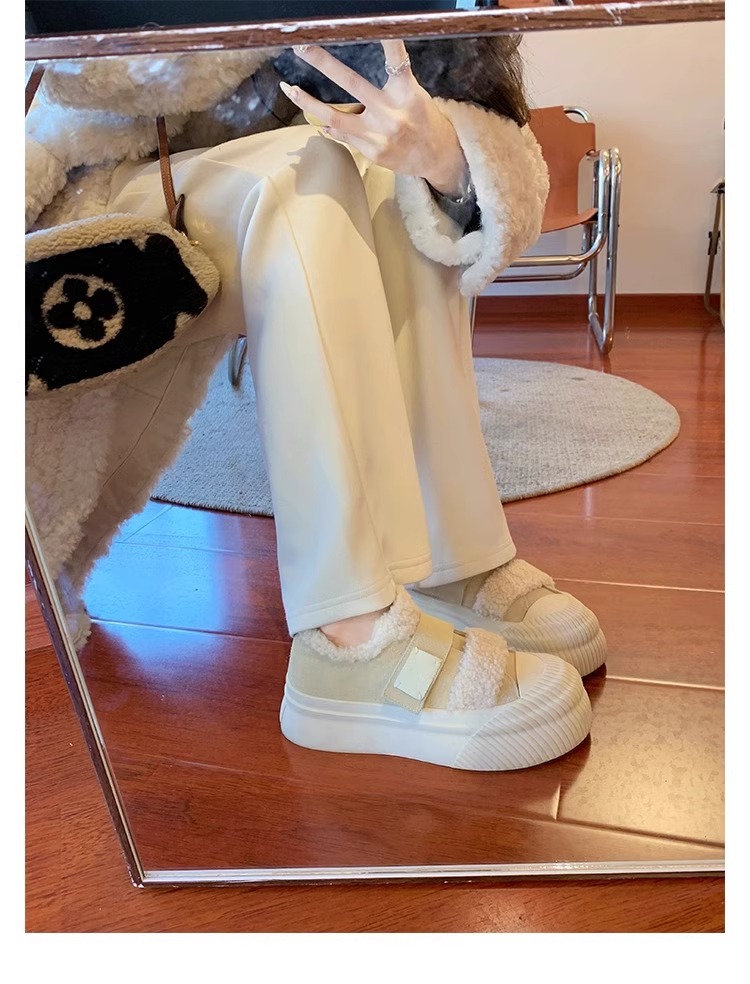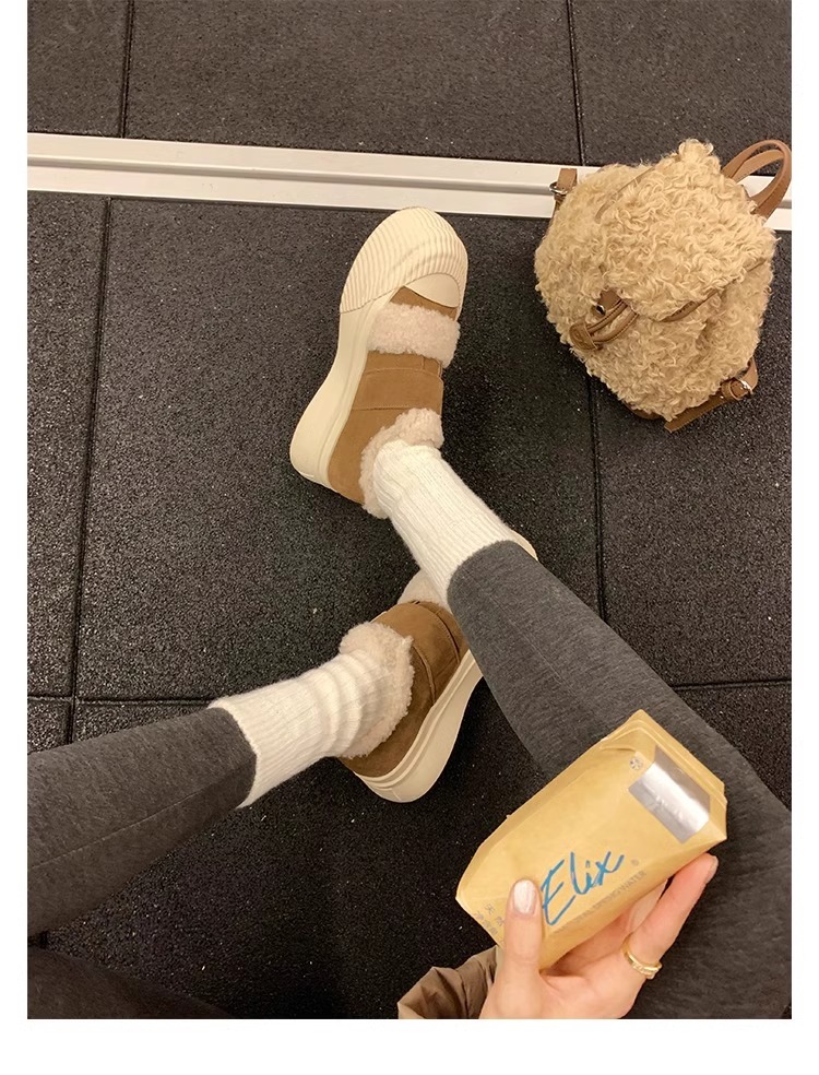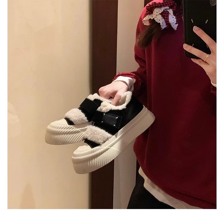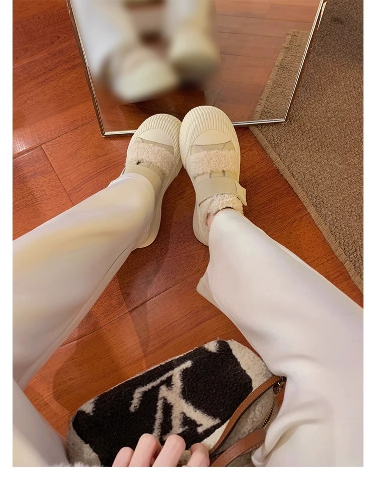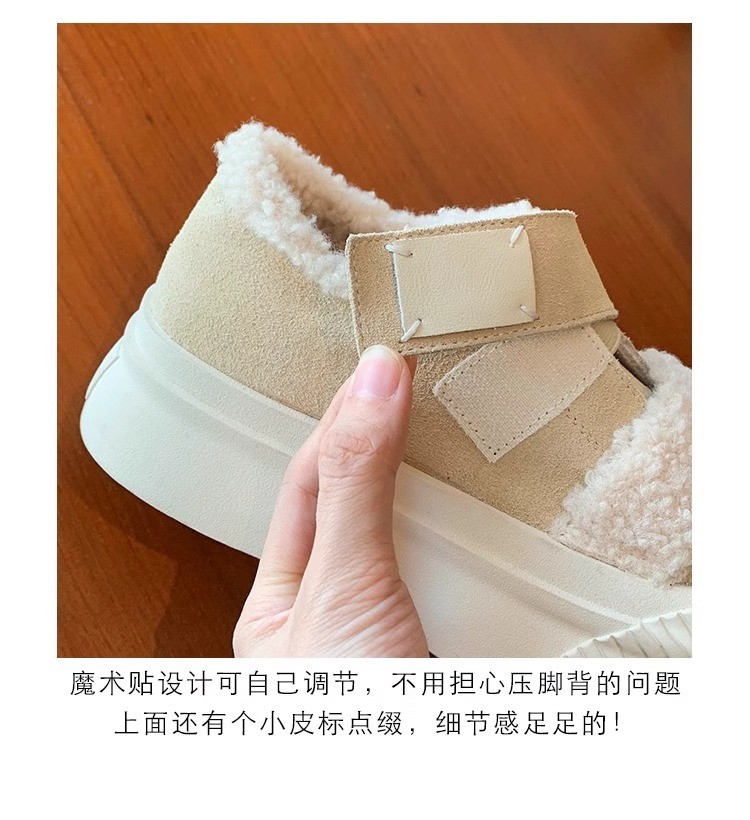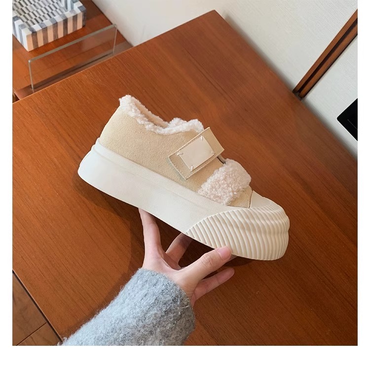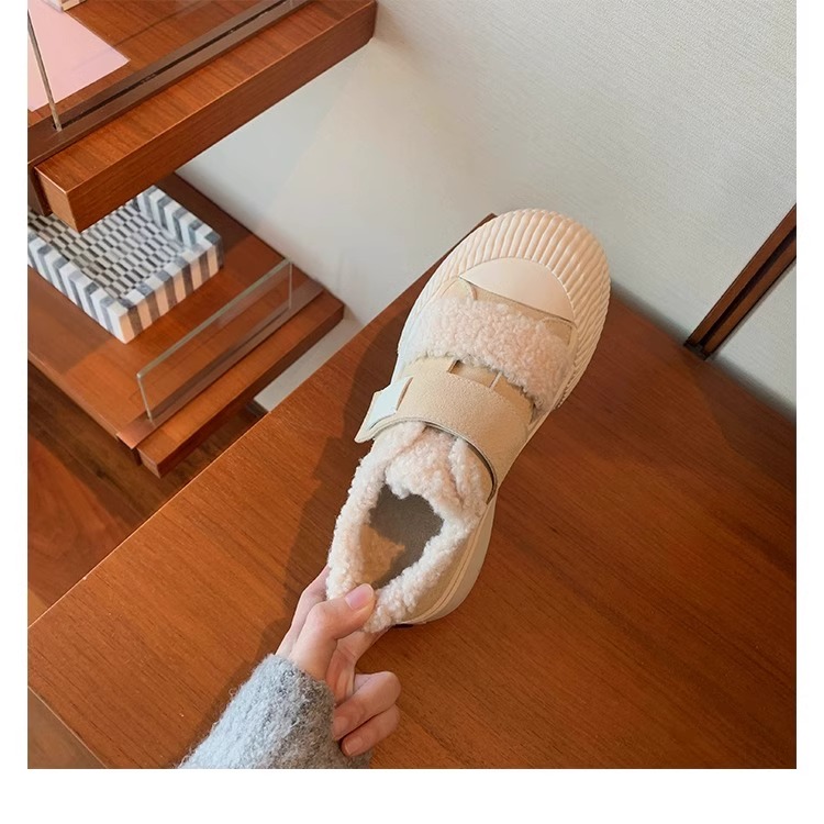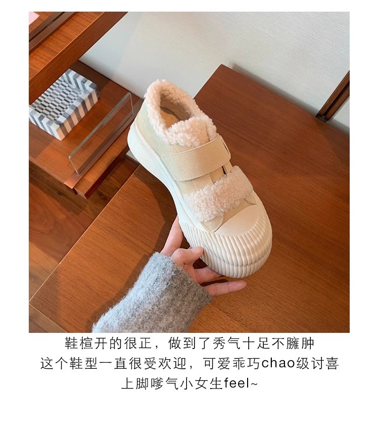 Hong Kong Korean Style Genuine Leather Thick-Soled Furry Shoes for Women 2025 Winter New Versatile Fleece-Lined Warm Casual Sneakers with Velcro