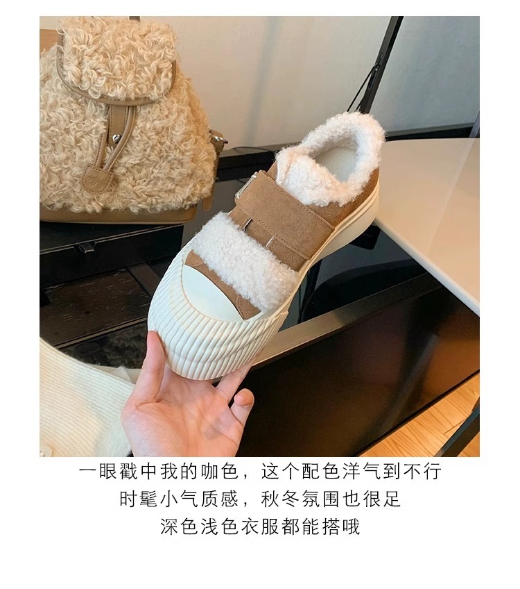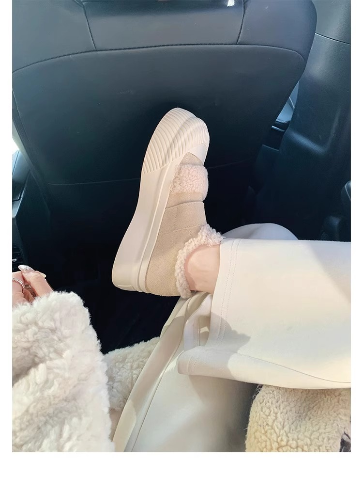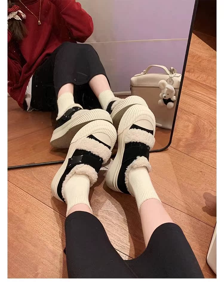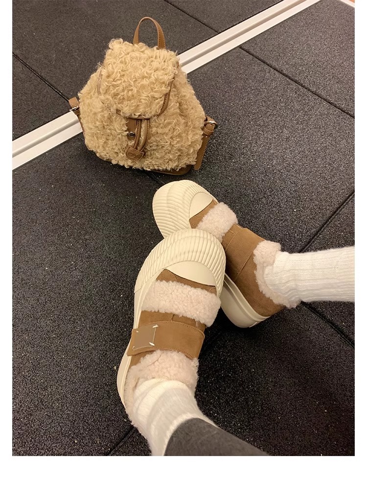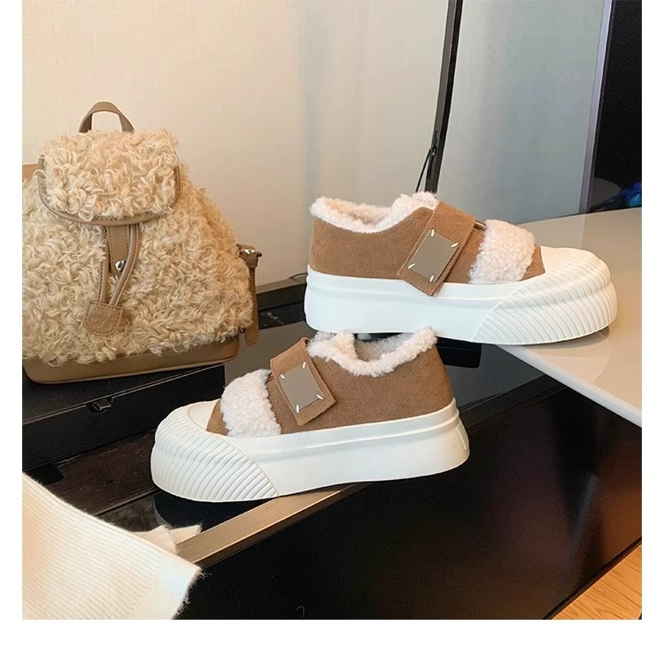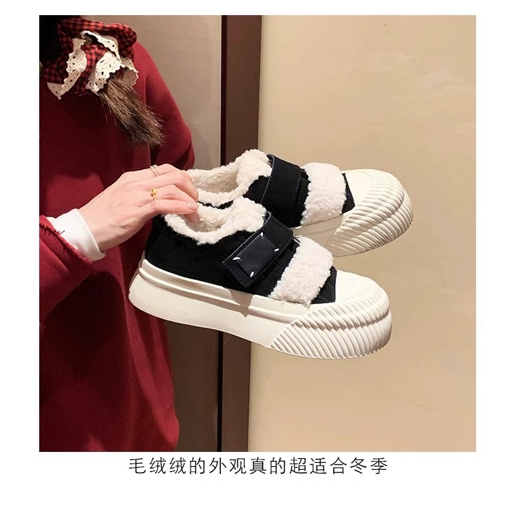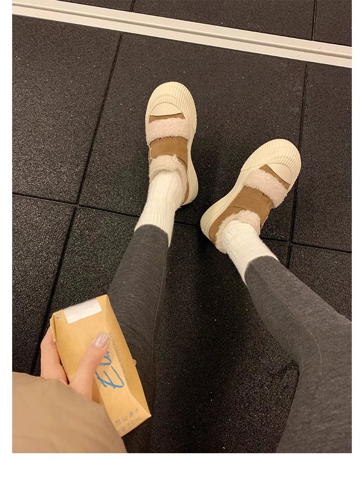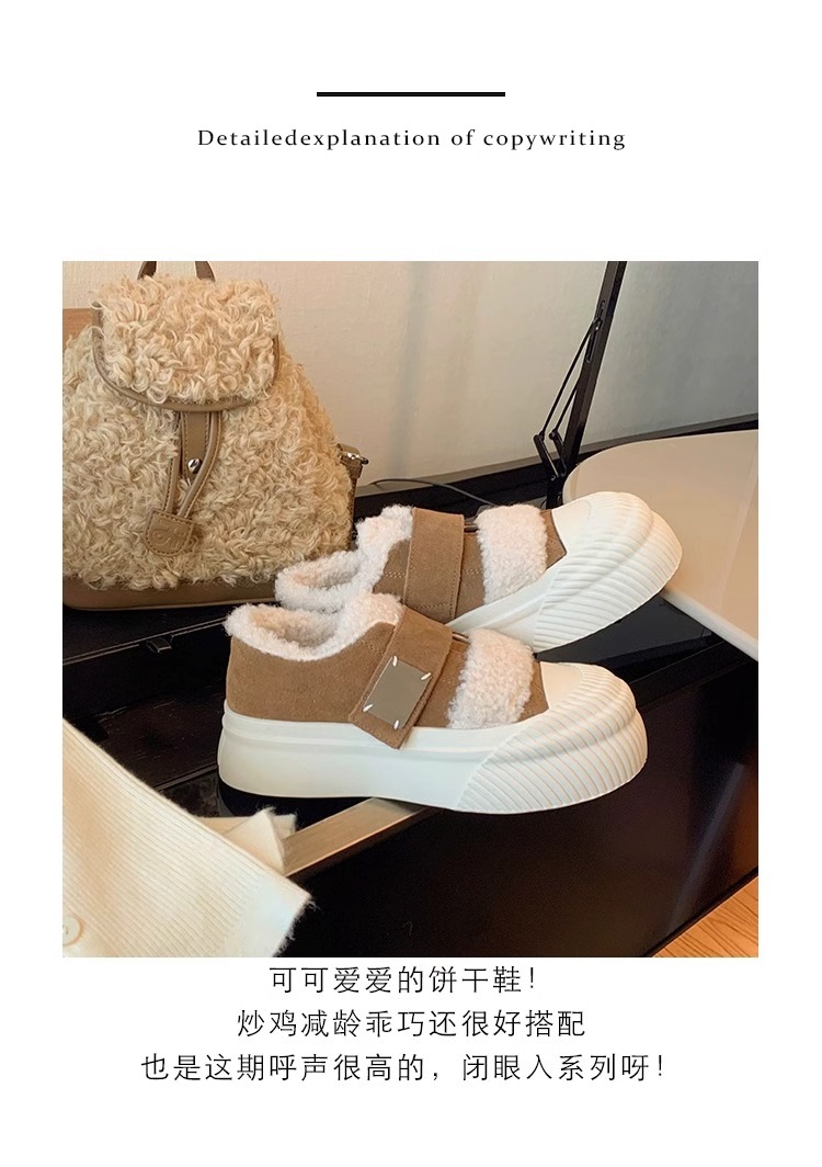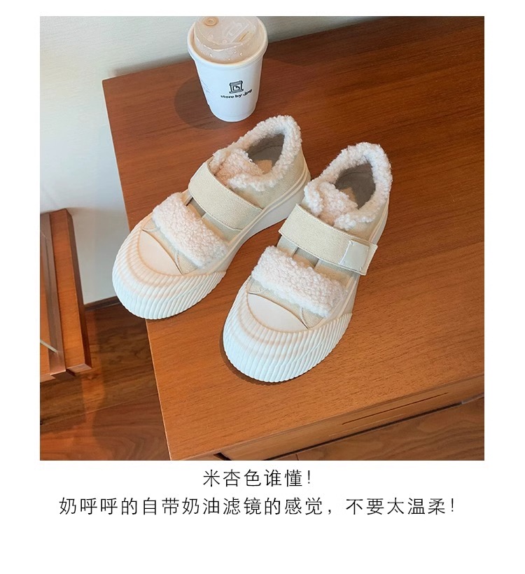 Hong Kong Korean Style Genuine Leather Thick-Soled Furry Shoes for Women 2025 Winter New Versatile Fleece-Lined Warm Casual Sneakers with Velcro