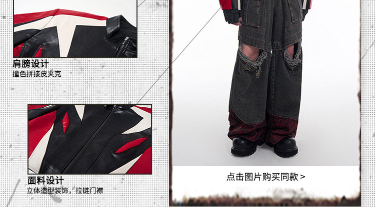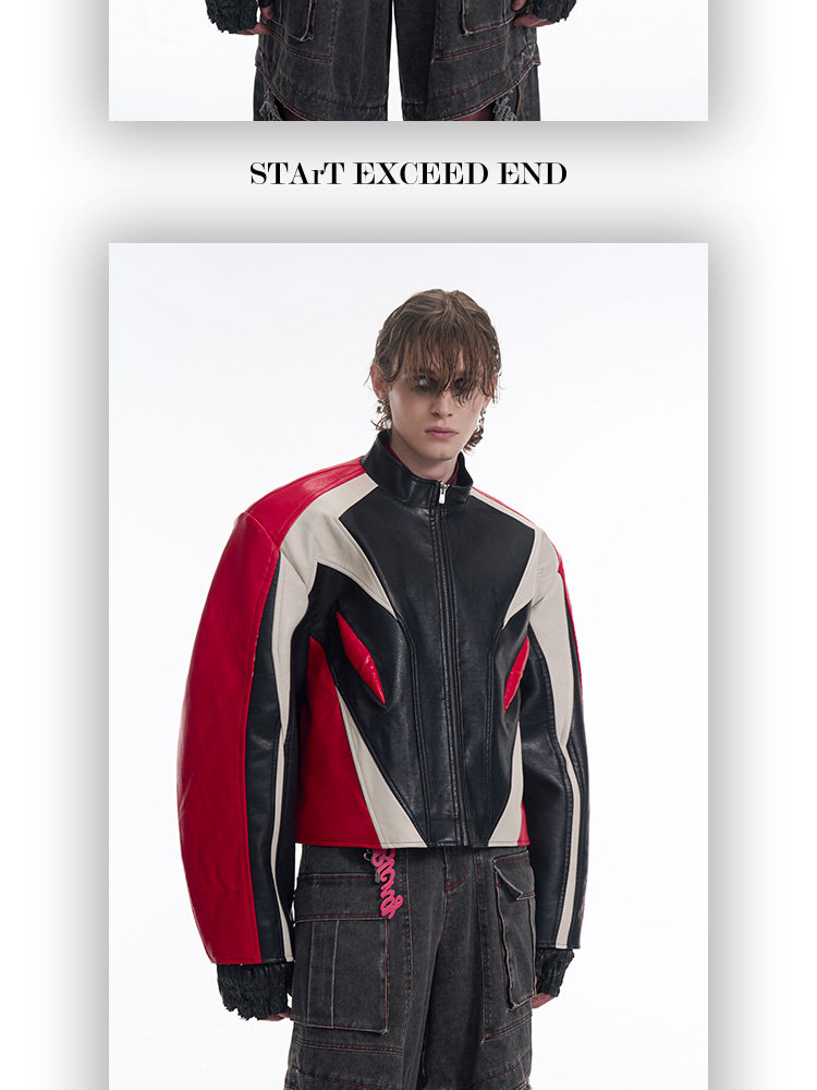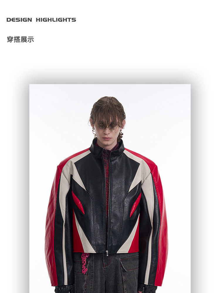 Short Stand-Up Collar Scimitar Sleeve Leather Jacket for Men, Spring Color-Blocked Patchwork Men's Oversized Cool Biker Jacket