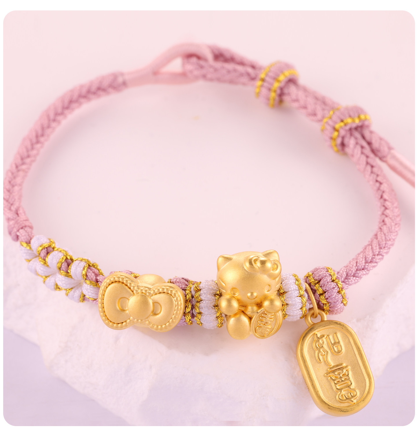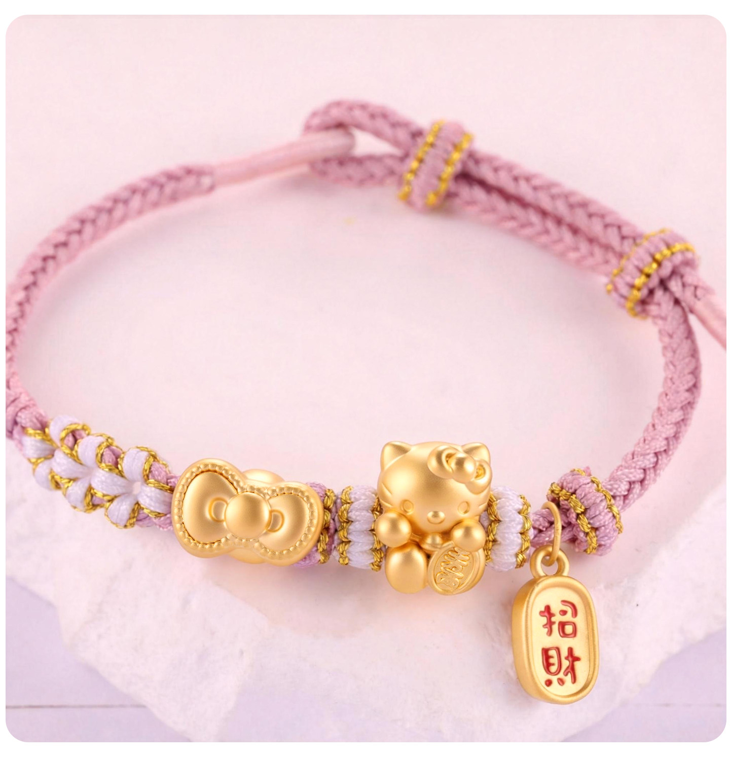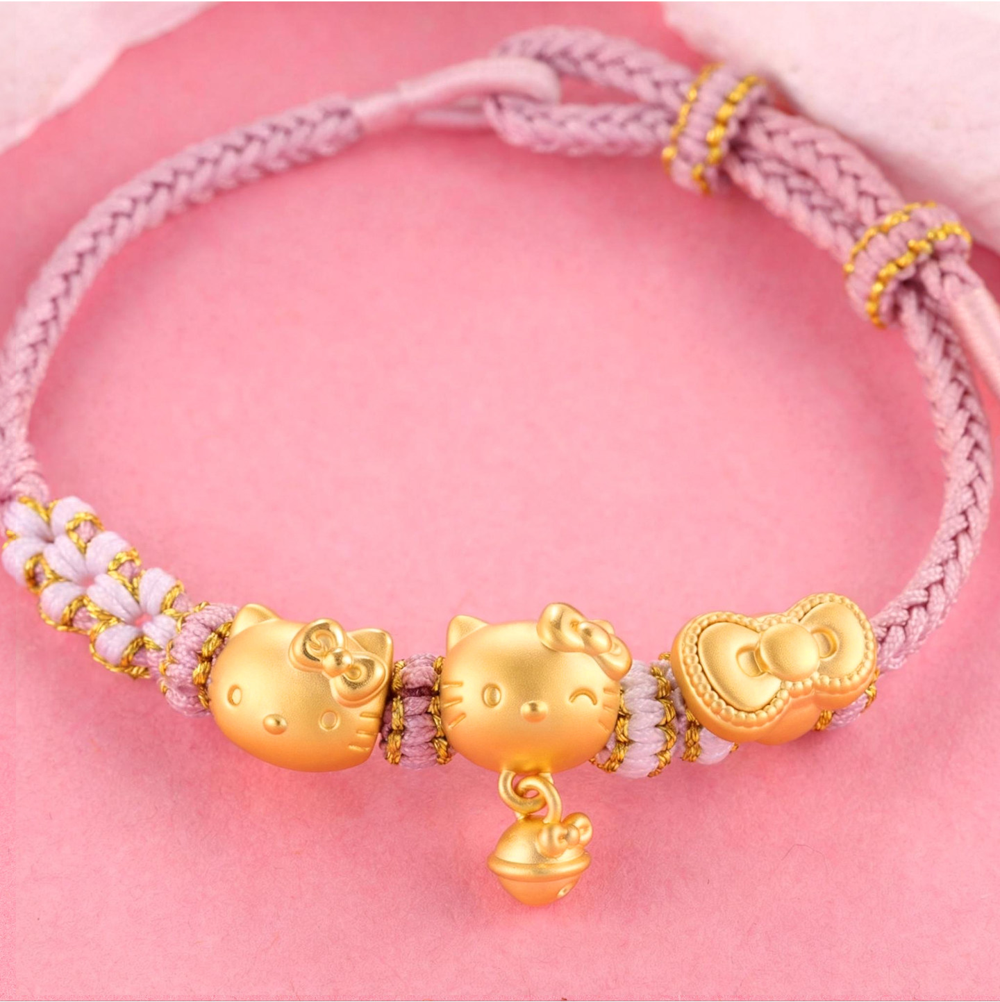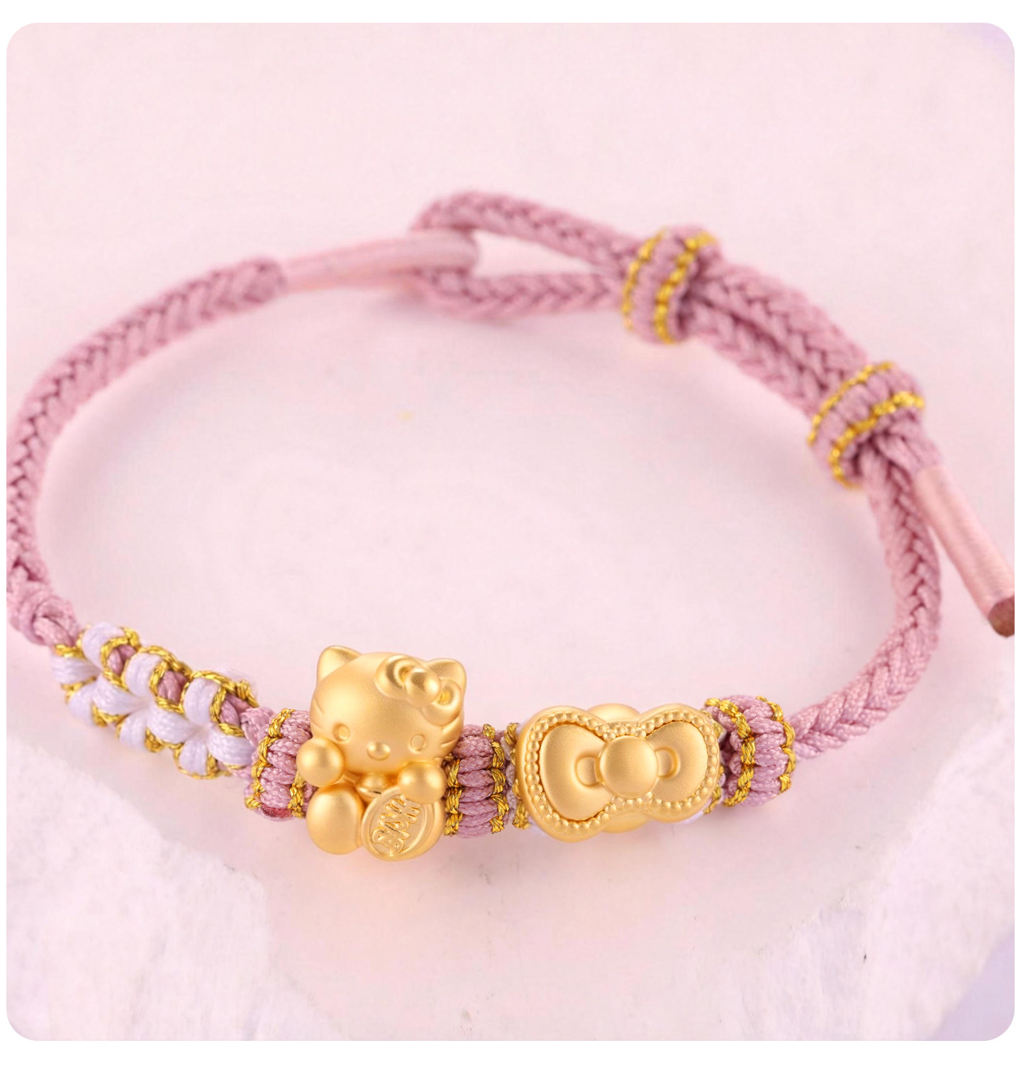 Pure Gold 999Kt Cat Gold Braided Rope Bracelet with Pure Gold Bow 0kg Kitty Cat Lucky Bead Gift for Girlfriend
