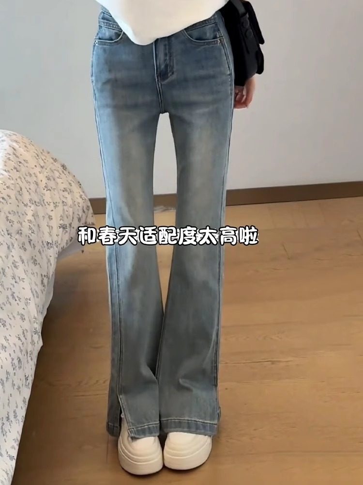 Light Blue Slit Flared Jeans for Women 2026 Spring New Plus Size High-Waisted Stretchy Bell-Bottom Floor-Length Pants