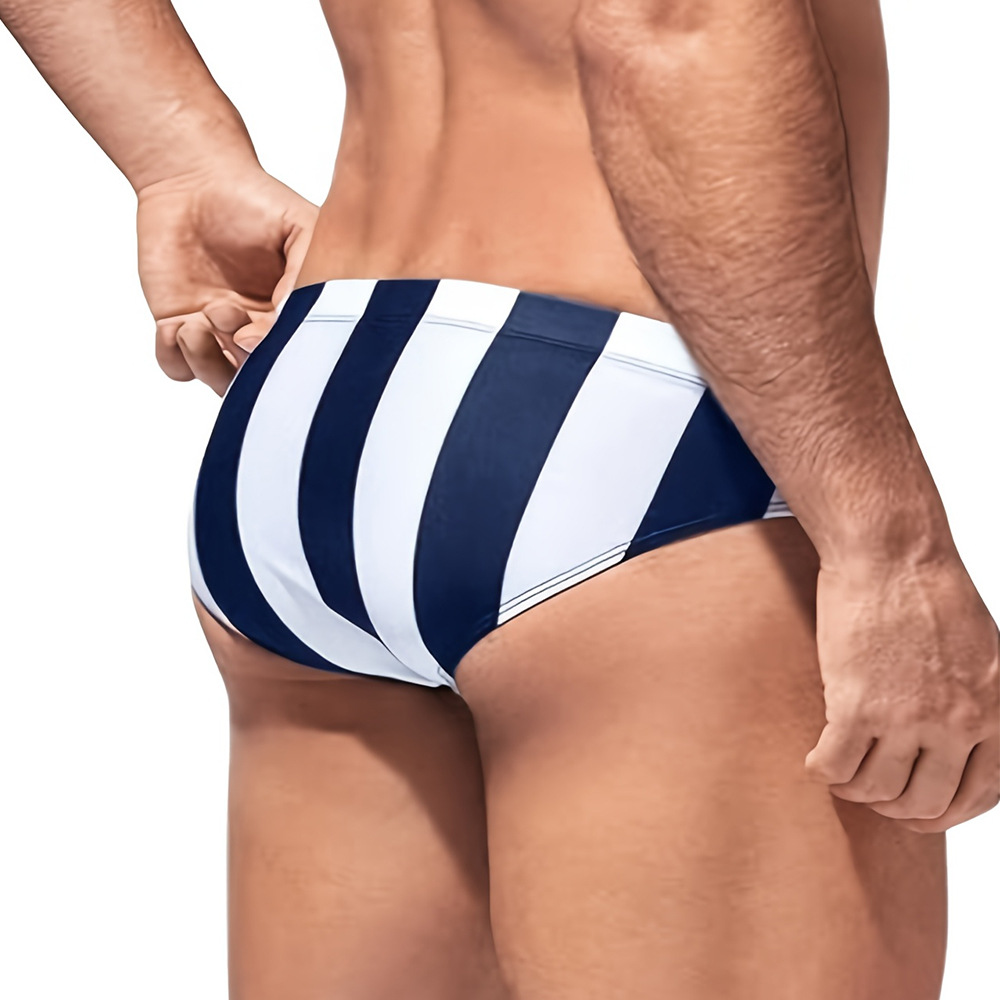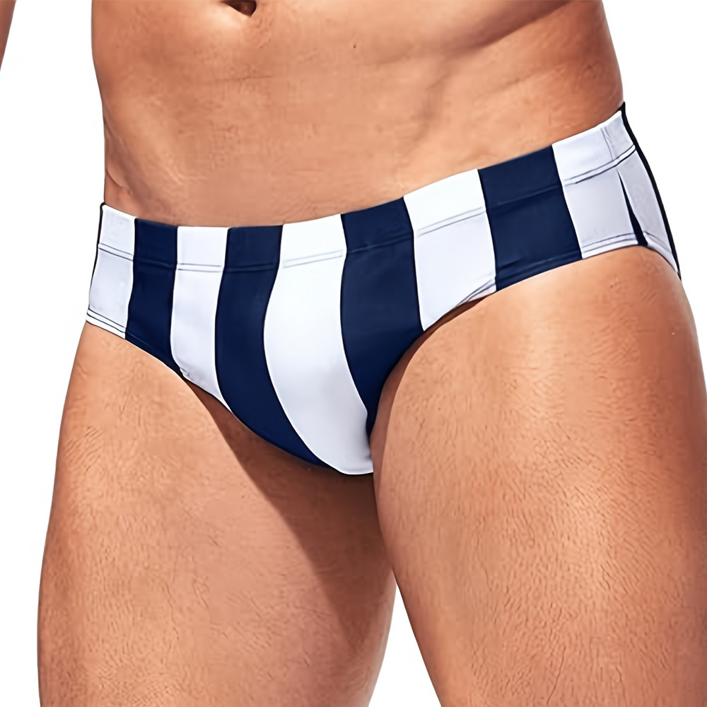 2025 New Men's Briefs, European and American Popular Sexy Blue and White Vertical Striped Elastic Swimming Trunks, Sexy Men's Style