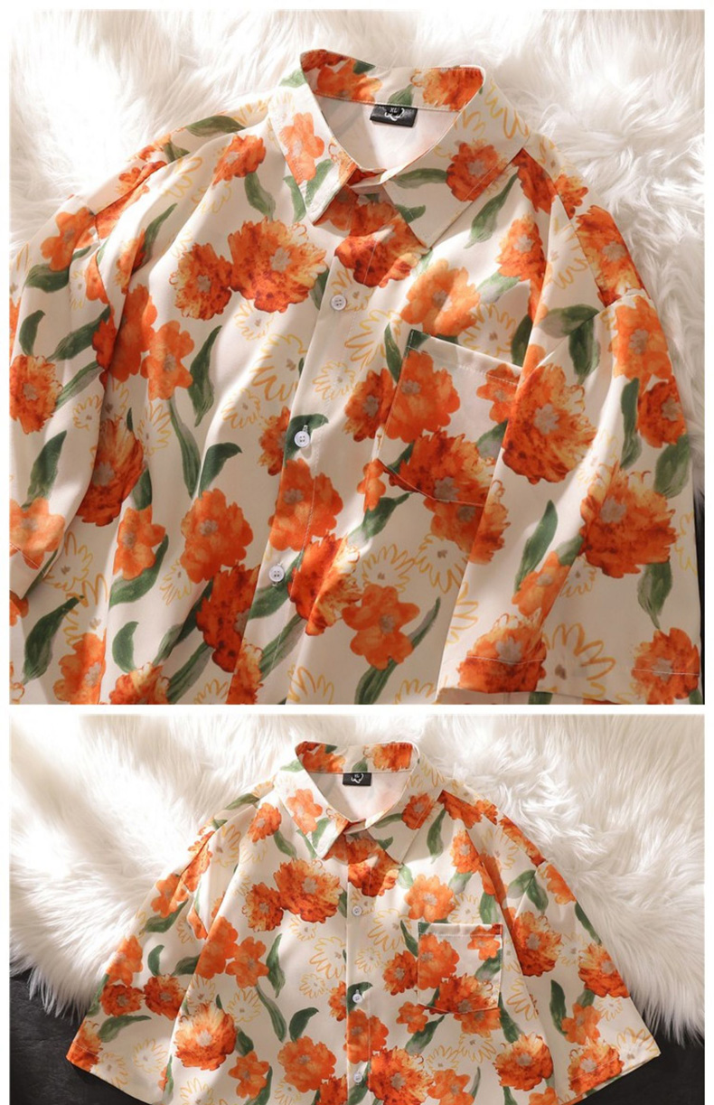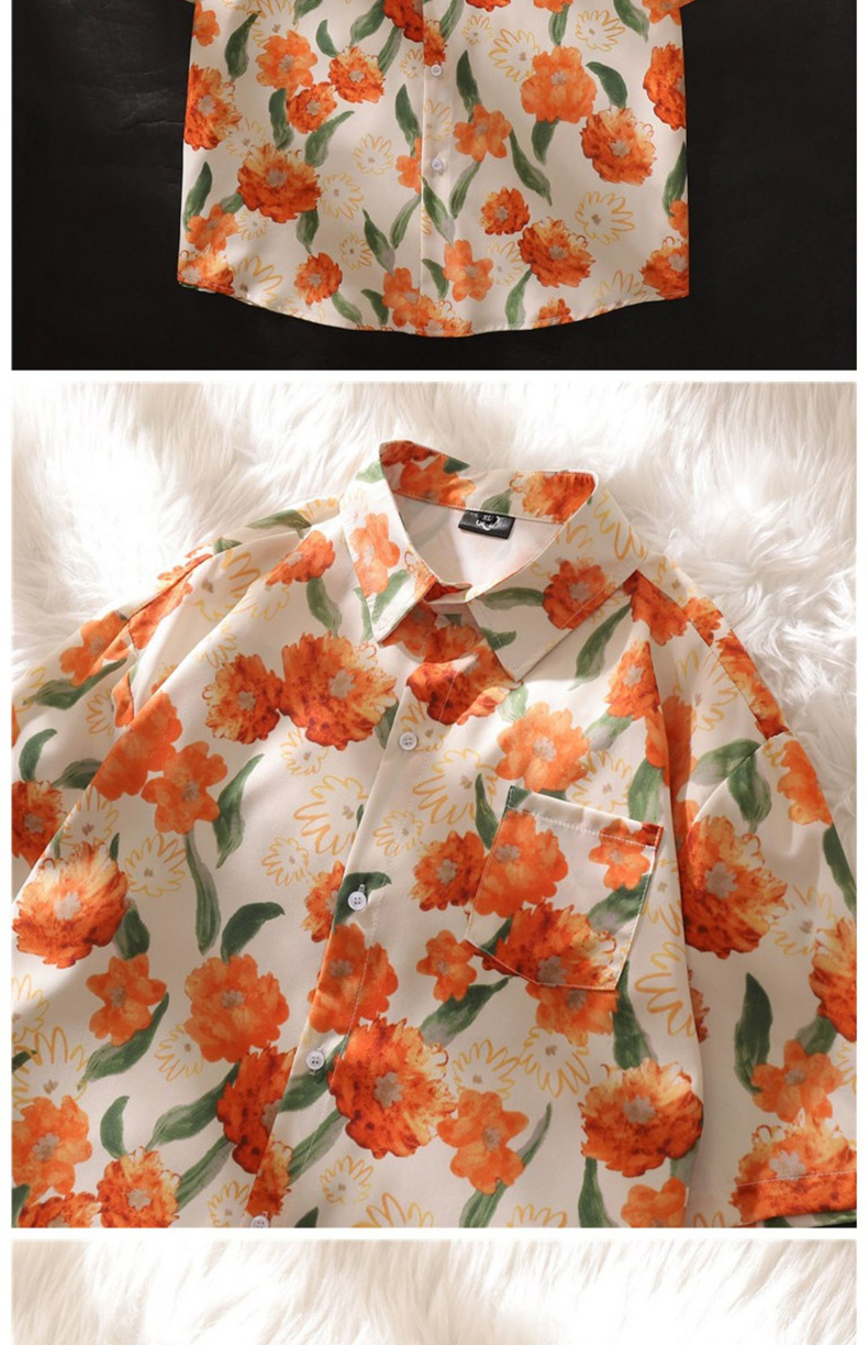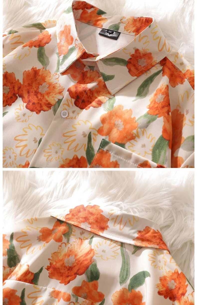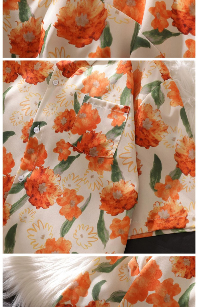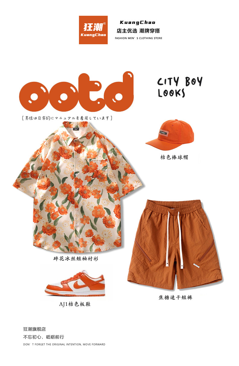 Dopamine Style Summer Orange Floral Ice Silk Shirt Men's Short-Sleeved Shorts High-End Cool Beach Outfit