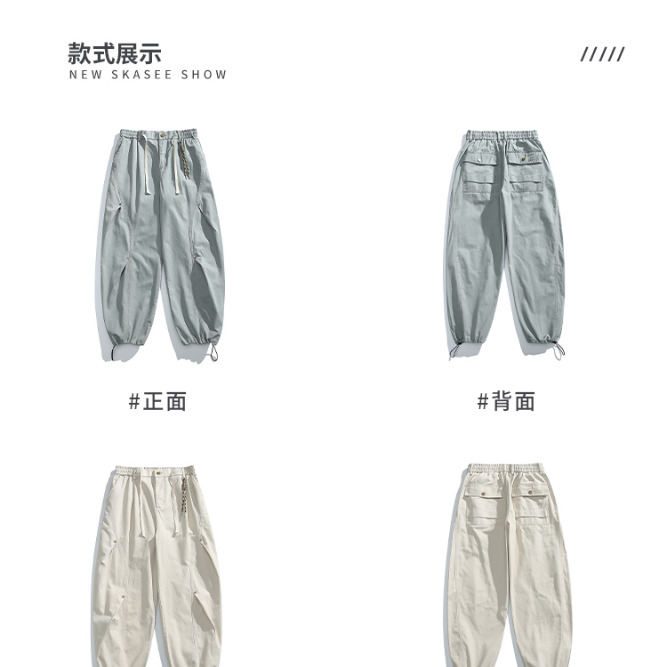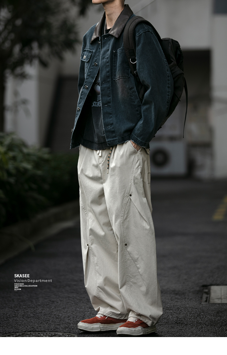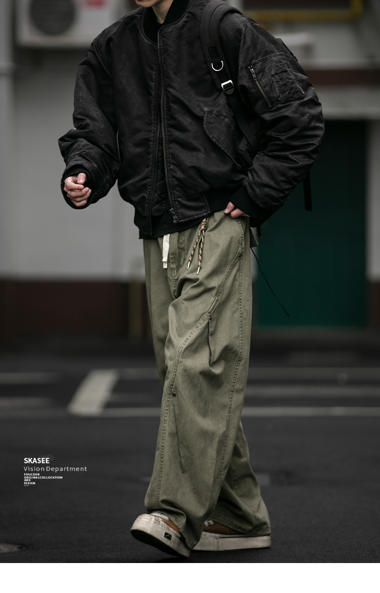 American Retro Heavy-Duty Washed Double-Pleated Rivet Cargo Pants for Men, Trendy Brand Loose Wide-Leg Drawstring Casual Scimitar Pants