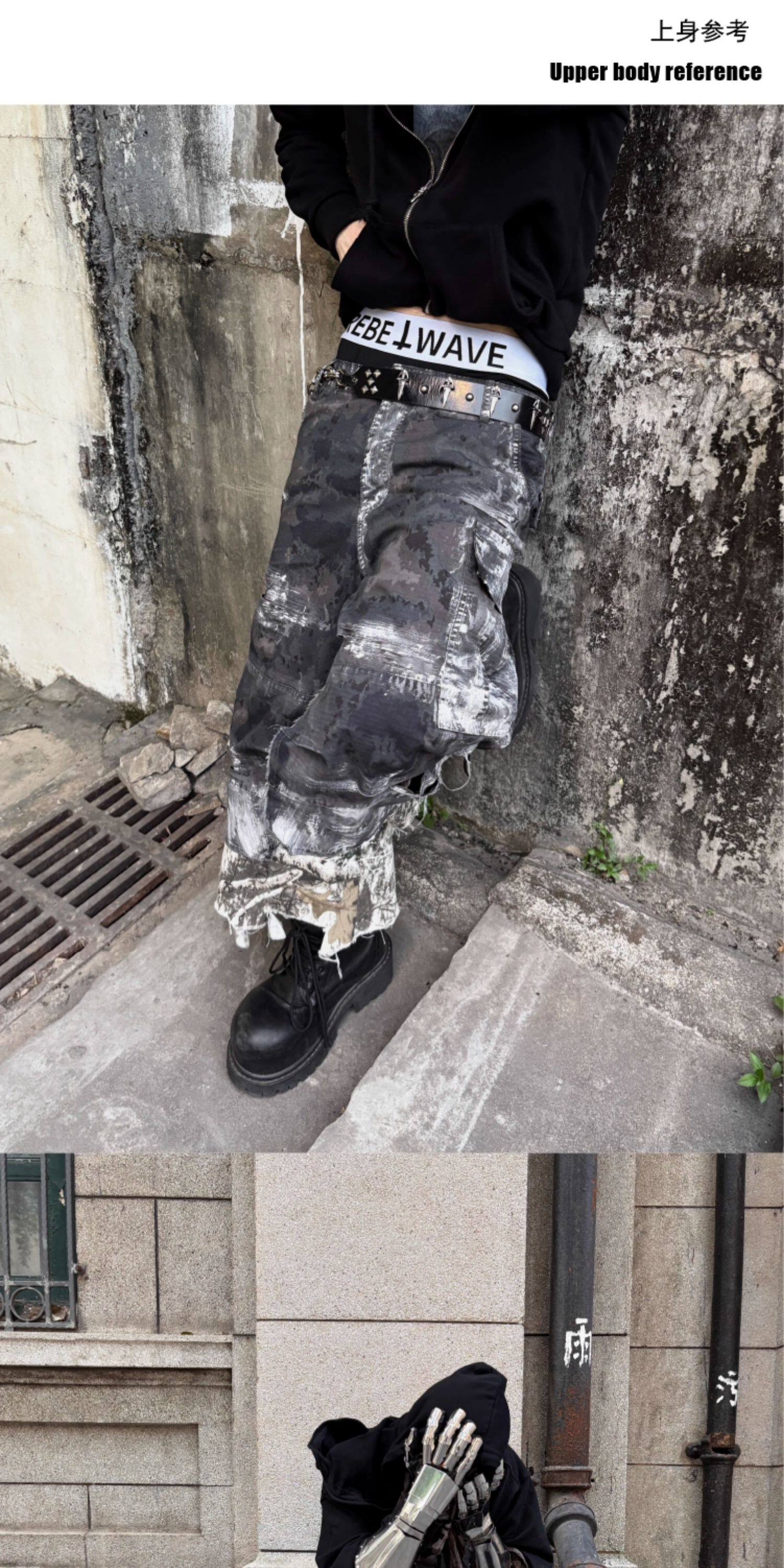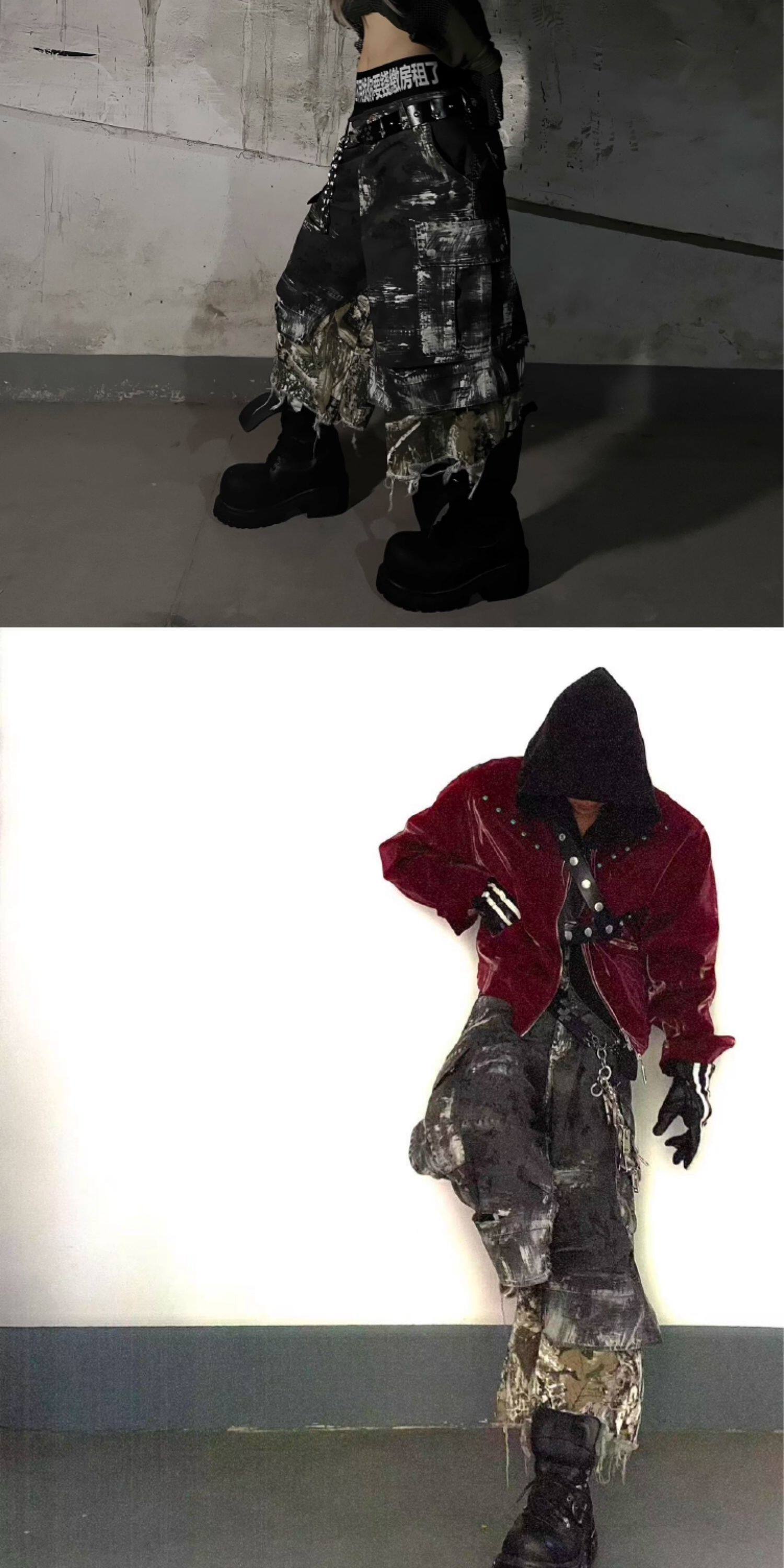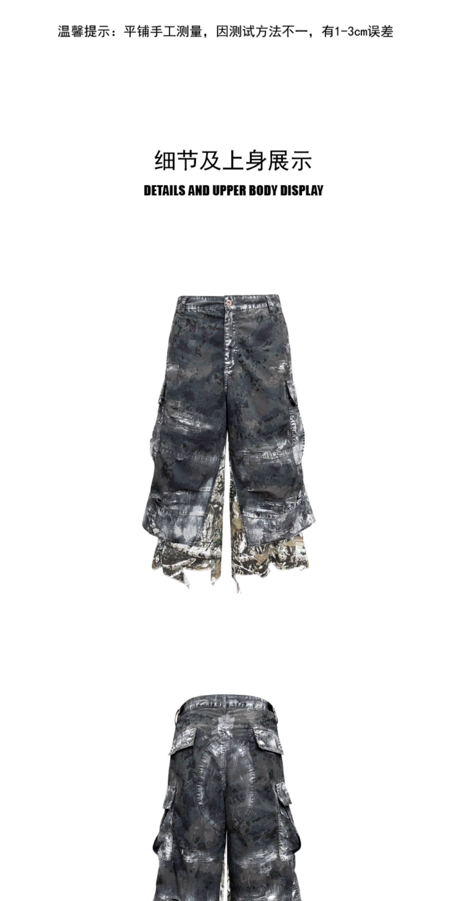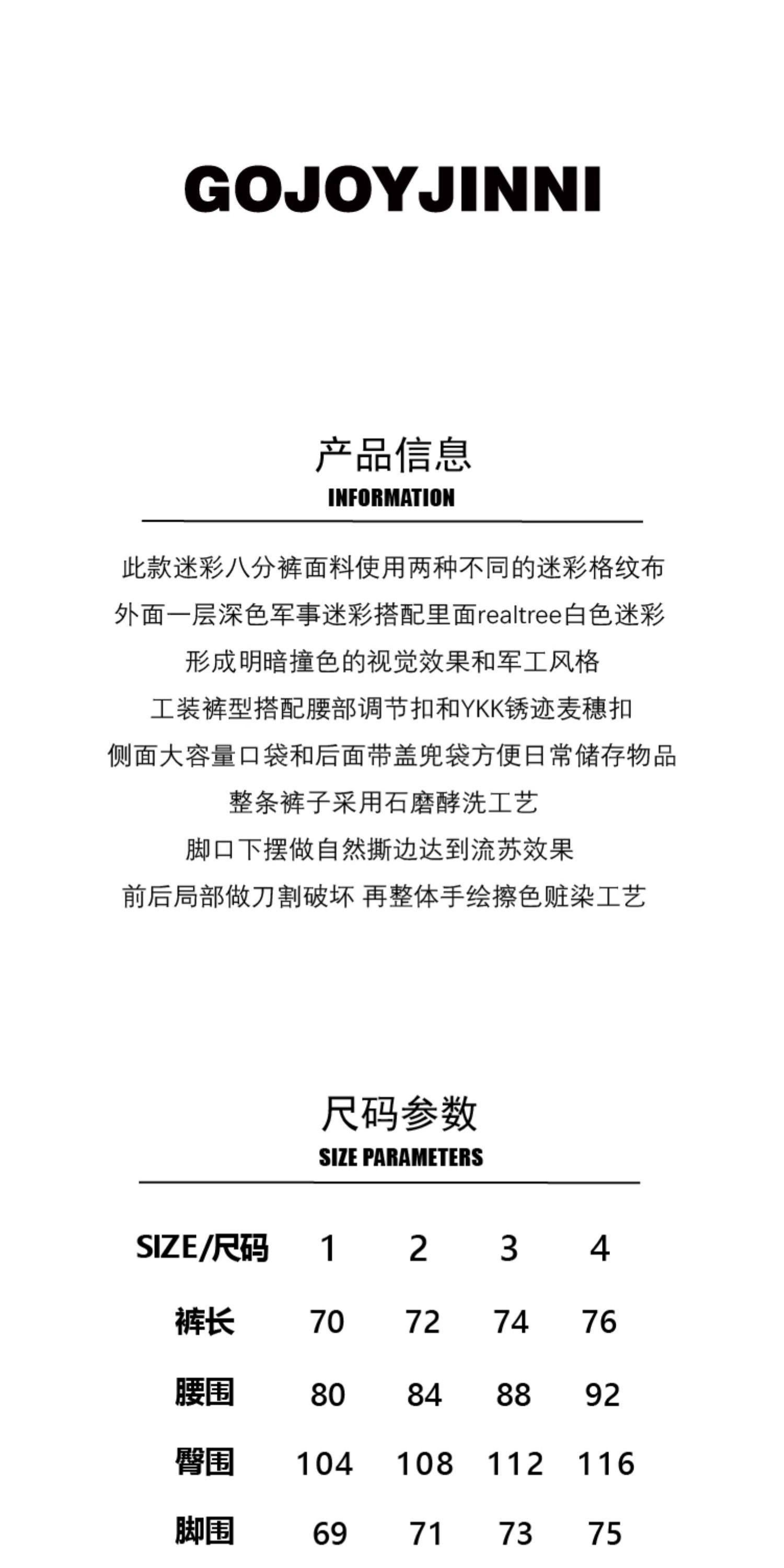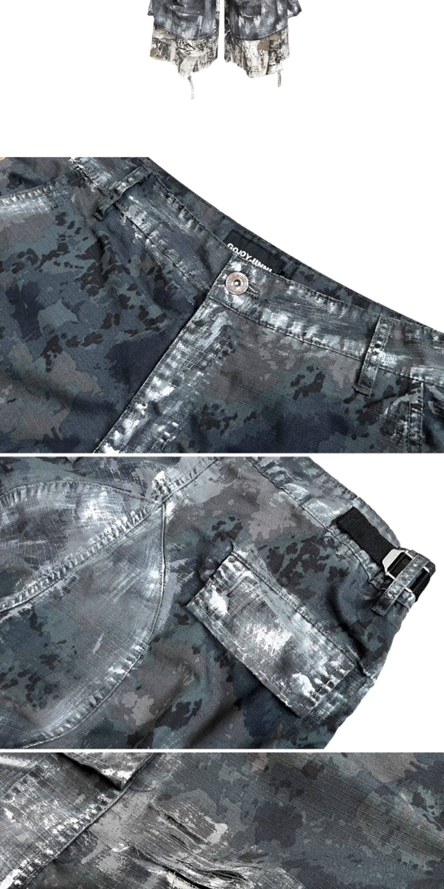 Gojoyjinni Thome Same Style Dirty-Washed Camouflage Patch Pocket Distressed Ripped Faux Two-Piece Shorts Cropped Pants