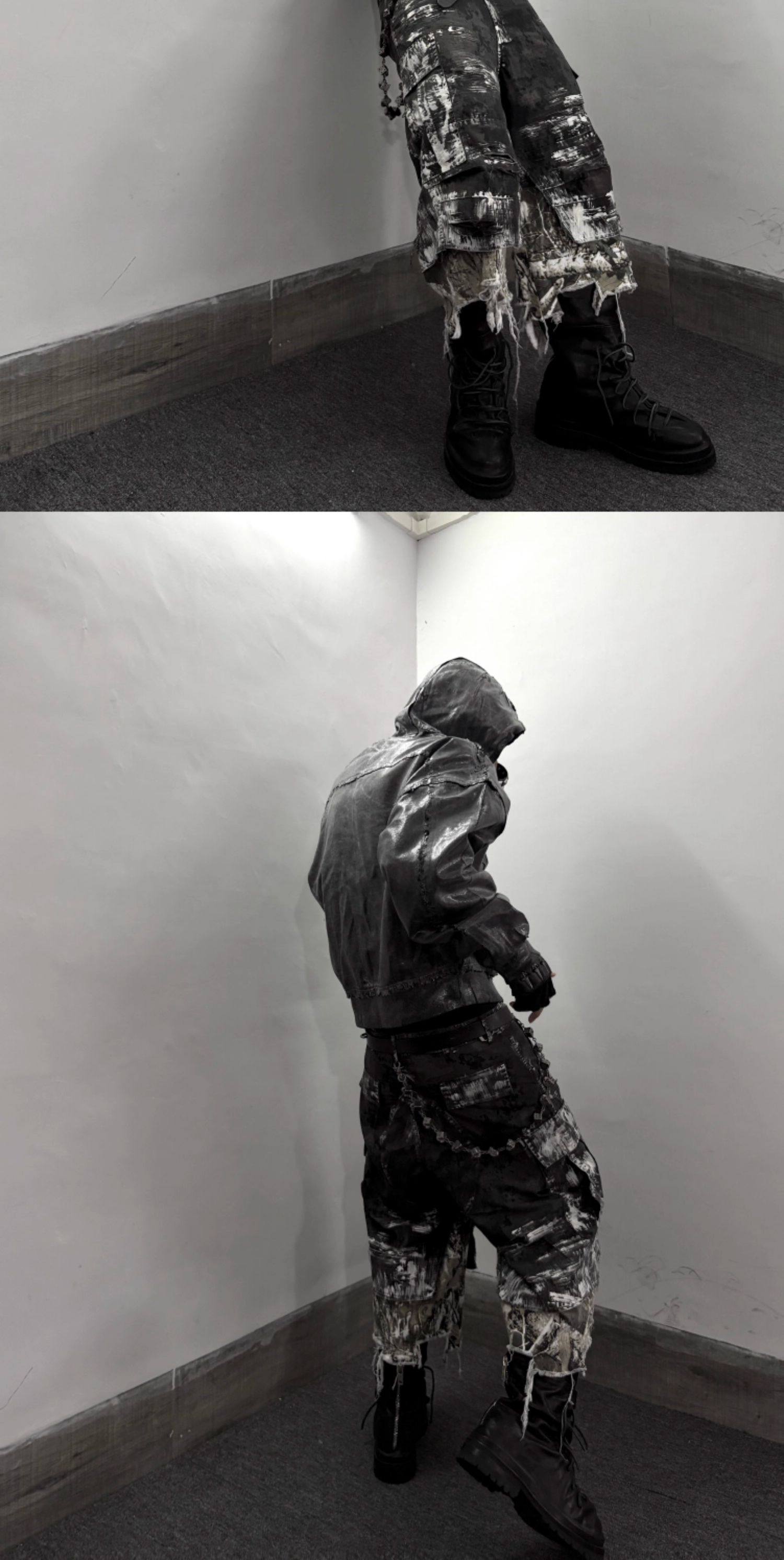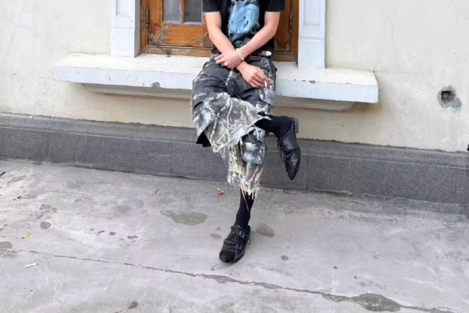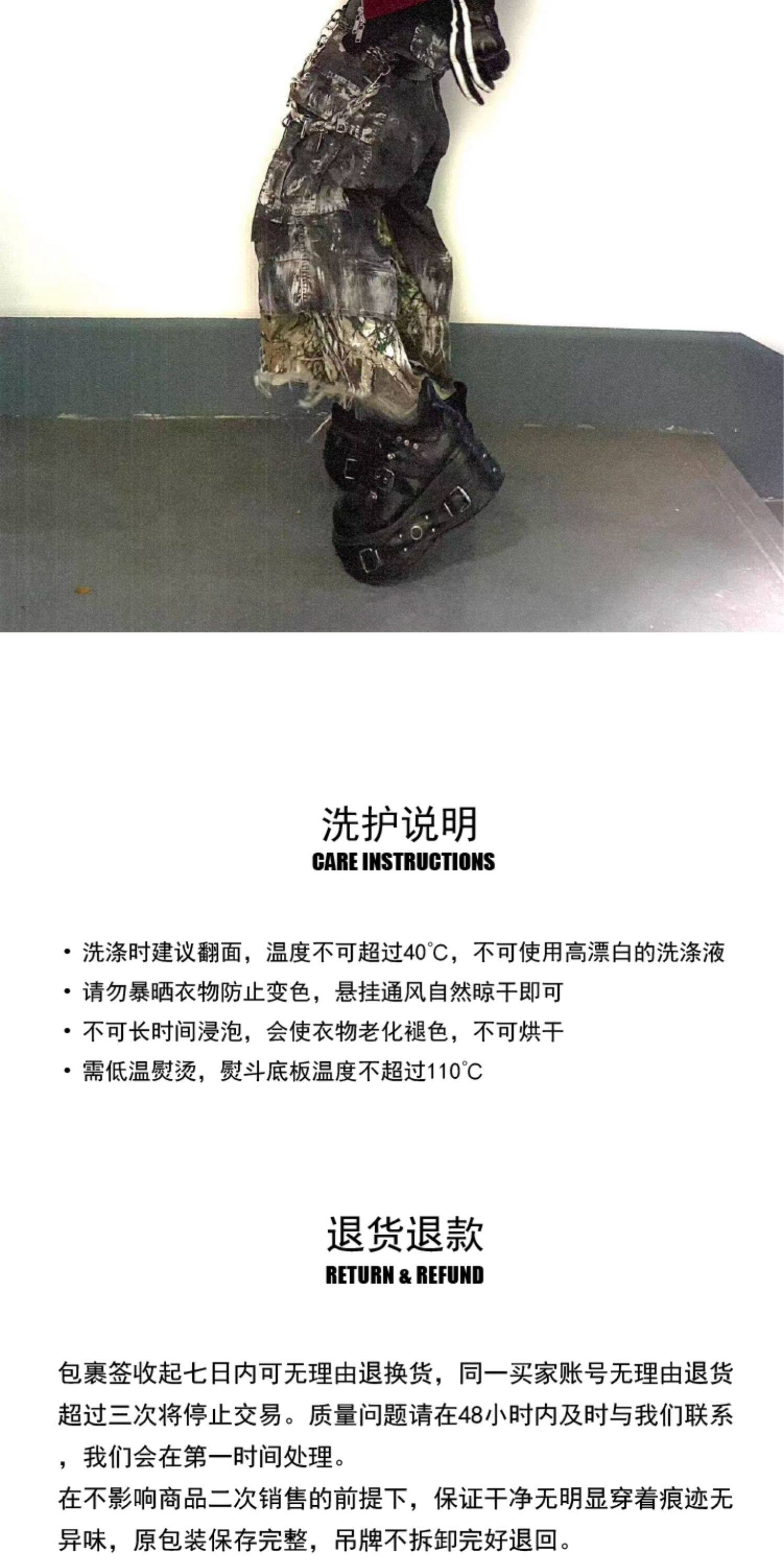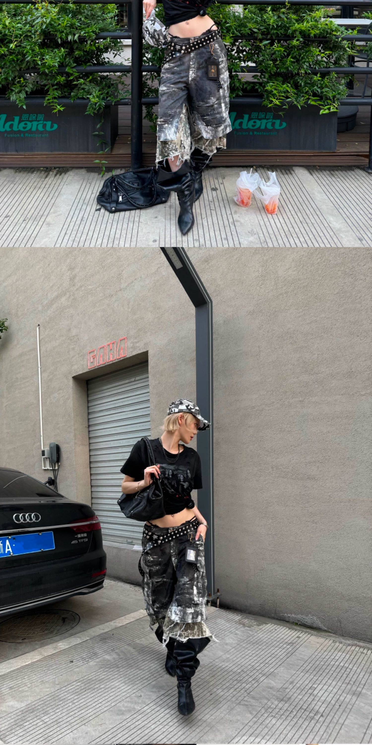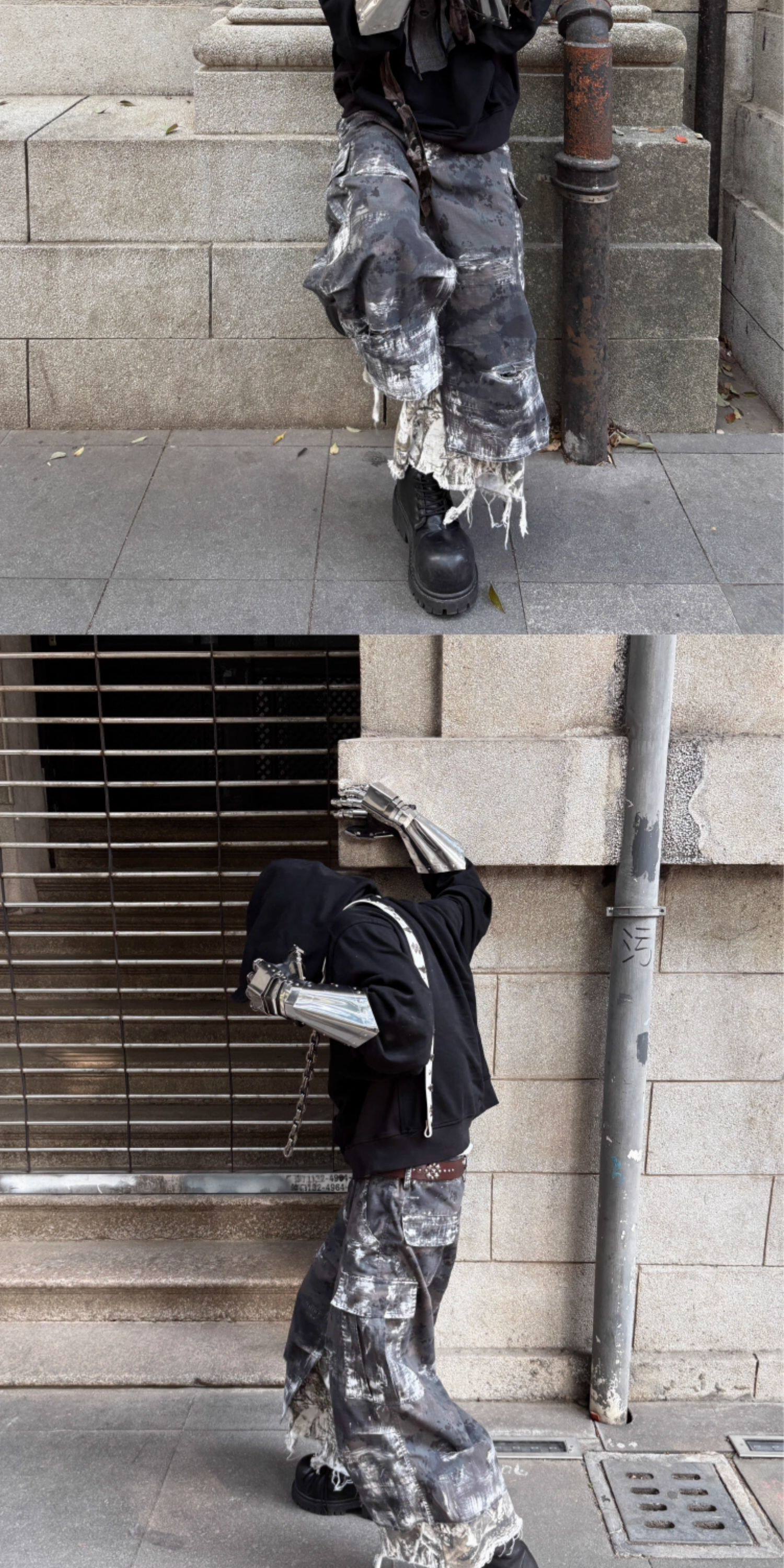 Gojoyjinni Thome Same Style Dirty-Washed Camouflage Patch Pocket Distressed Ripped Faux Two-Piece Shorts Cropped Pants