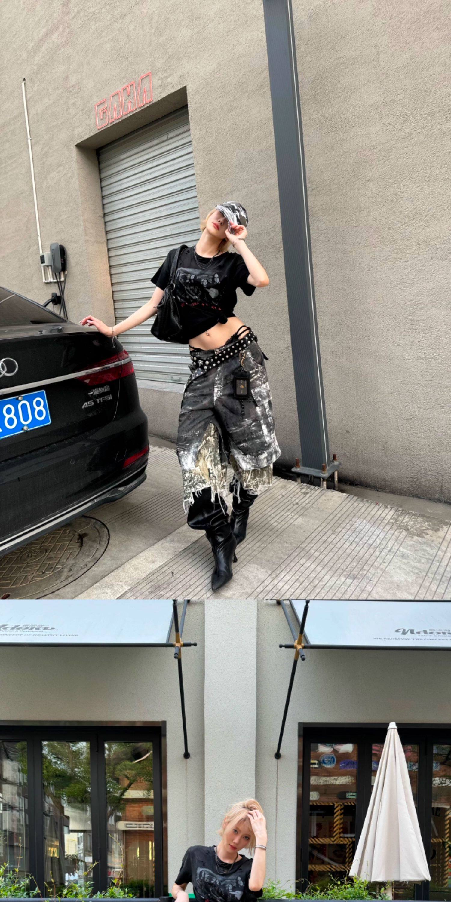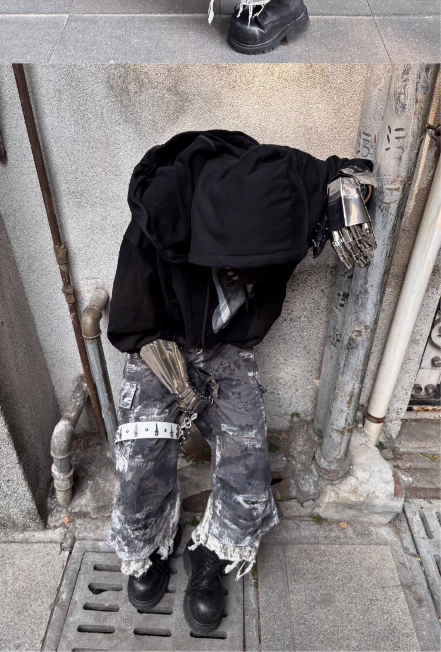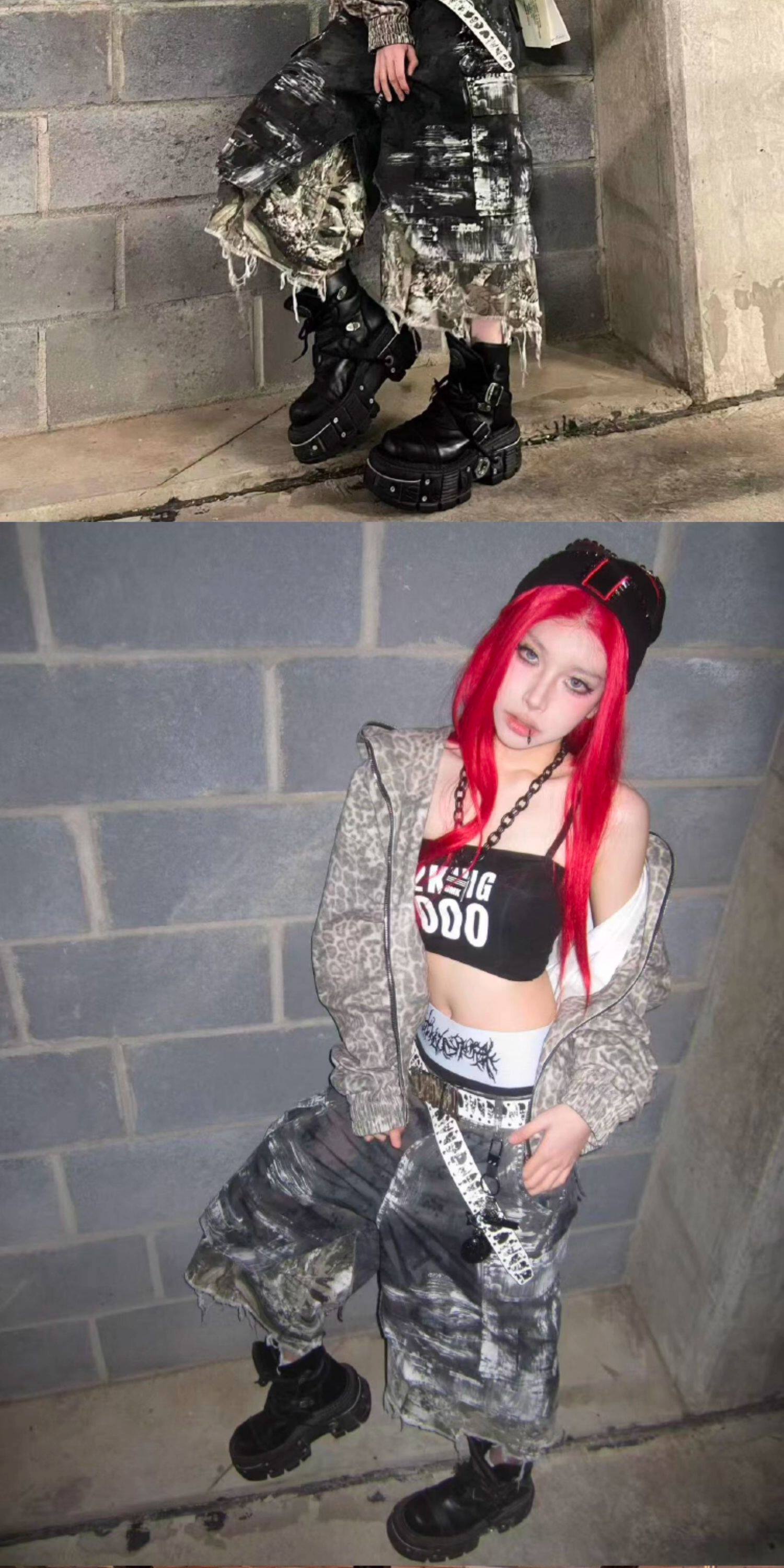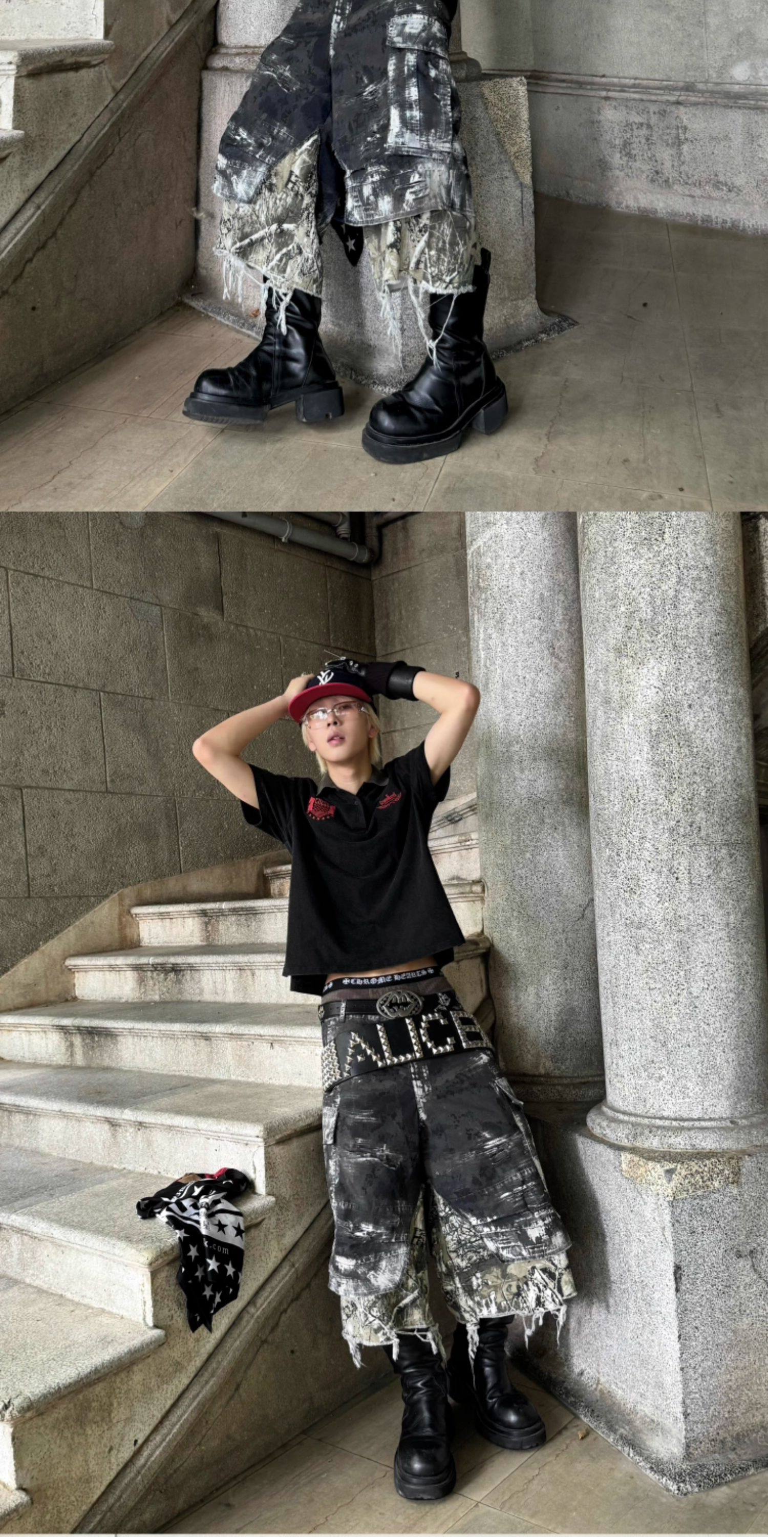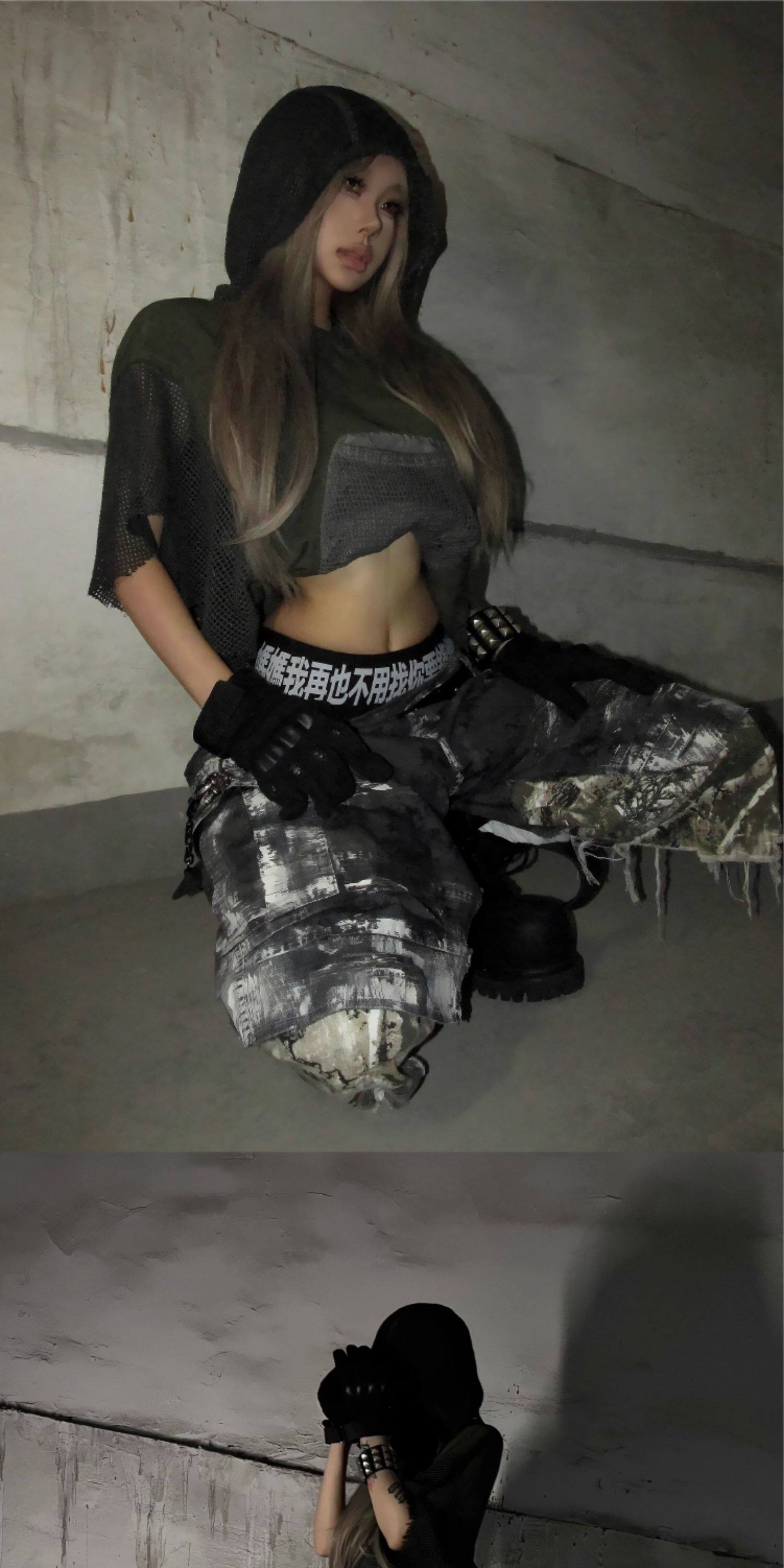 Gojoyjinni Thome Same Style Dirty-Washed Camouflage Patch Pocket Distressed Ripped Faux Two-Piece Shorts Cropped Pants