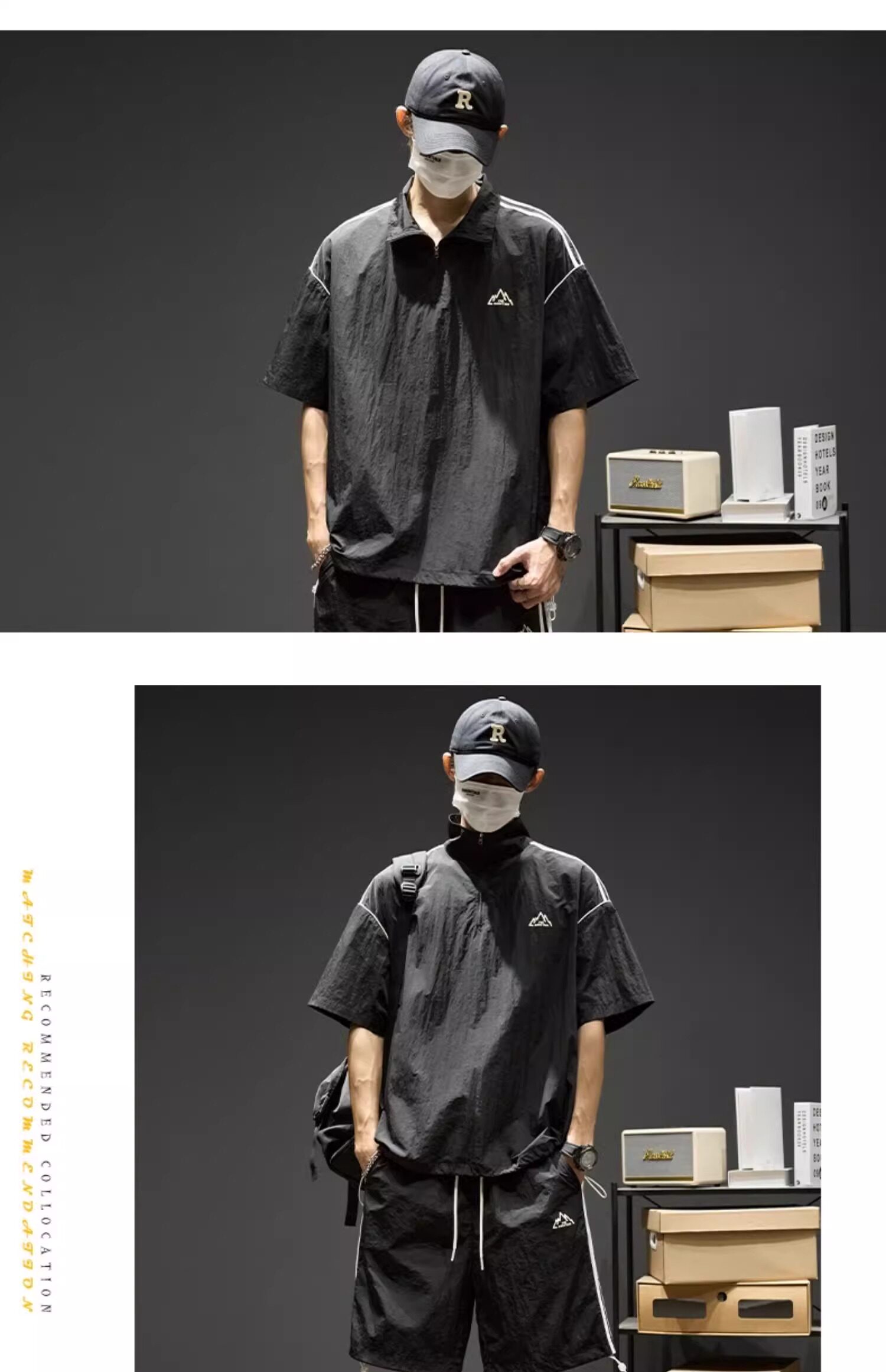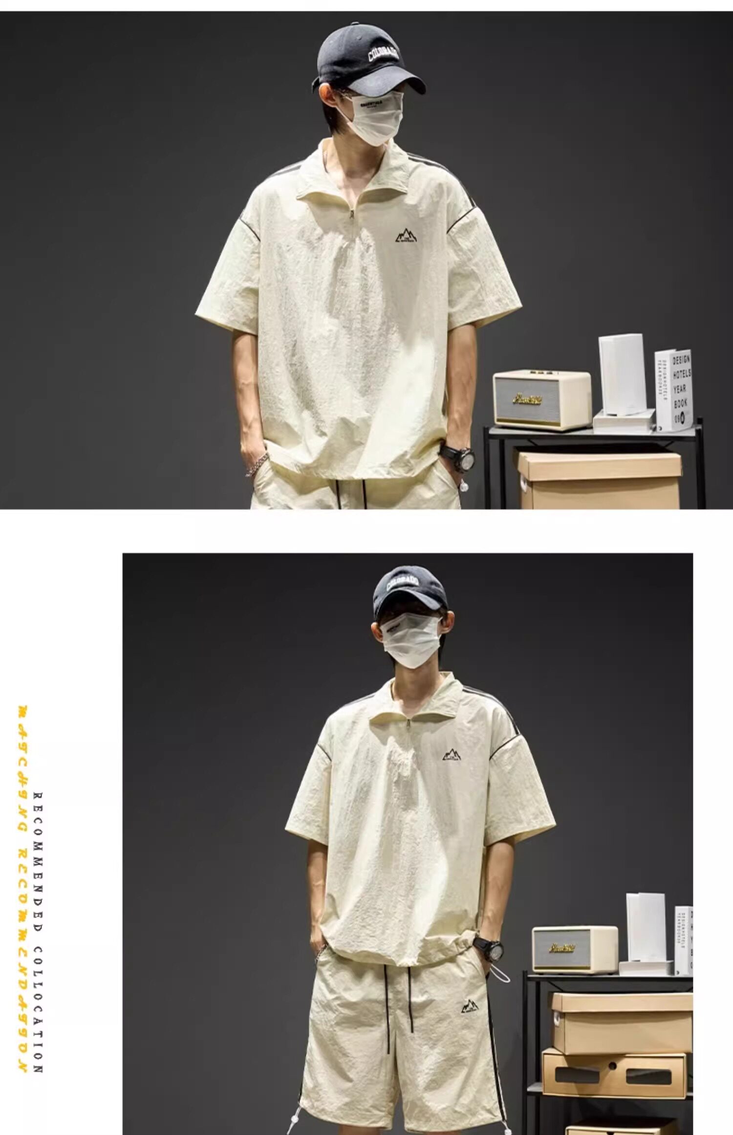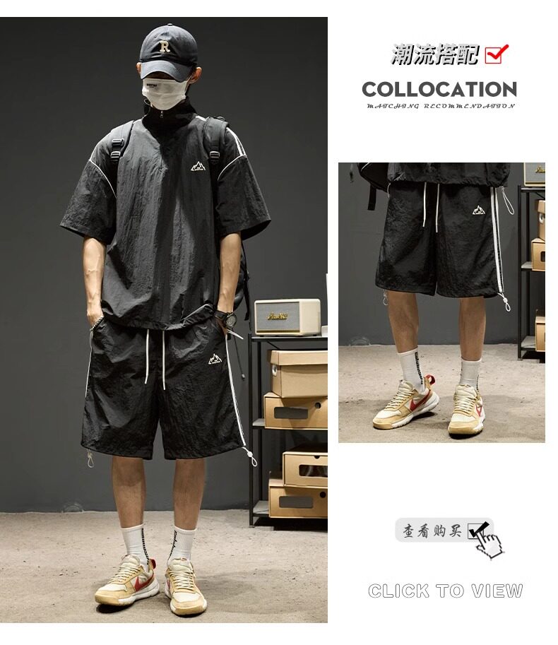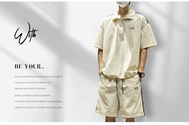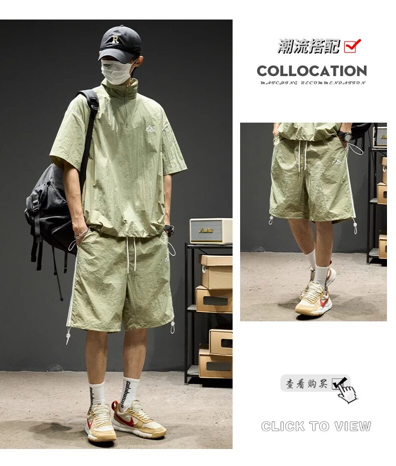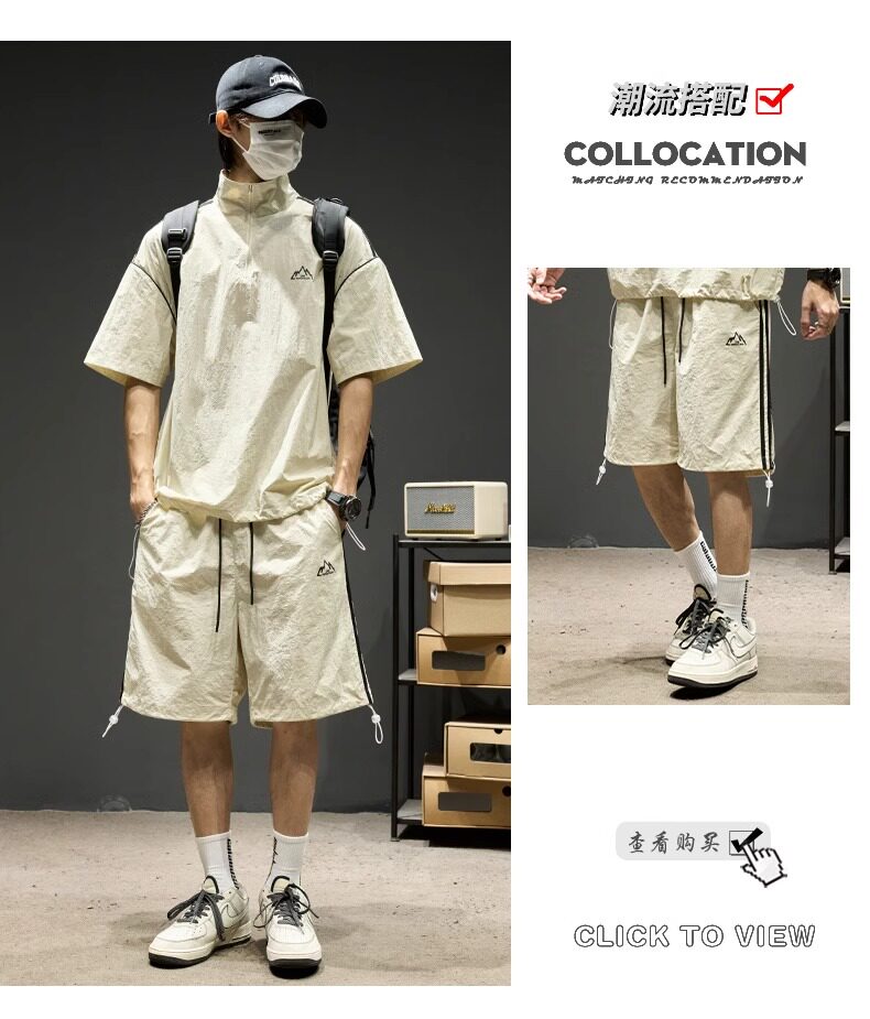 Trendy Brand Ice Silk Suit for Men, Summer Thin Sports Casual Half-Zip Stand Collar Striped Short-Sleeve Shorts Two-Piece Set