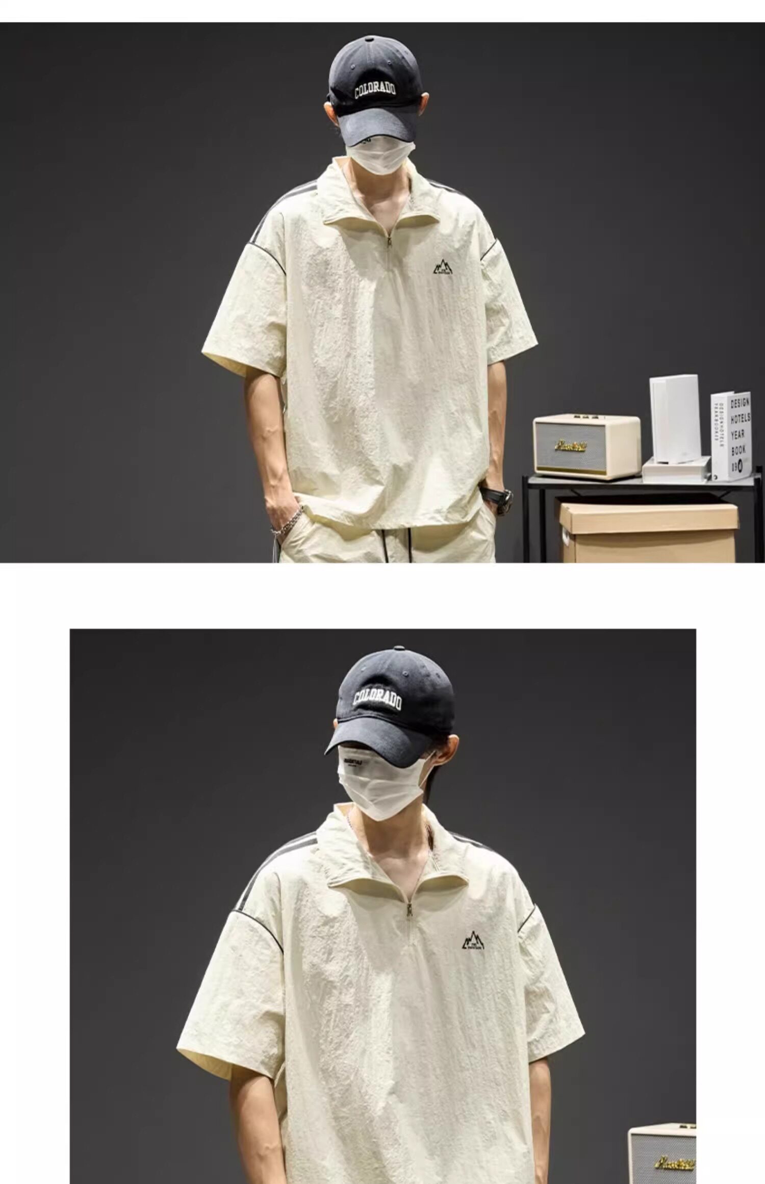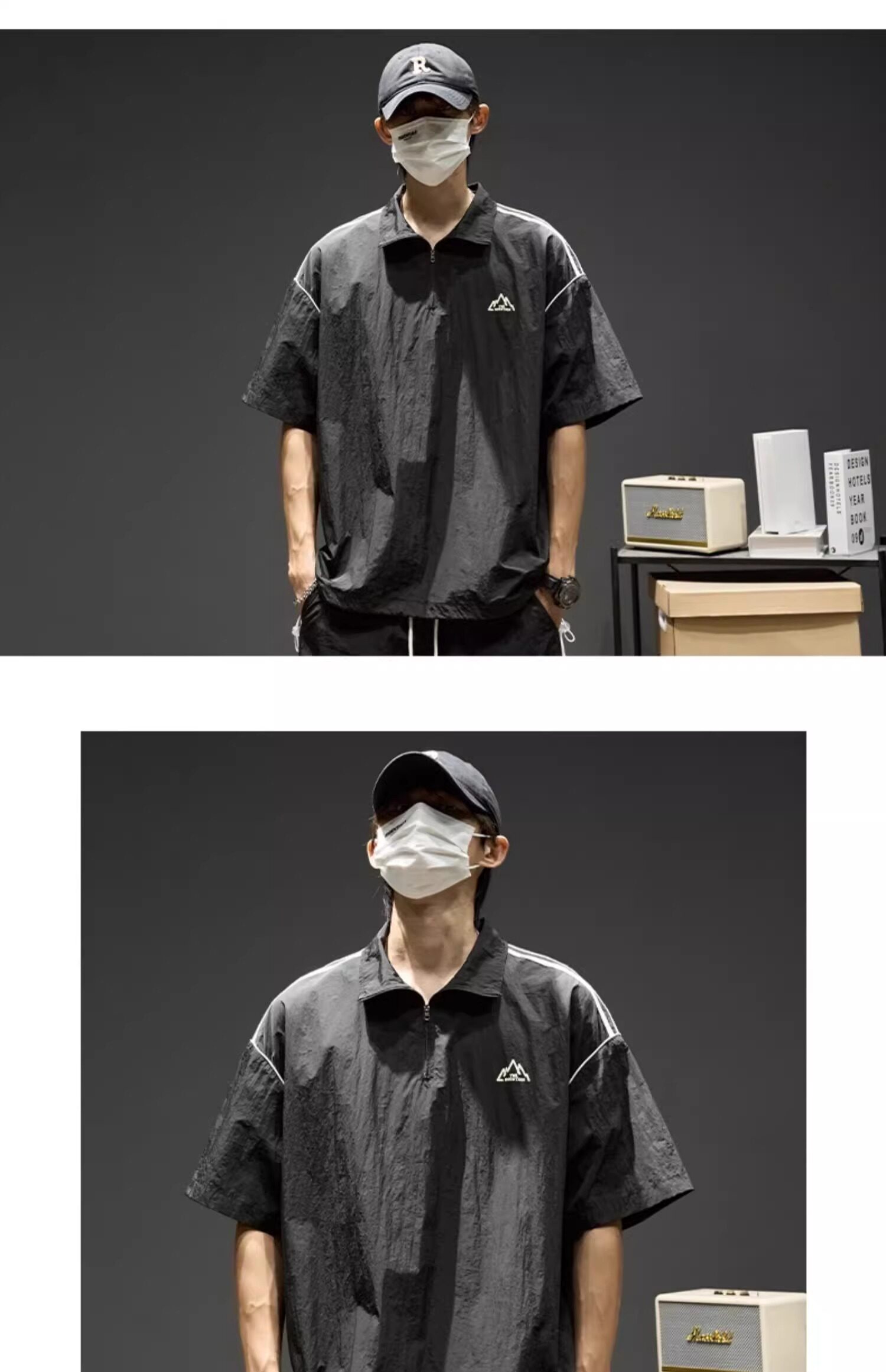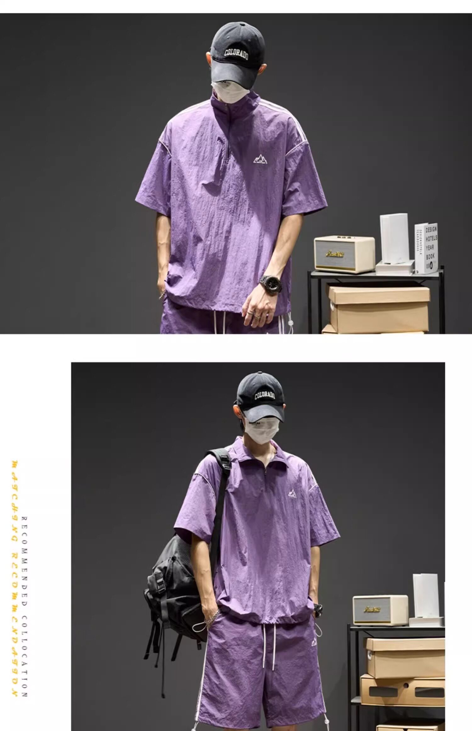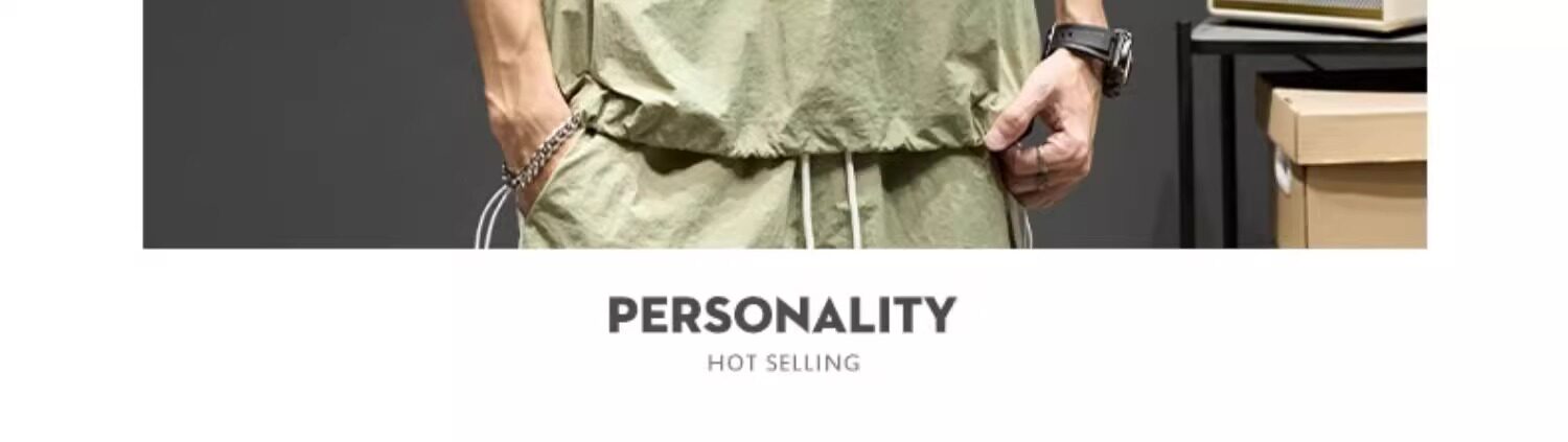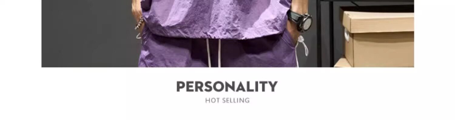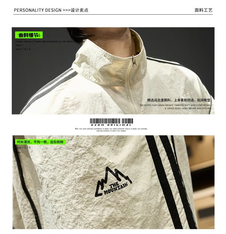 Trendy Brand Ice Silk Suit for Men, Summer Thin Sports Casual Half-Zip Stand Collar Striped Short-Sleeve Shorts Two-Piece Set