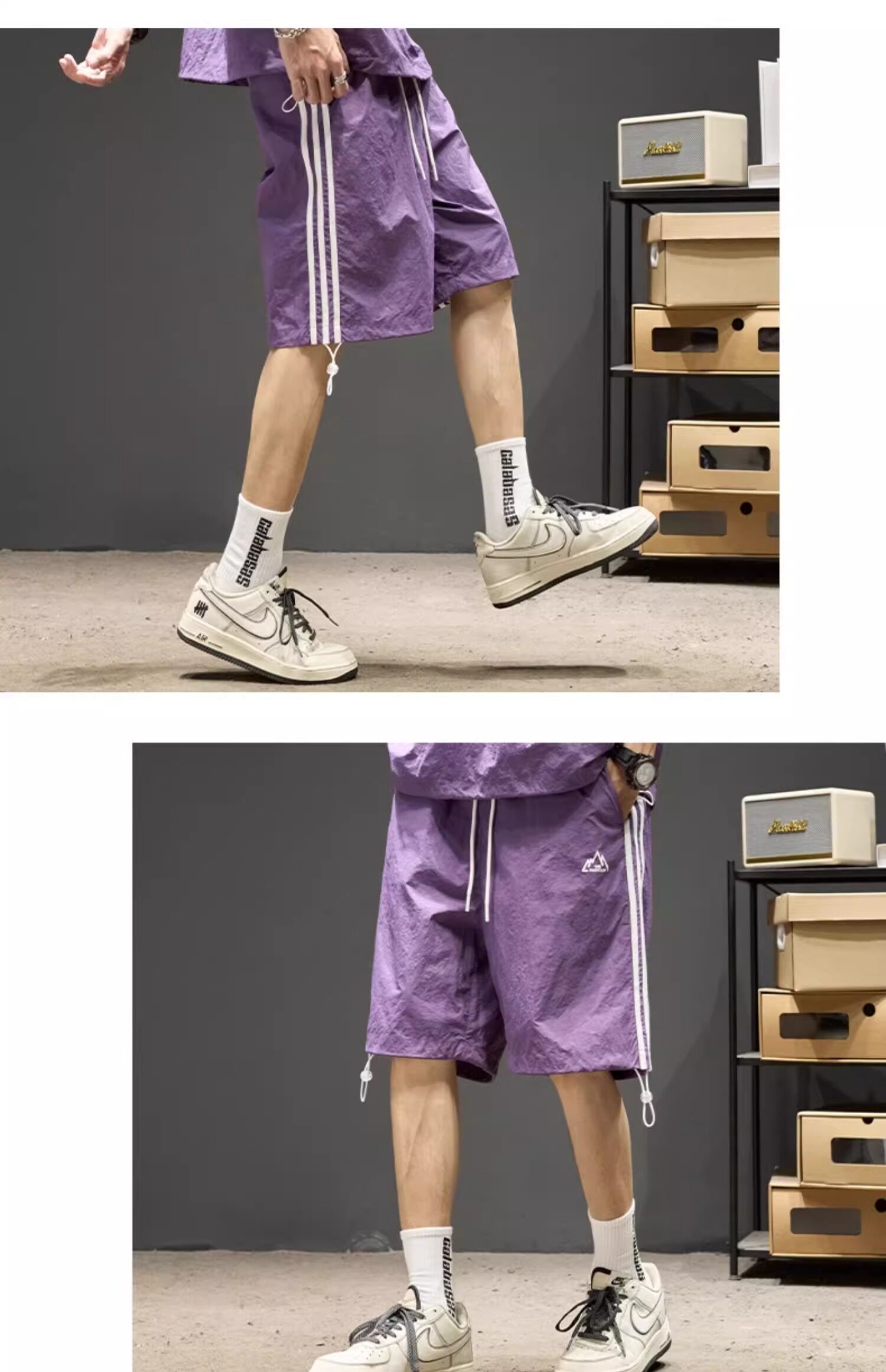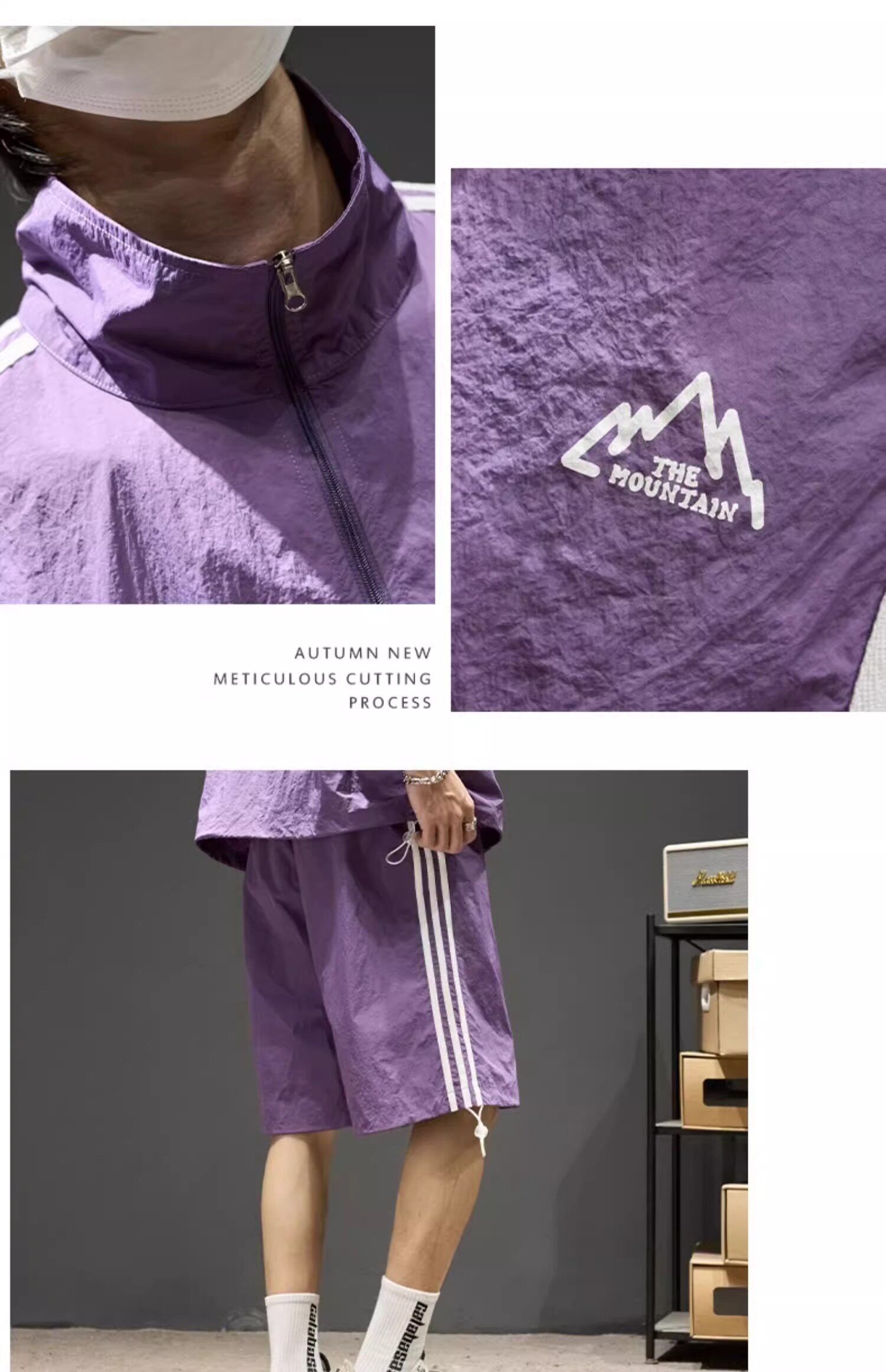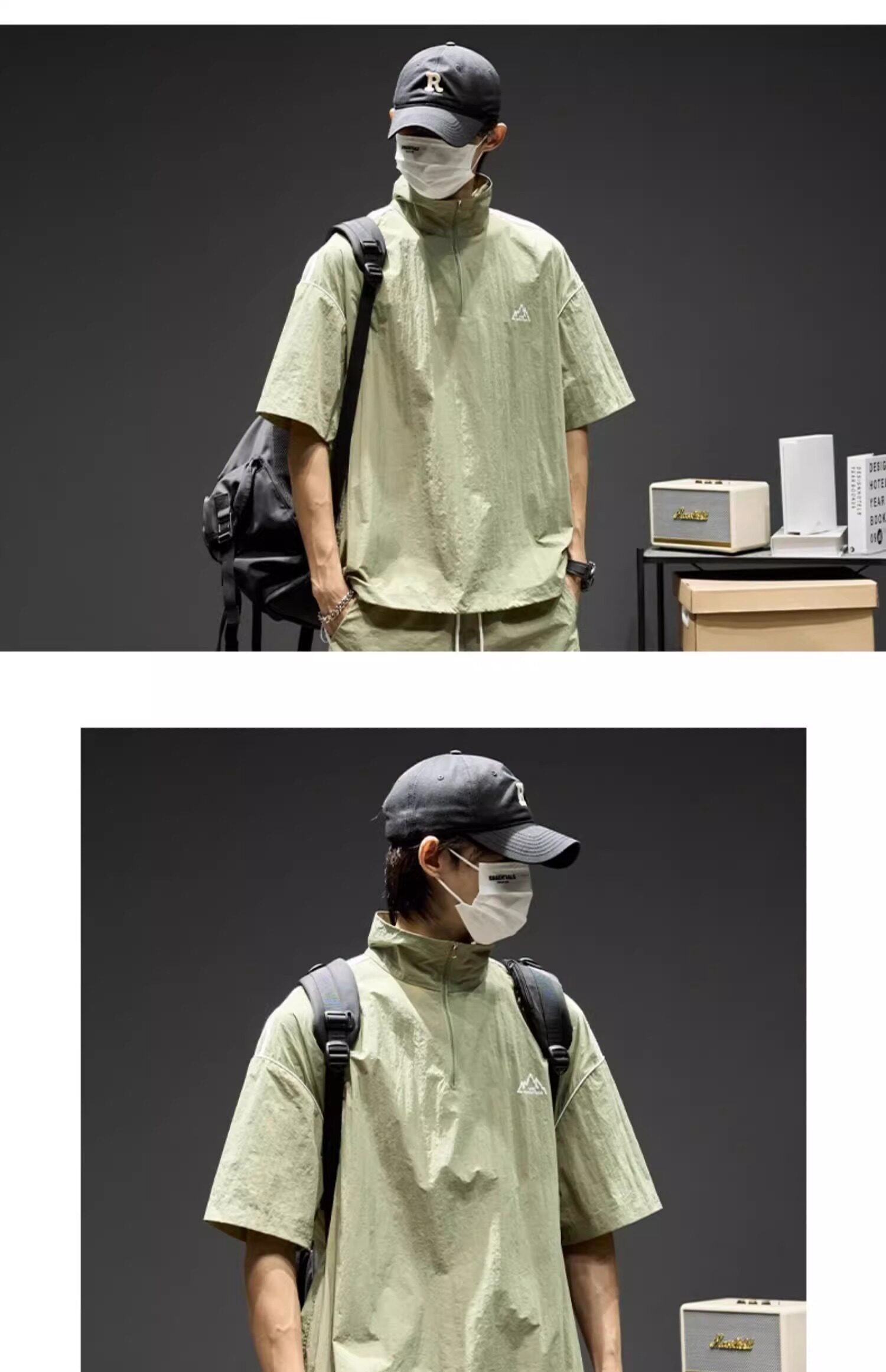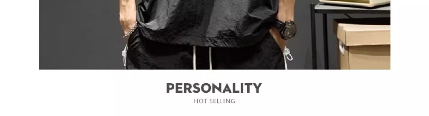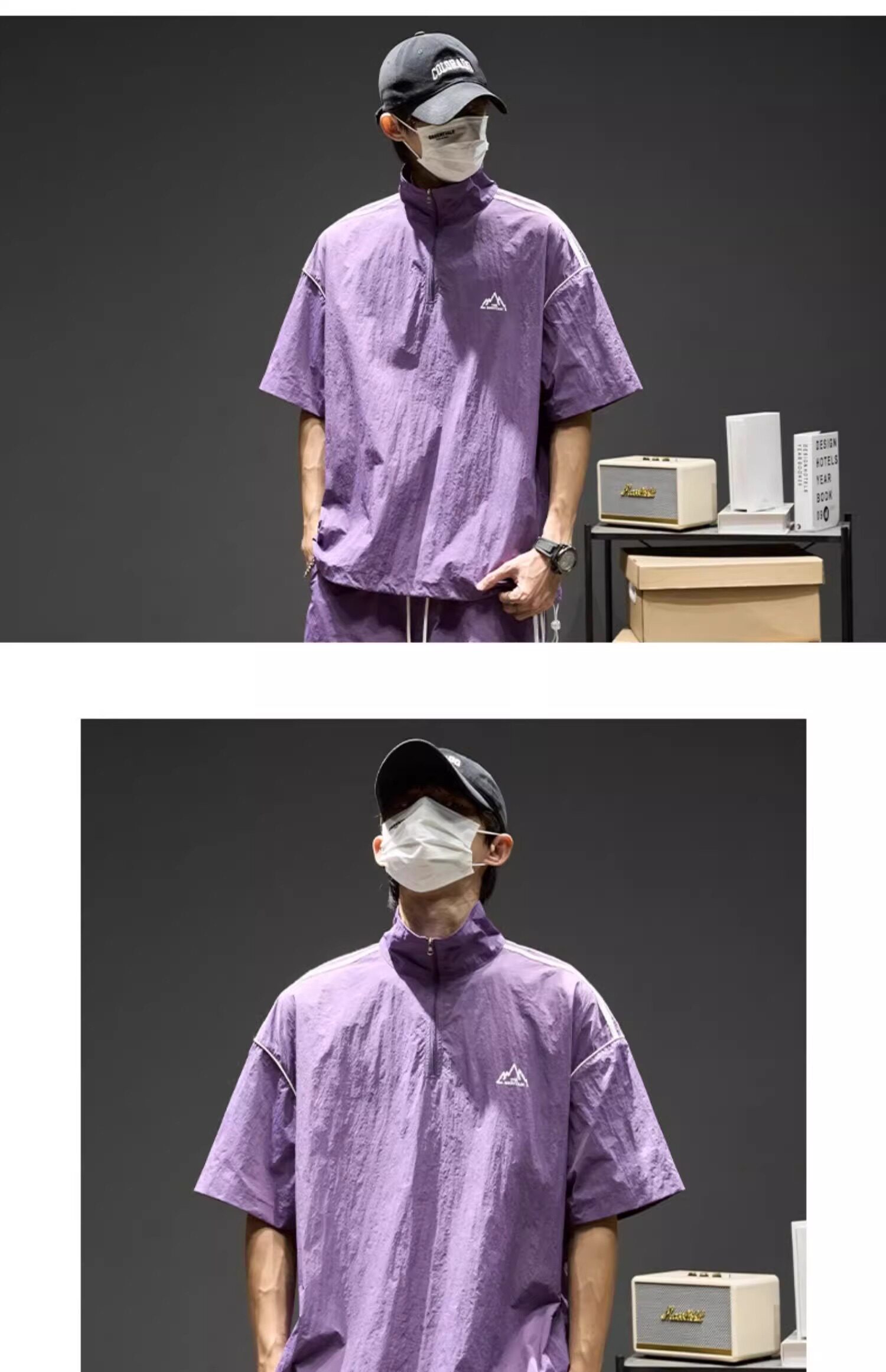 Trendy Brand Ice Silk Suit for Men, Summer Thin Sports Casual Half-Zip Stand Collar Striped Short-Sleeve Shorts Two-Piece Set