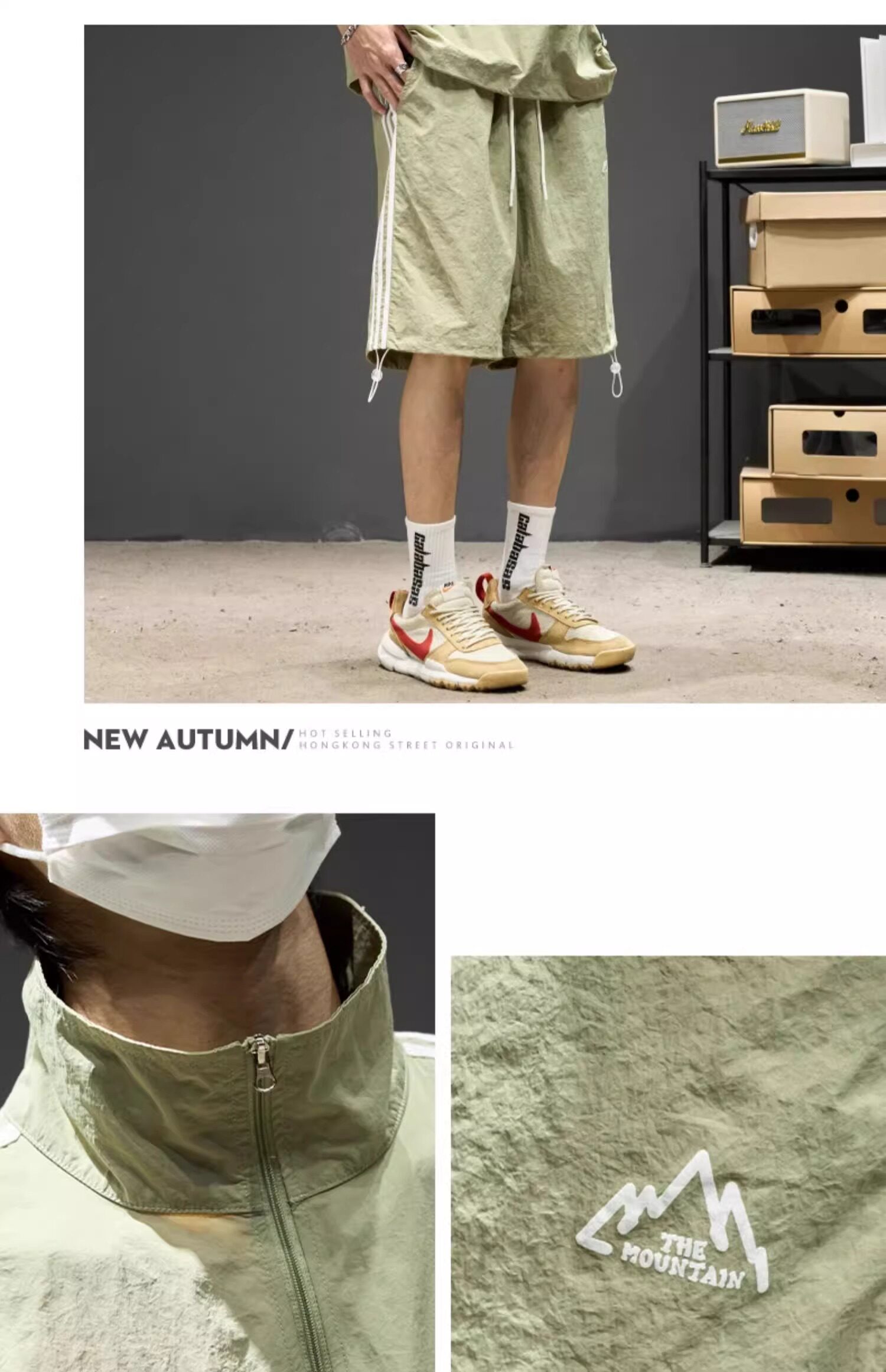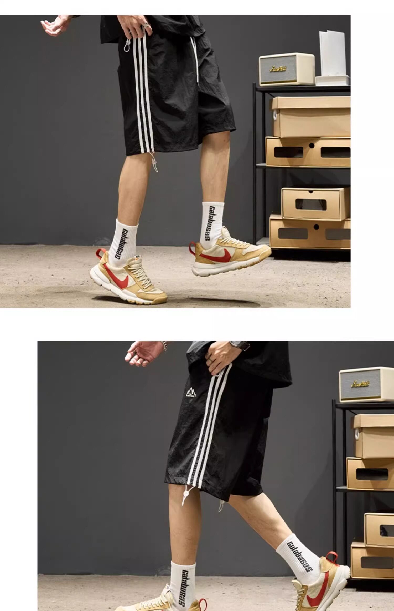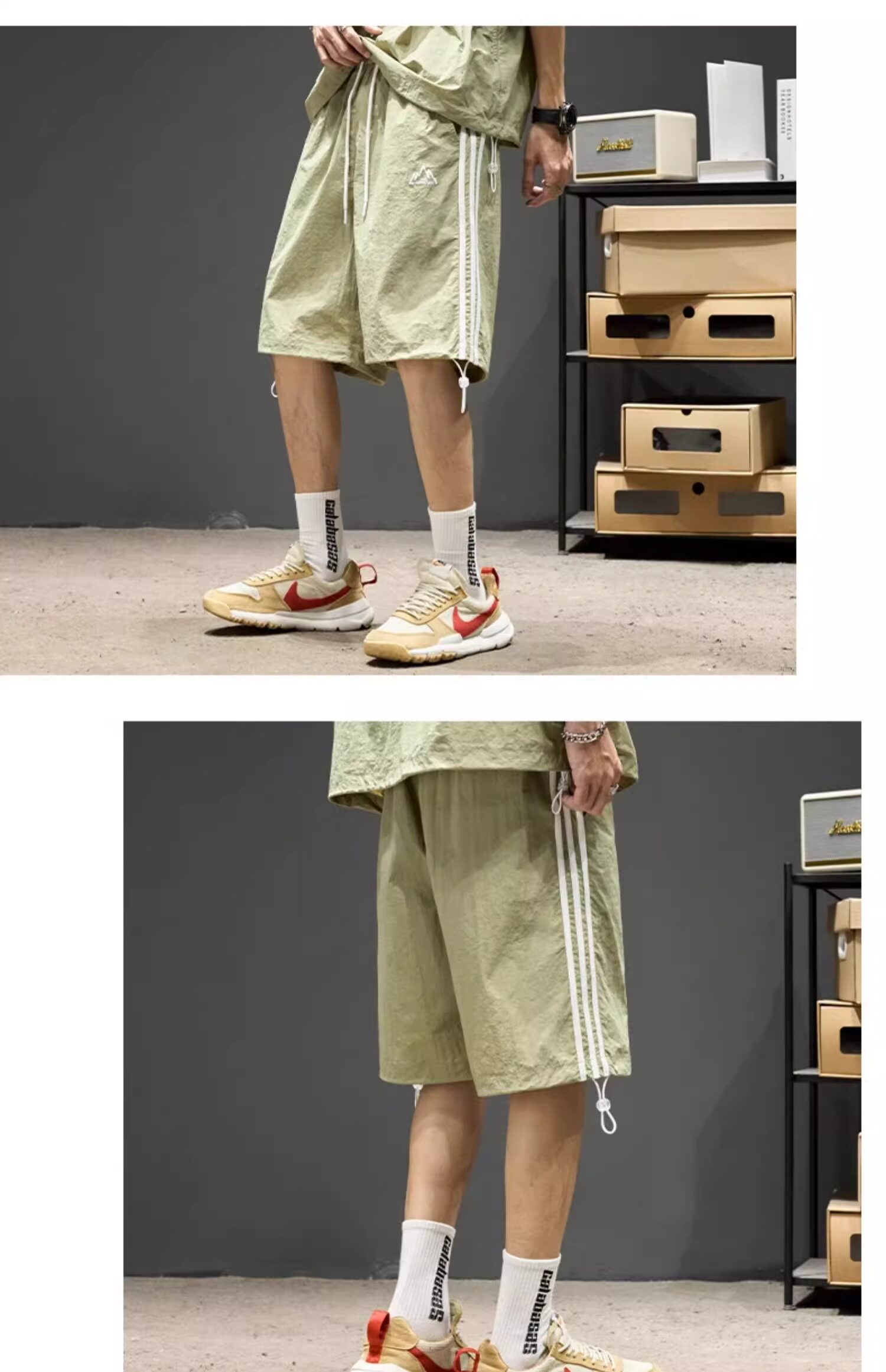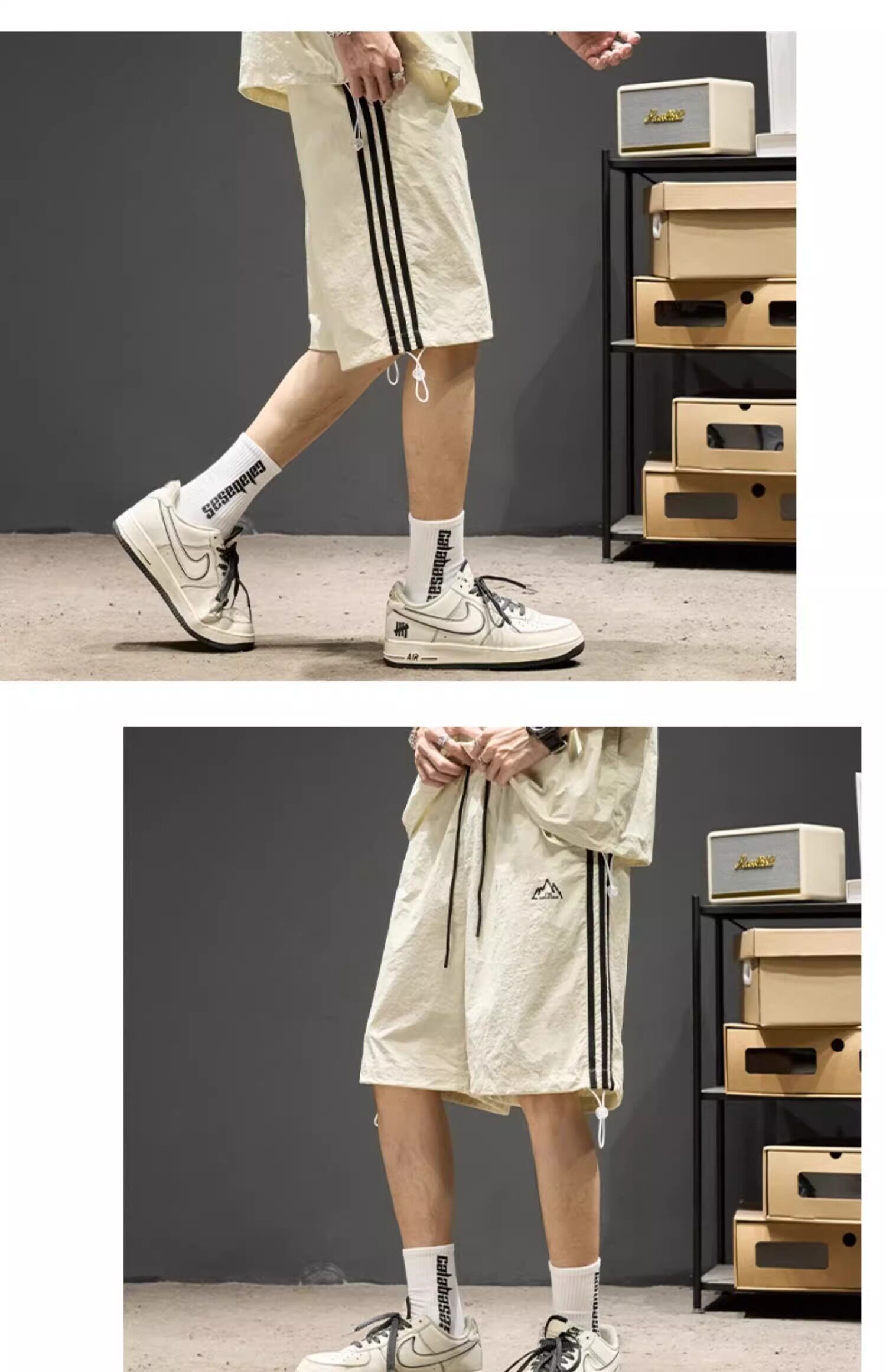 Trendy Brand Ice Silk Suit for Men, Summer Thin Sports Casual Half-Zip Stand Collar Striped Short-Sleeve Shorts Two-Piece Set