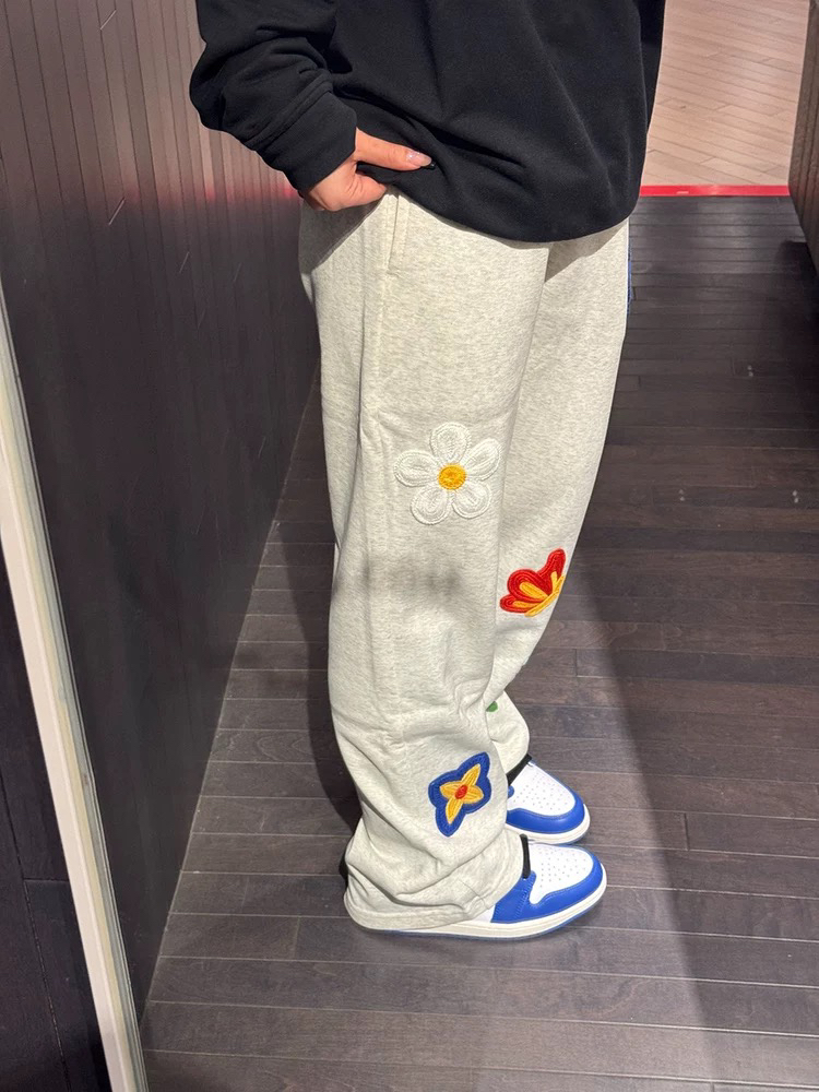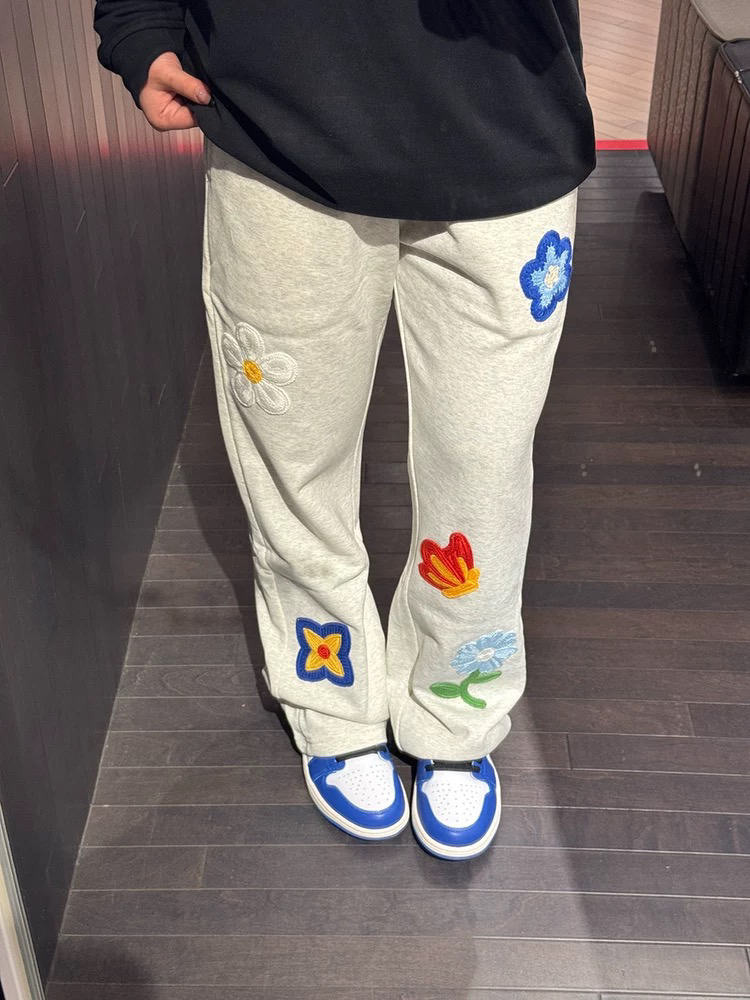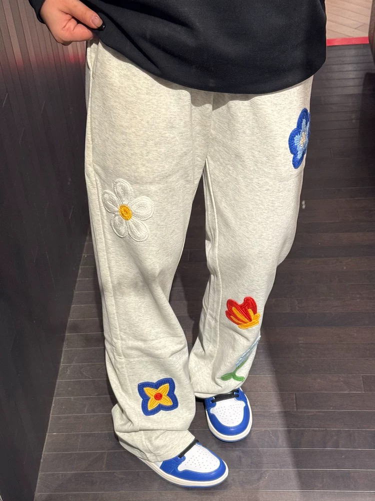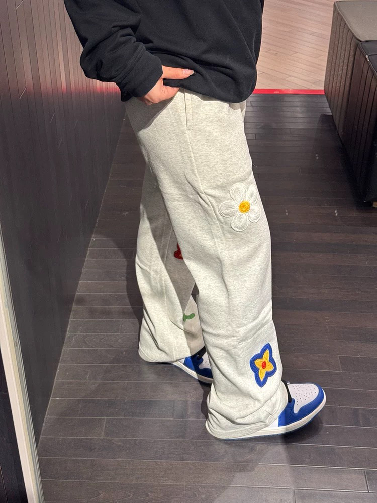 American-Style Floral Embroidered Scimitar Sweatpants for Men, Niche Design, Loose Casual Sports Cleanfit Flared Straight-Leg Pants