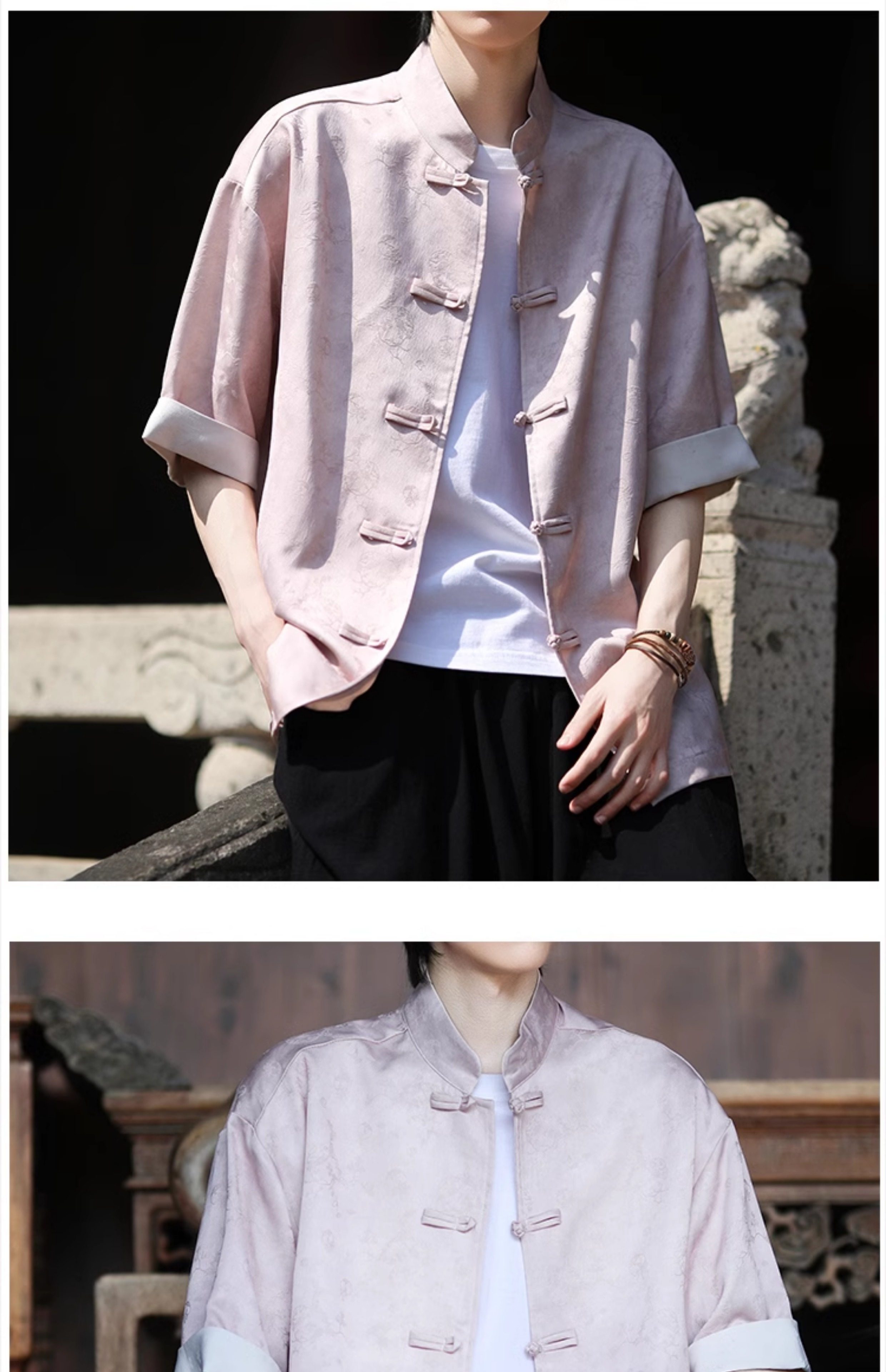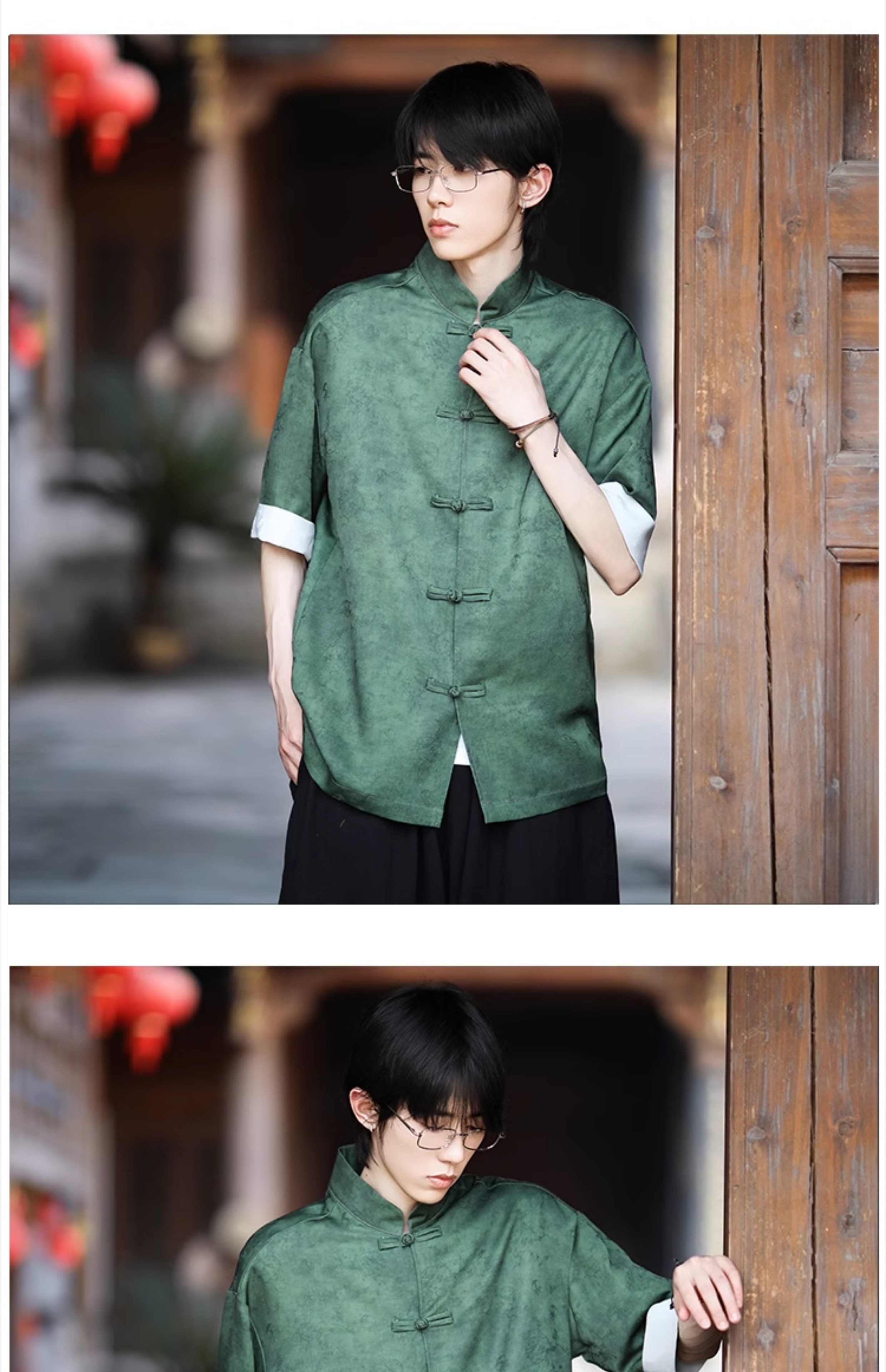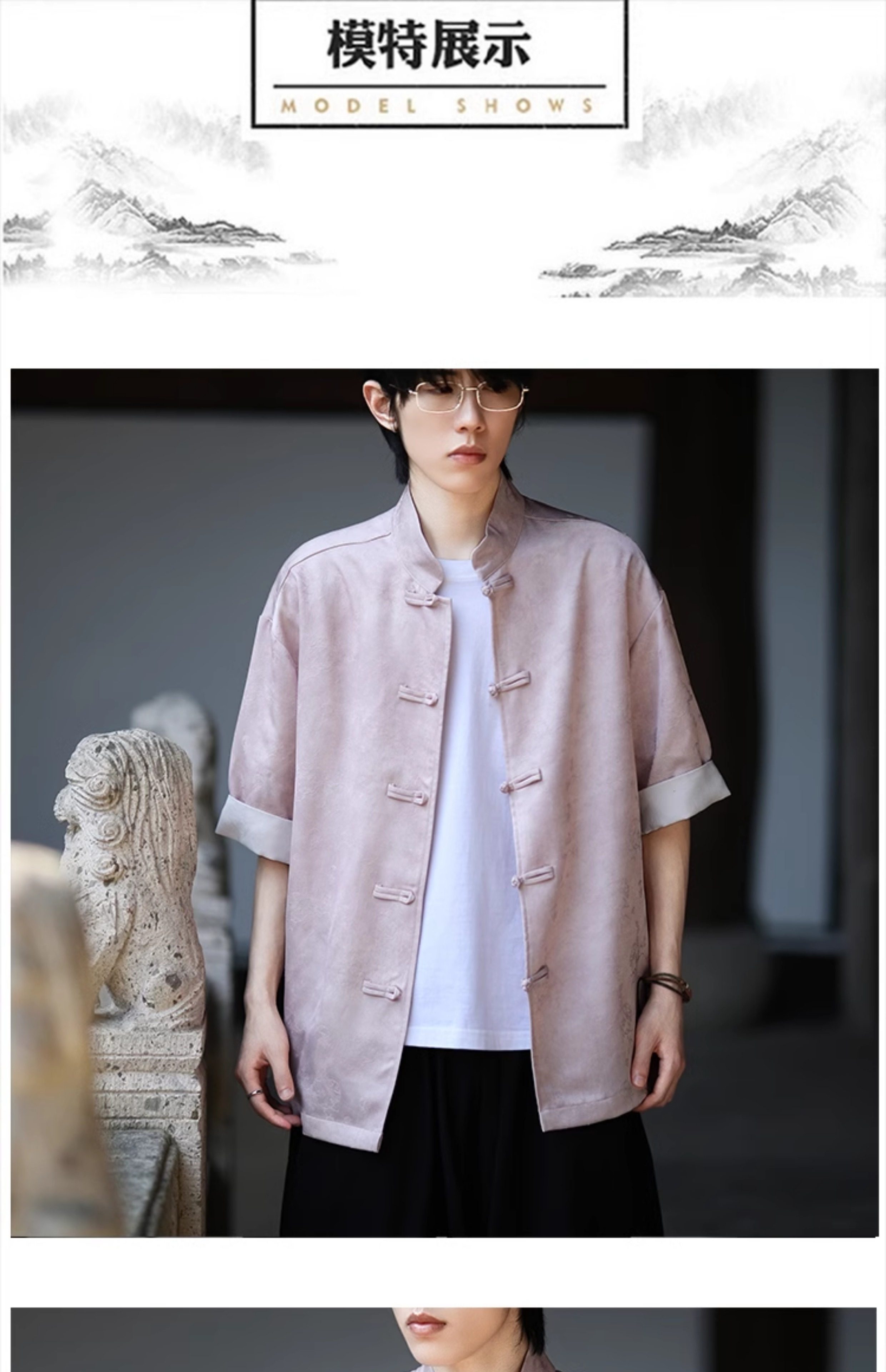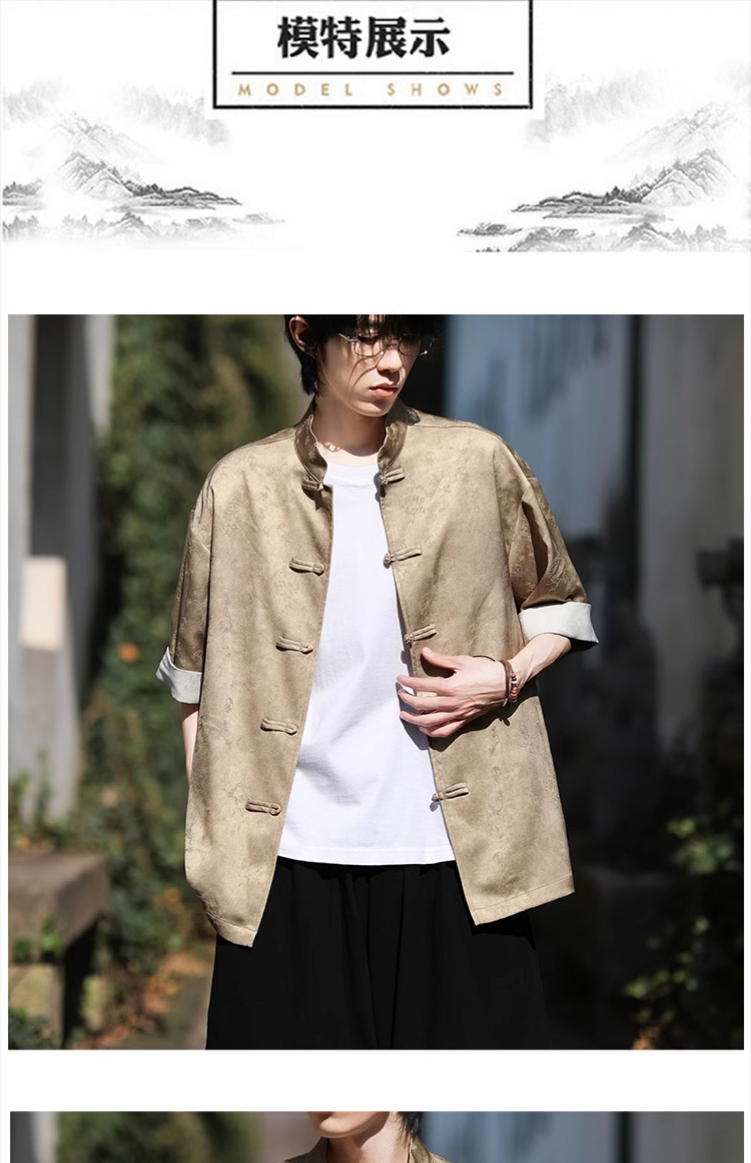 Chinese Style Men's Summer Thin Embossed Short-Sleeved Shirt, Retro Tang Suit with Stand Collar and Button Closure, Hanfu New Chinese Style Shirt