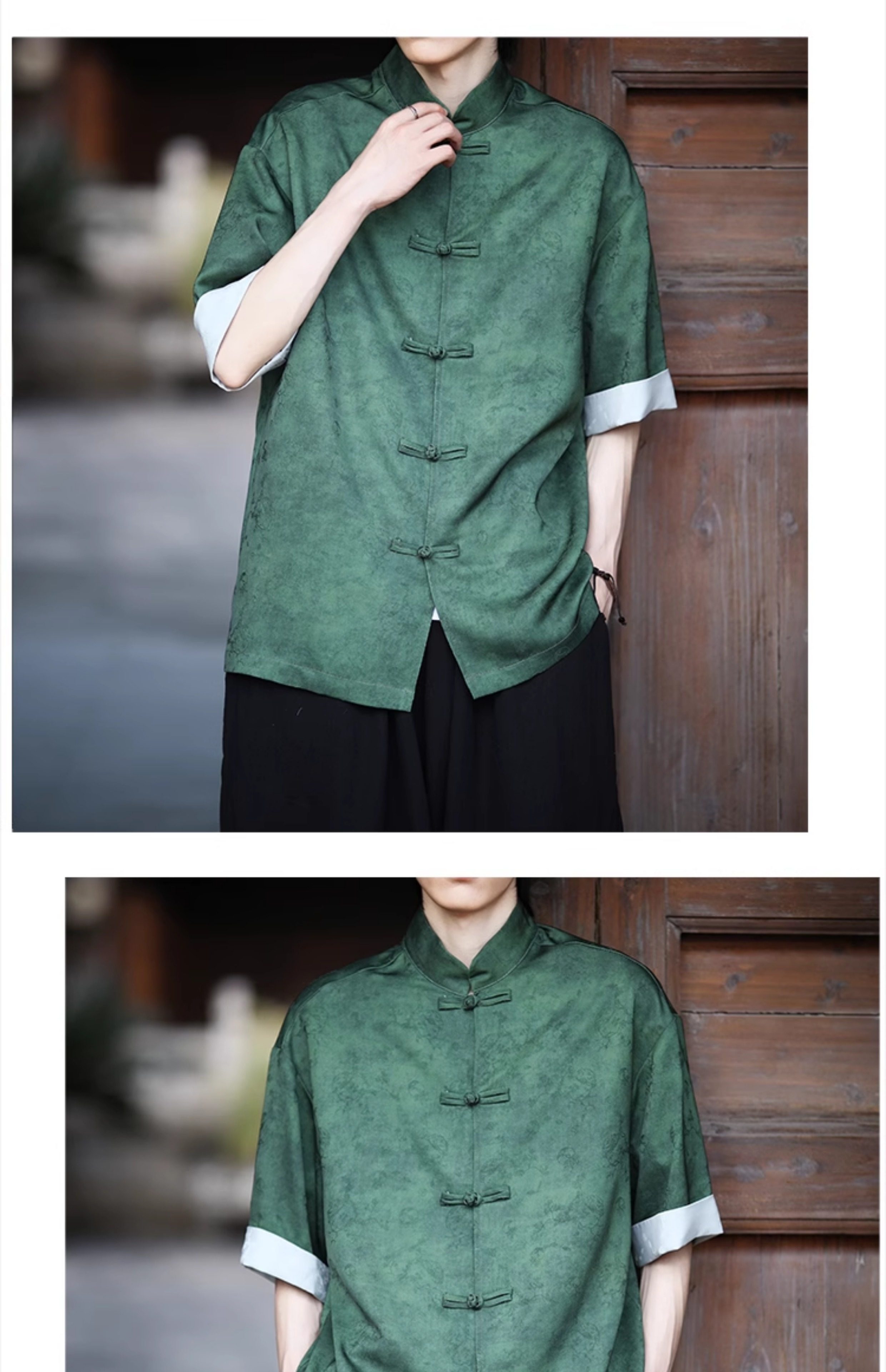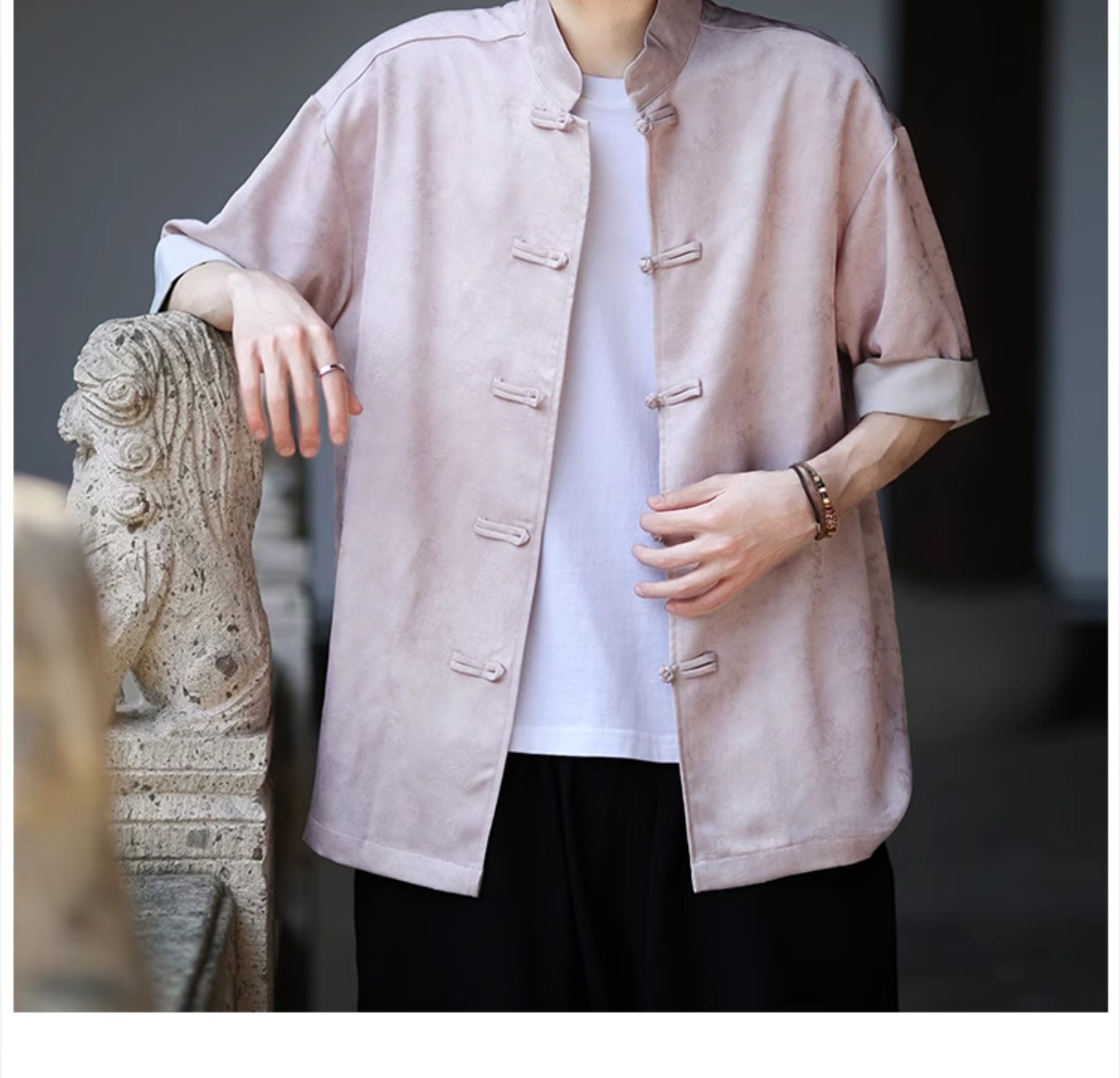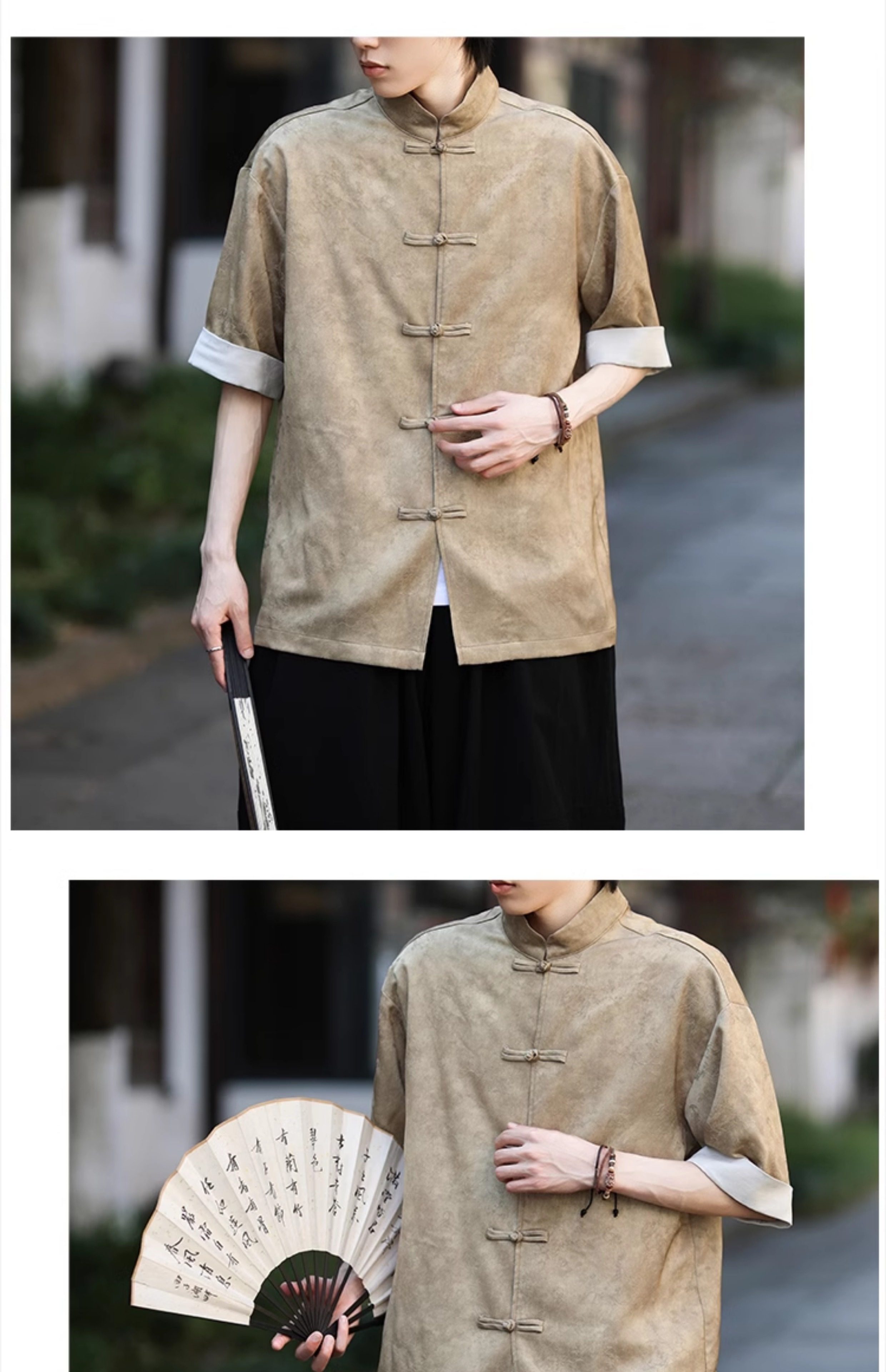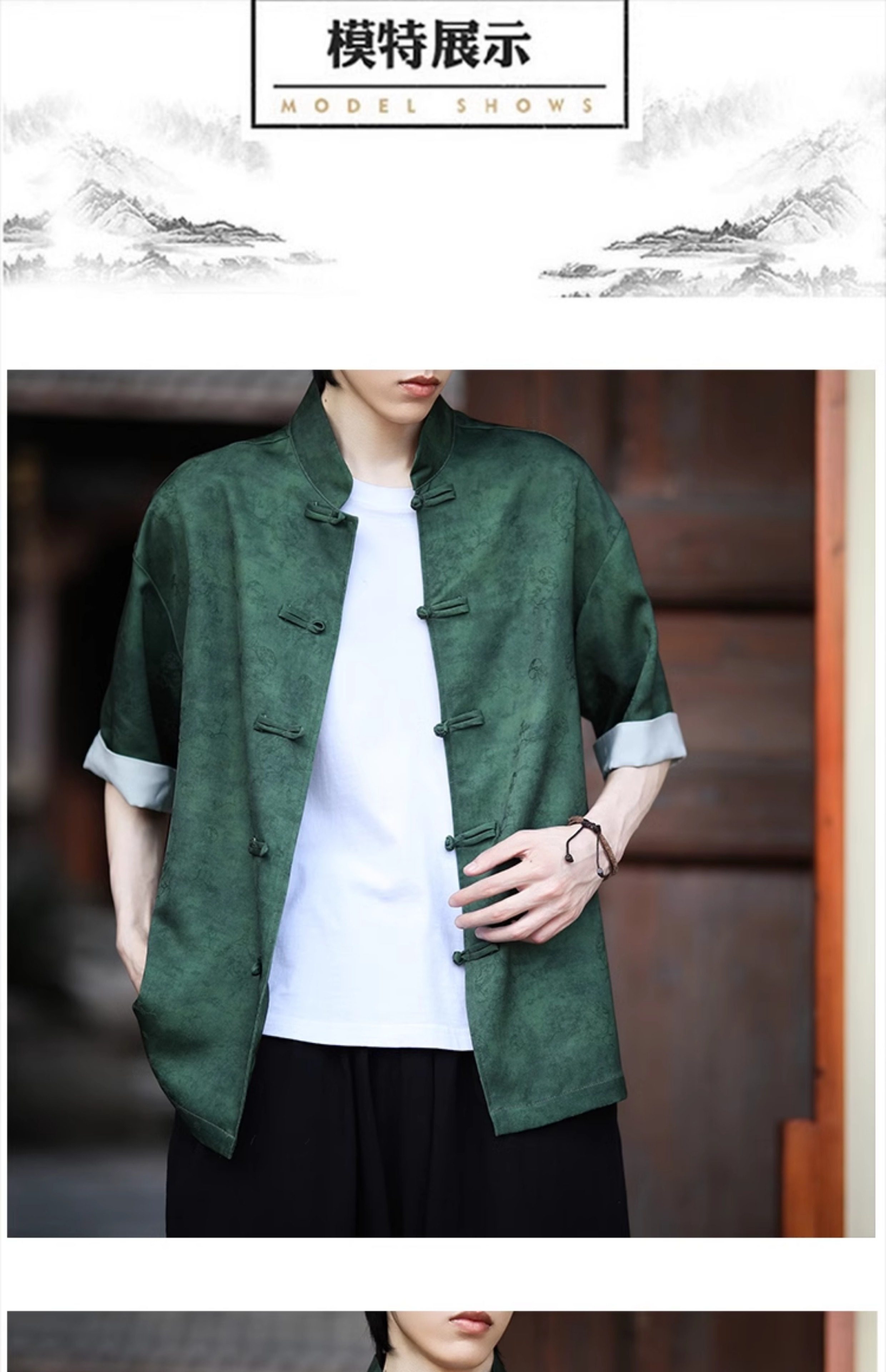 Chinese Style Men's Summer Thin Embossed Short-Sleeved Shirt, Retro Tang Suit with Stand Collar and Button Closure, Hanfu New Chinese Style Shirt