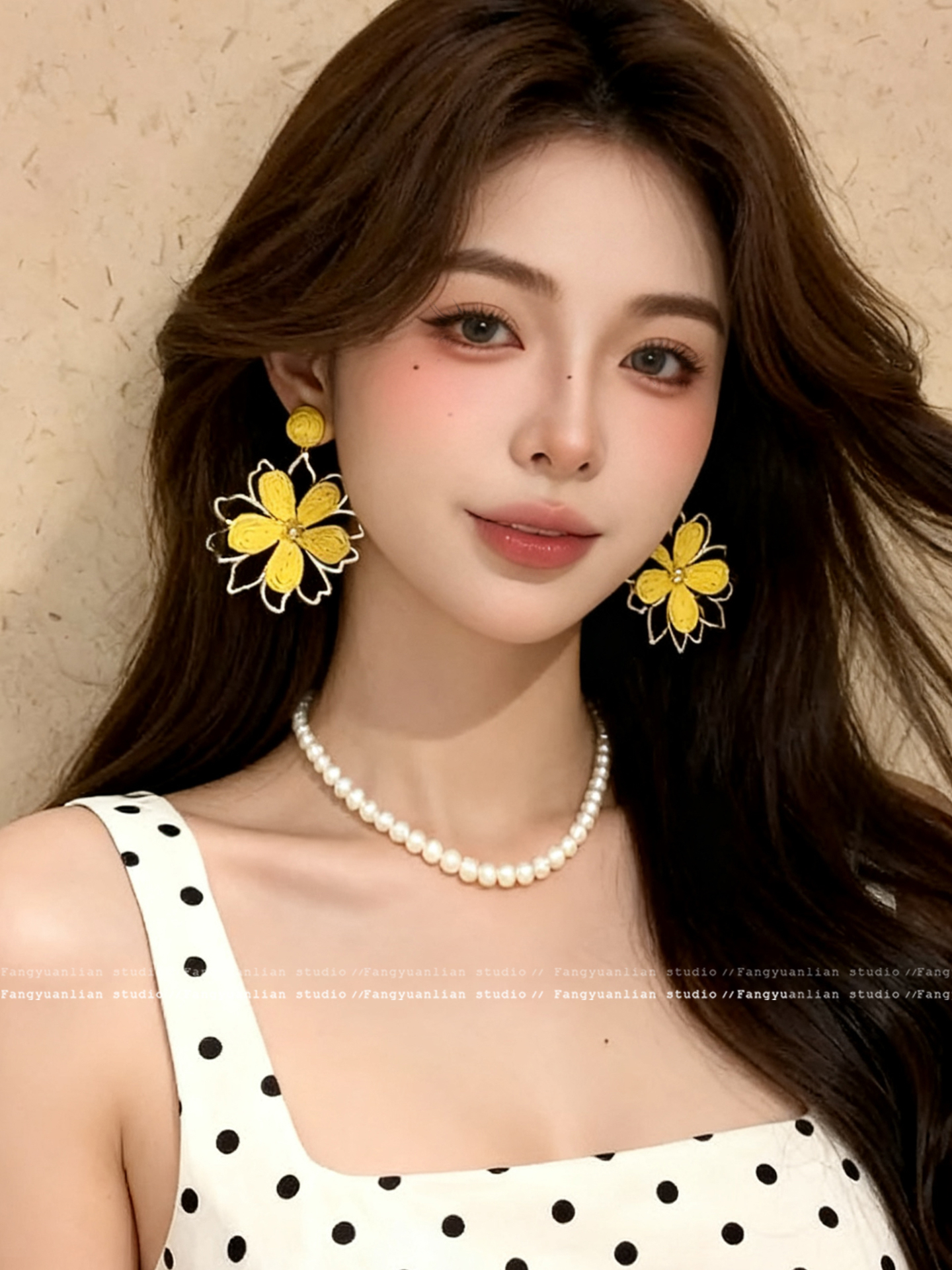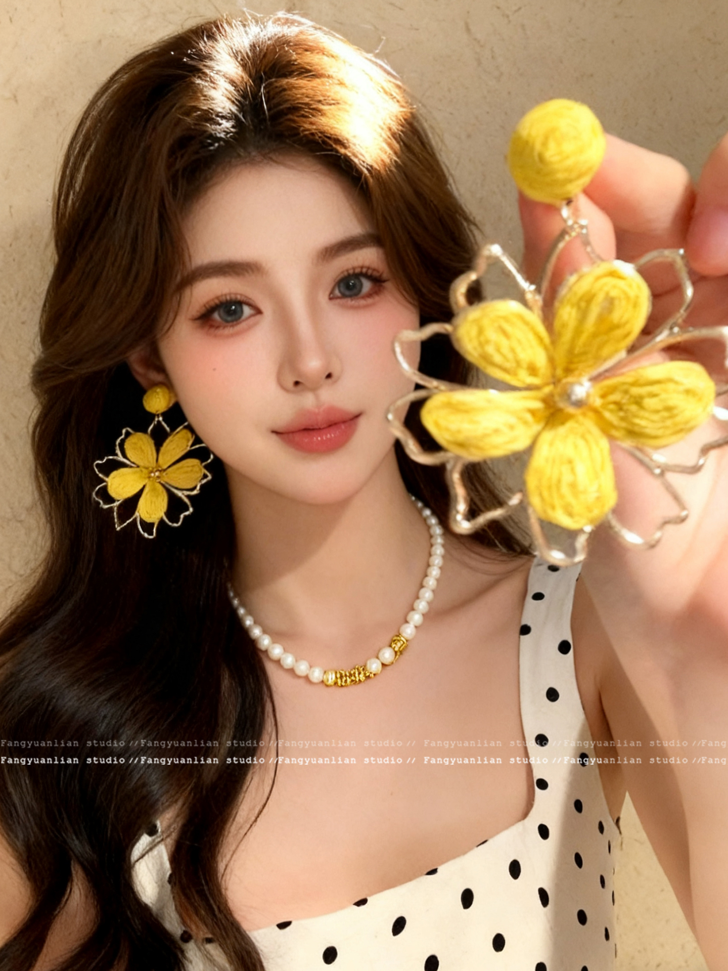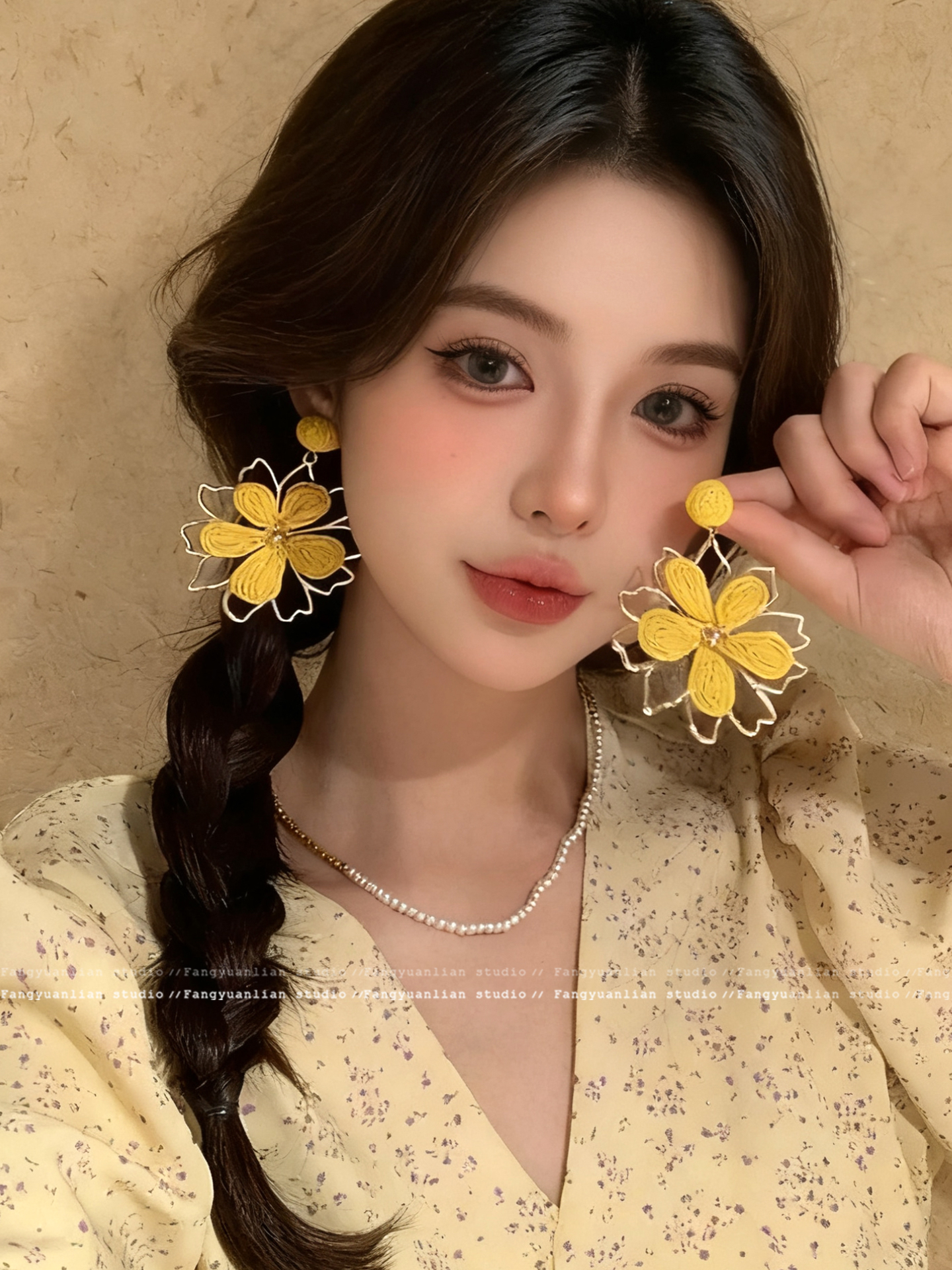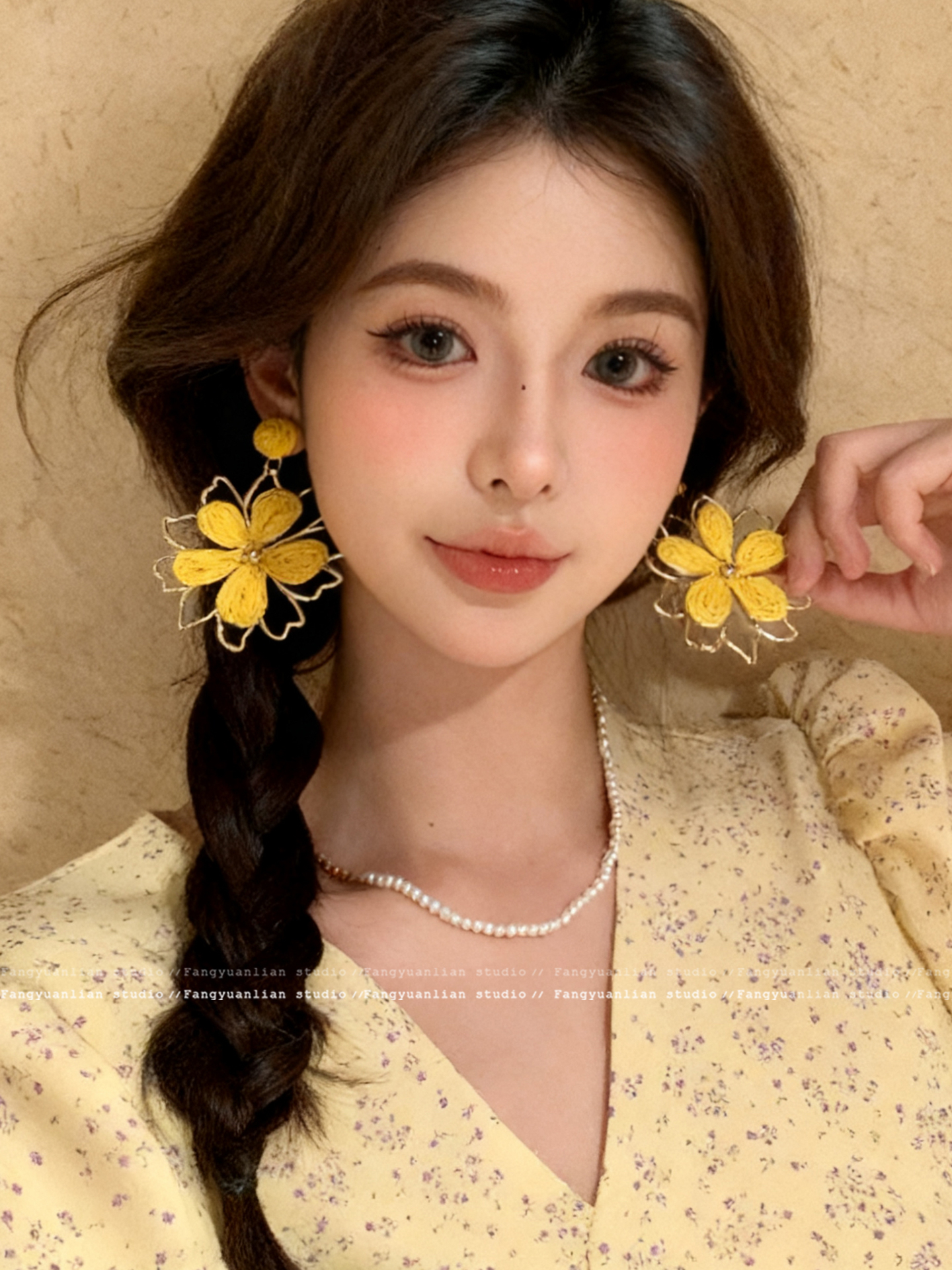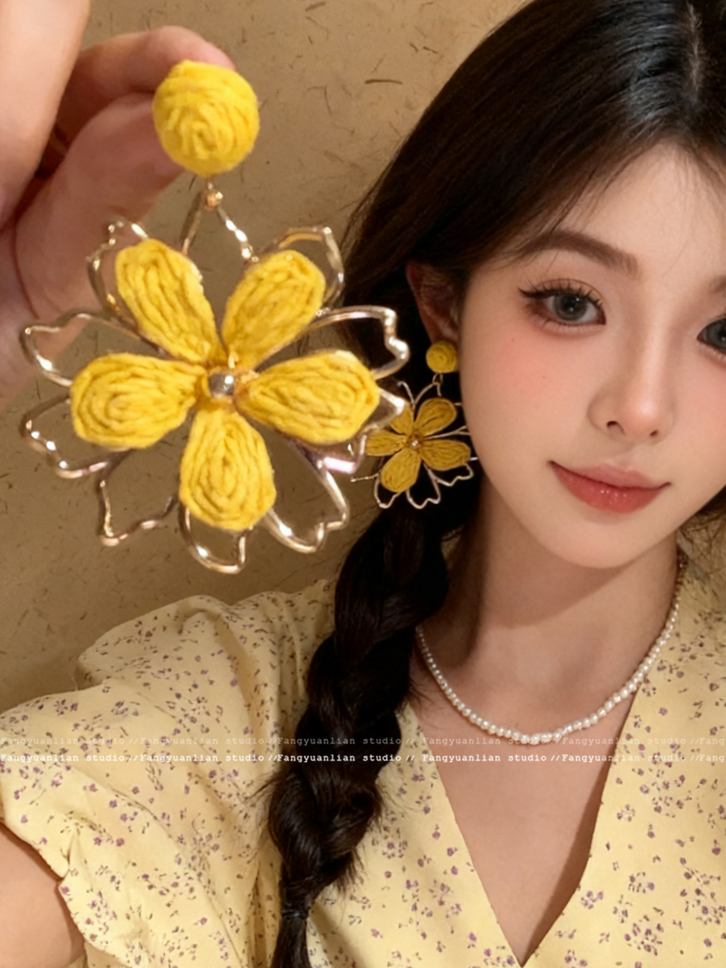 Wind-Blown Island Vacation Style Woven Sunflower Earrings for Women, High-End Earrings, Exaggerated Seaside Stunning Ear Studs