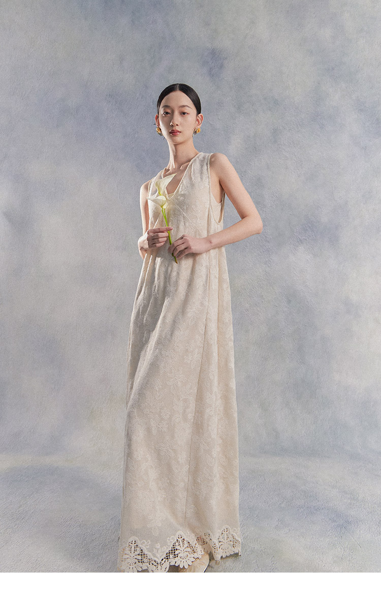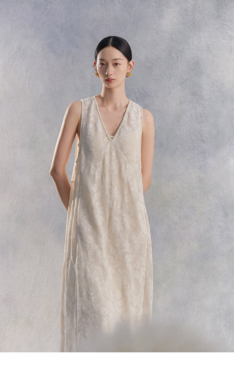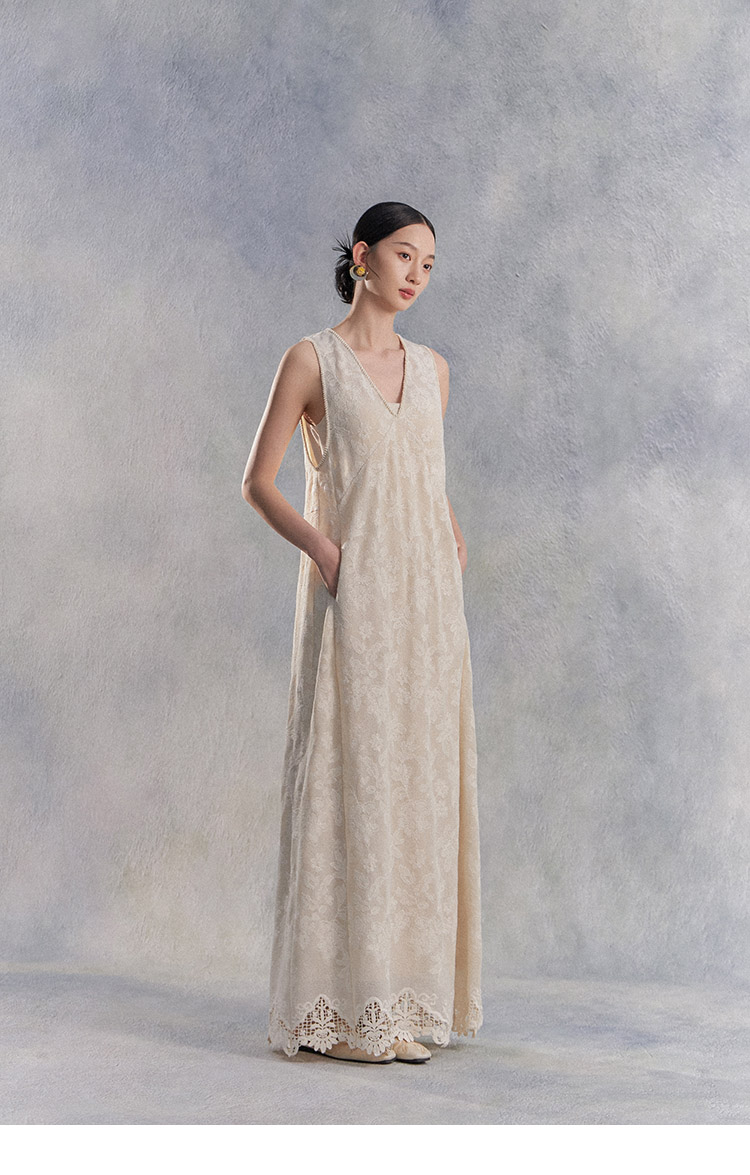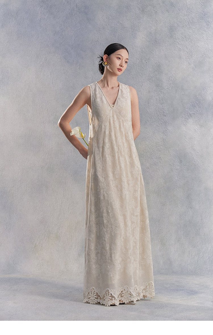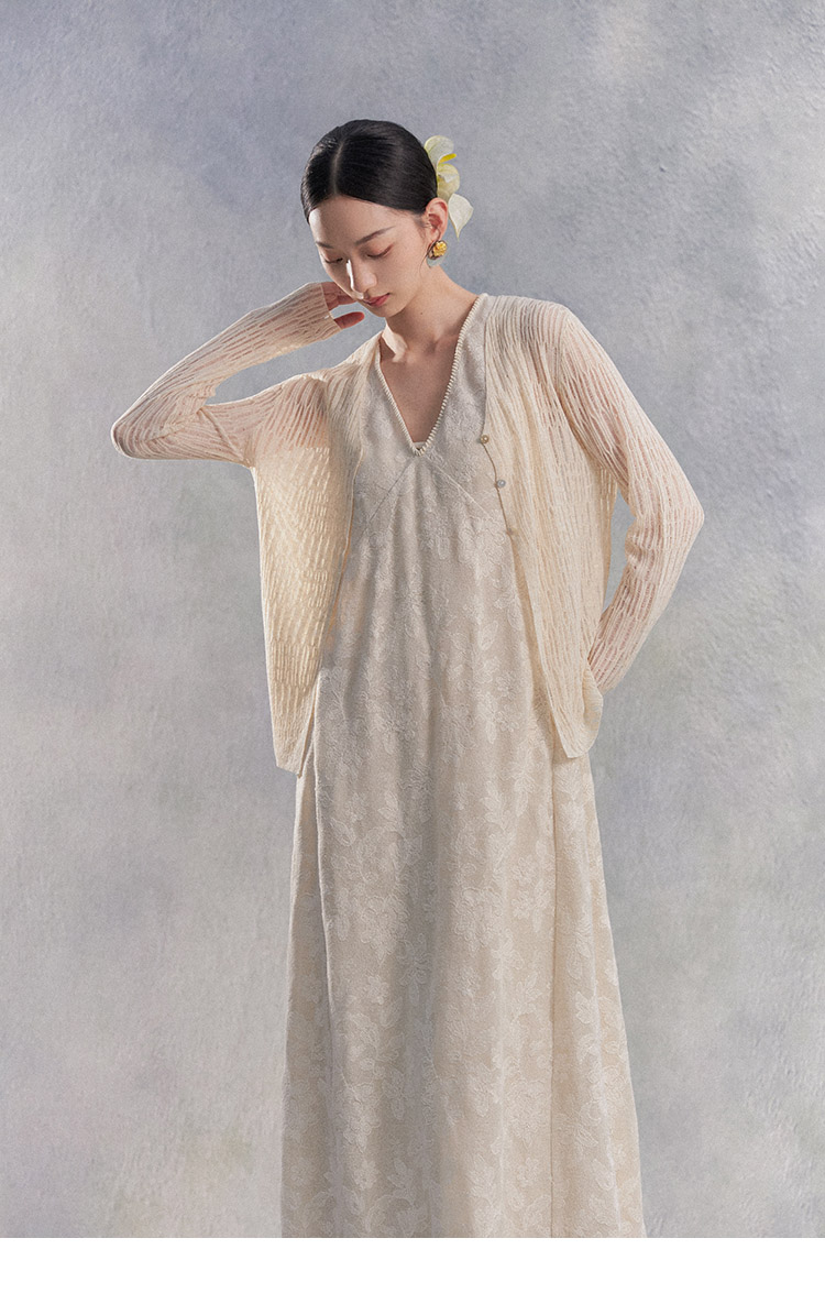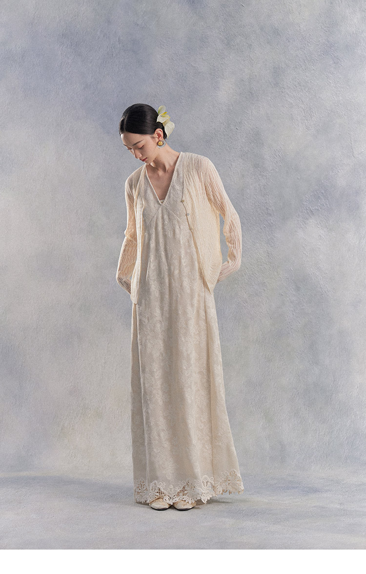 Nian Shier [Xiaoya·Qianbian] Grass and Plant Embroidery Knitted V-Neck Long Dress with Beaded Lace Chinese-Style Dress