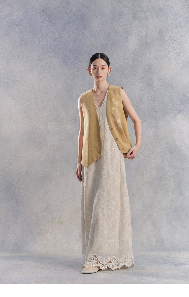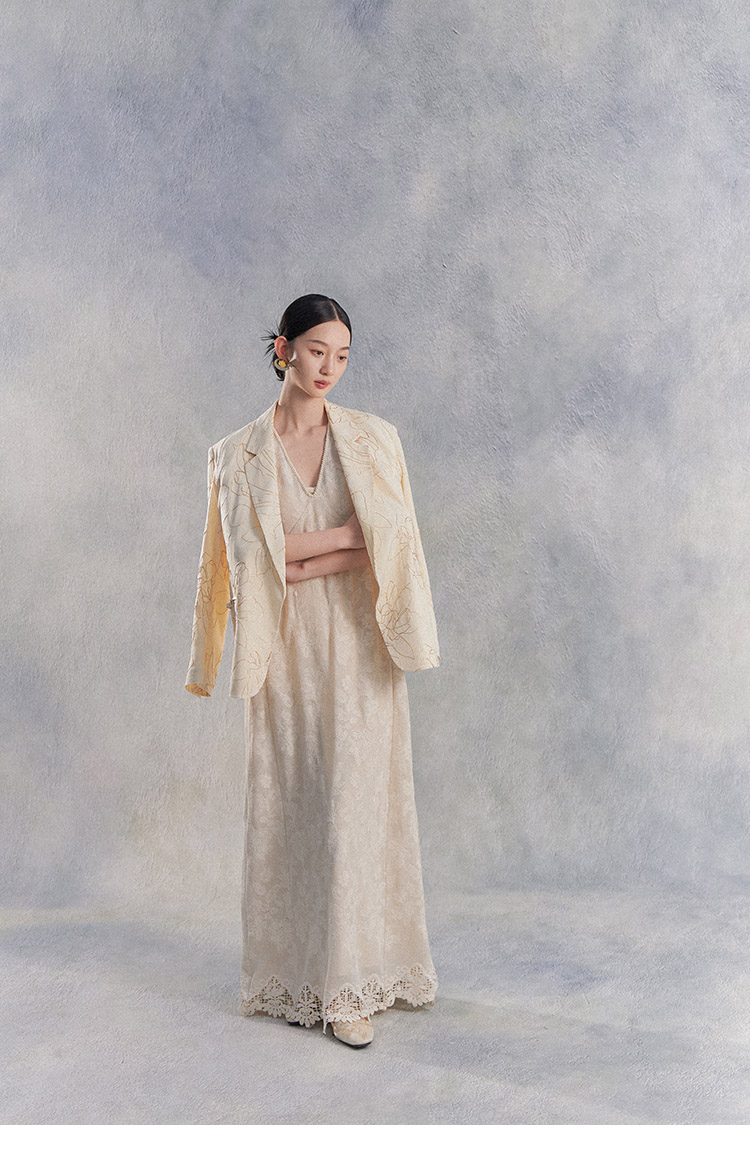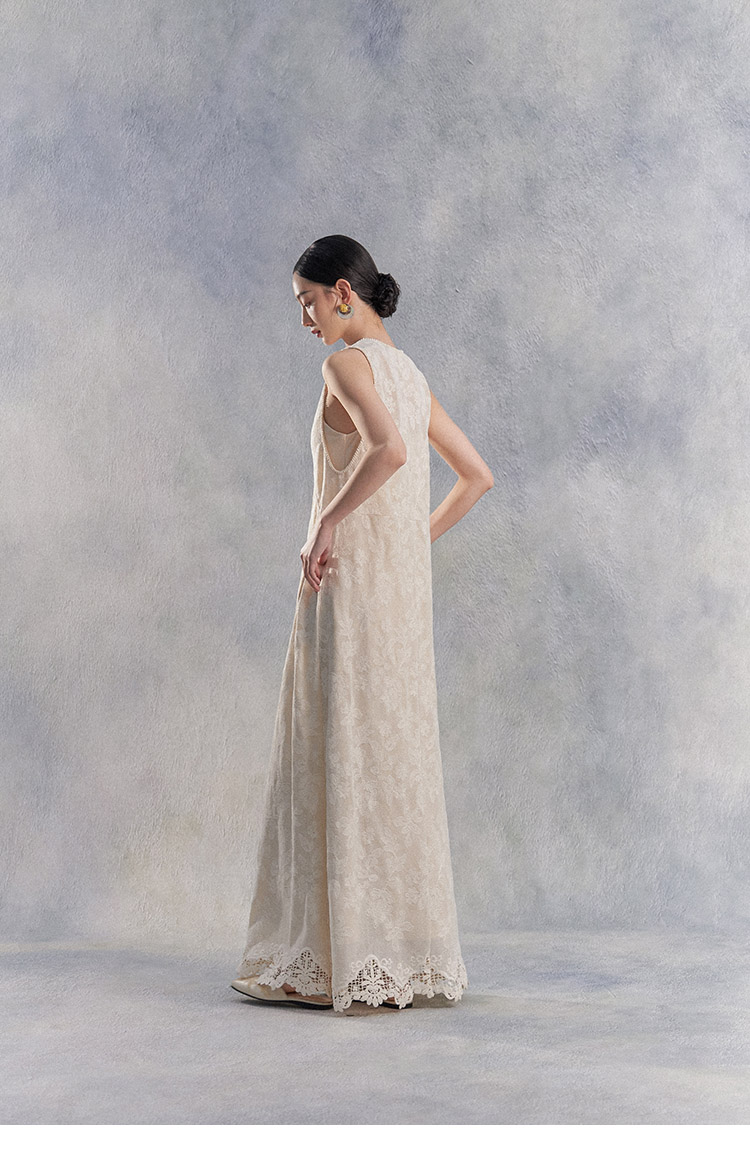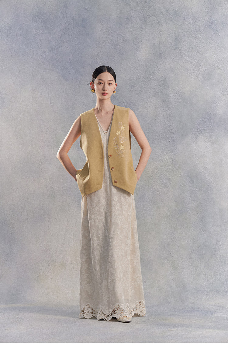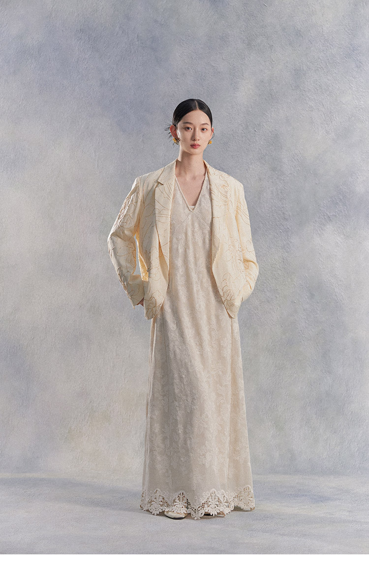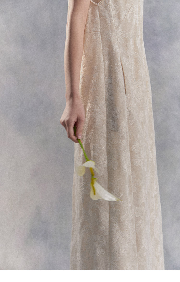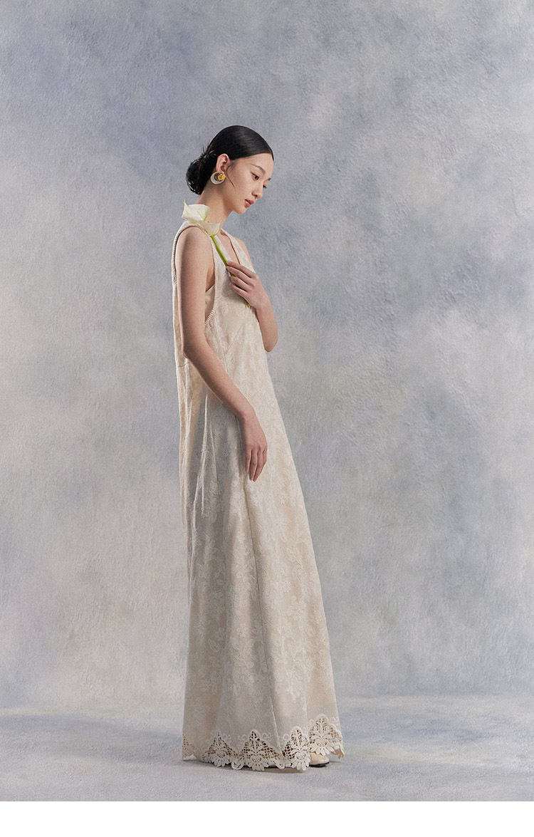 Nian Shier [Xiaoya·Qianbian] Grass and Plant Embroidery Knitted V-Neck Long Dress with Beaded Lace Chinese-Style Dress