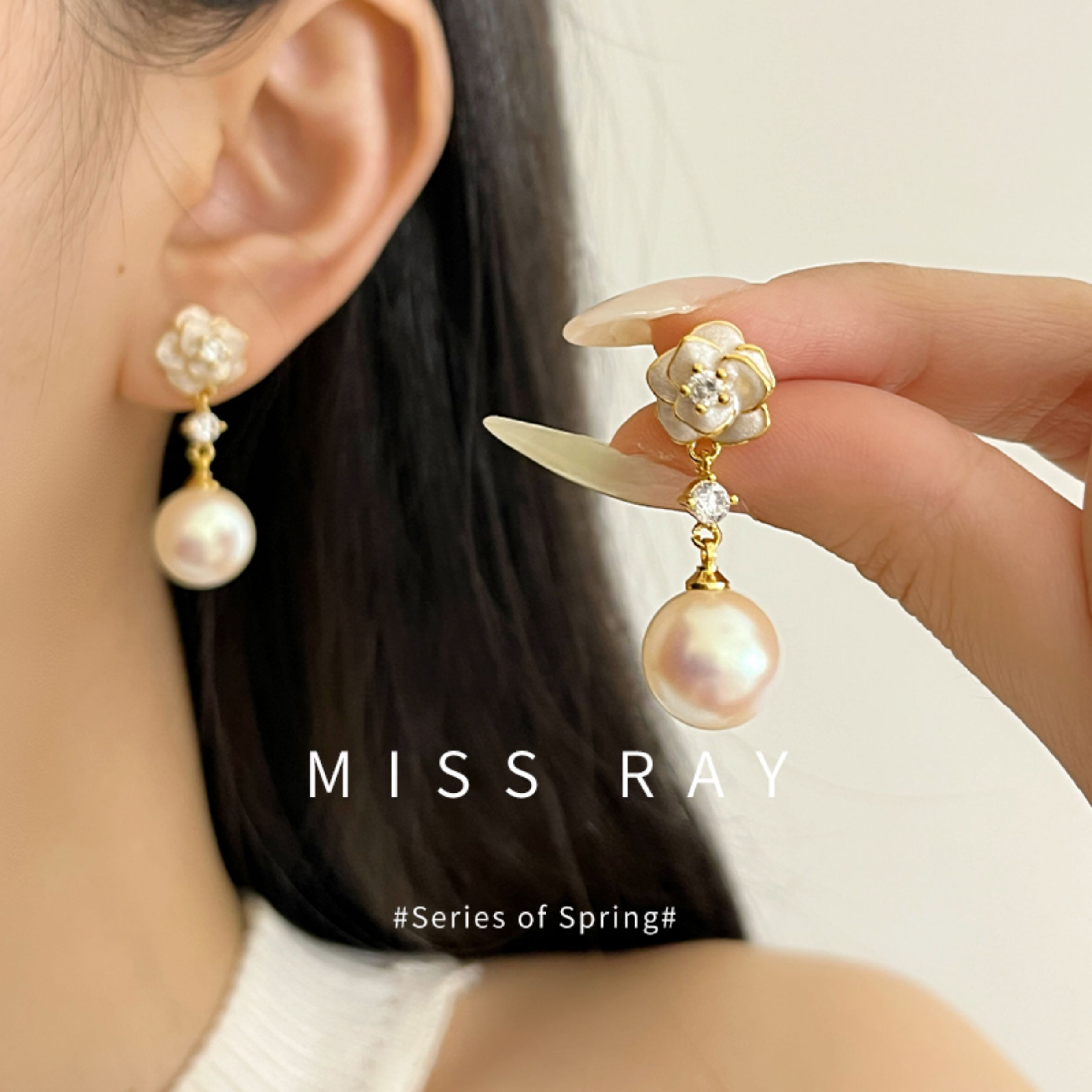Cloud Mist Camellia Gentle Little Fragrance Style Flower Pearl Tassel Non-Pierced Mosquito Coil Ear Clip French Earrings for Women