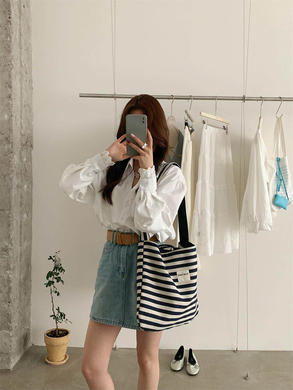 One-Shoulder Canvas Bag, Reversible, Korean Style, Lazy Style, Large Capacity, Simple Striped Casual Women's Bag for Work and Commuting