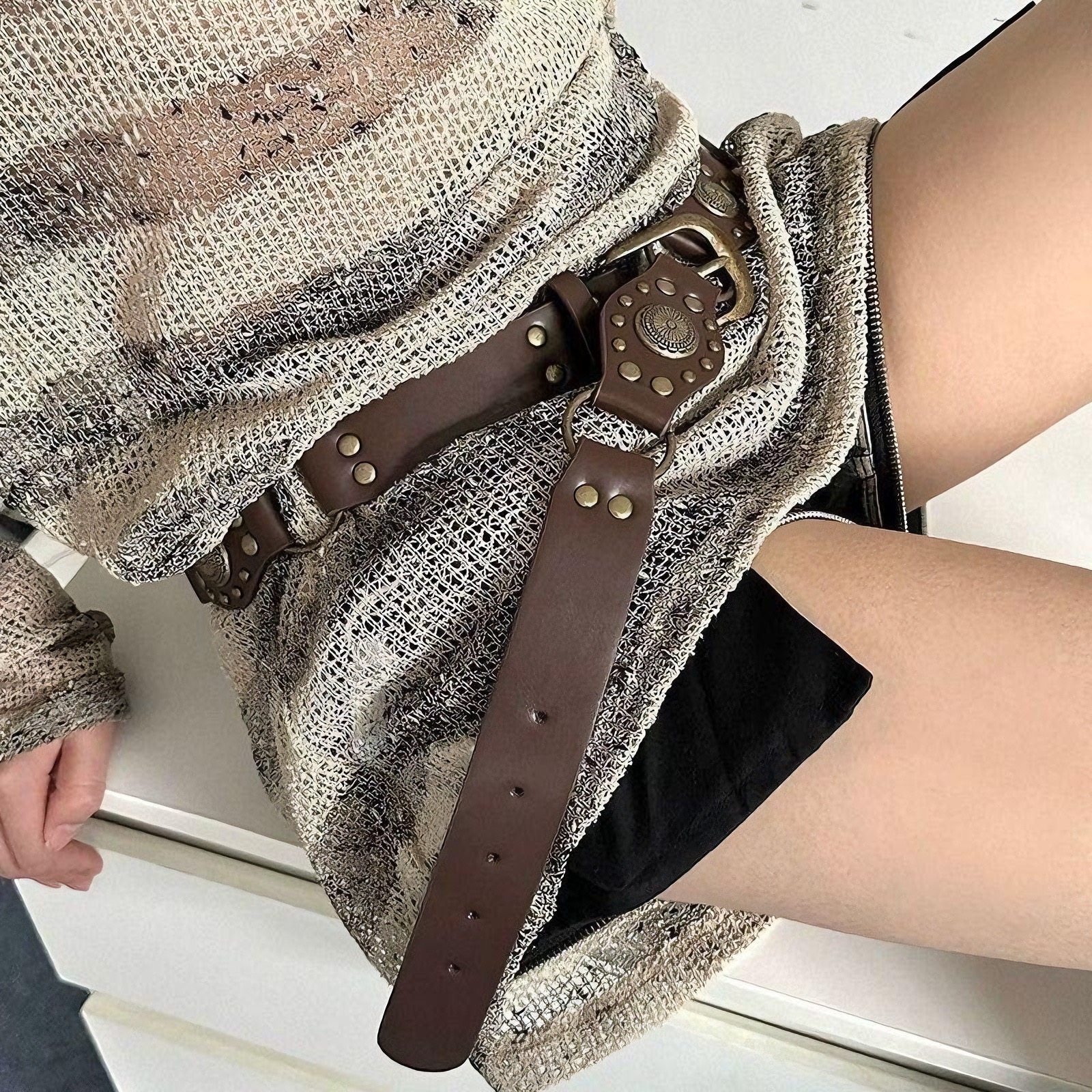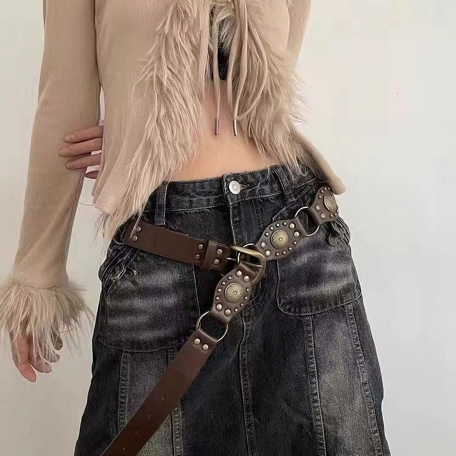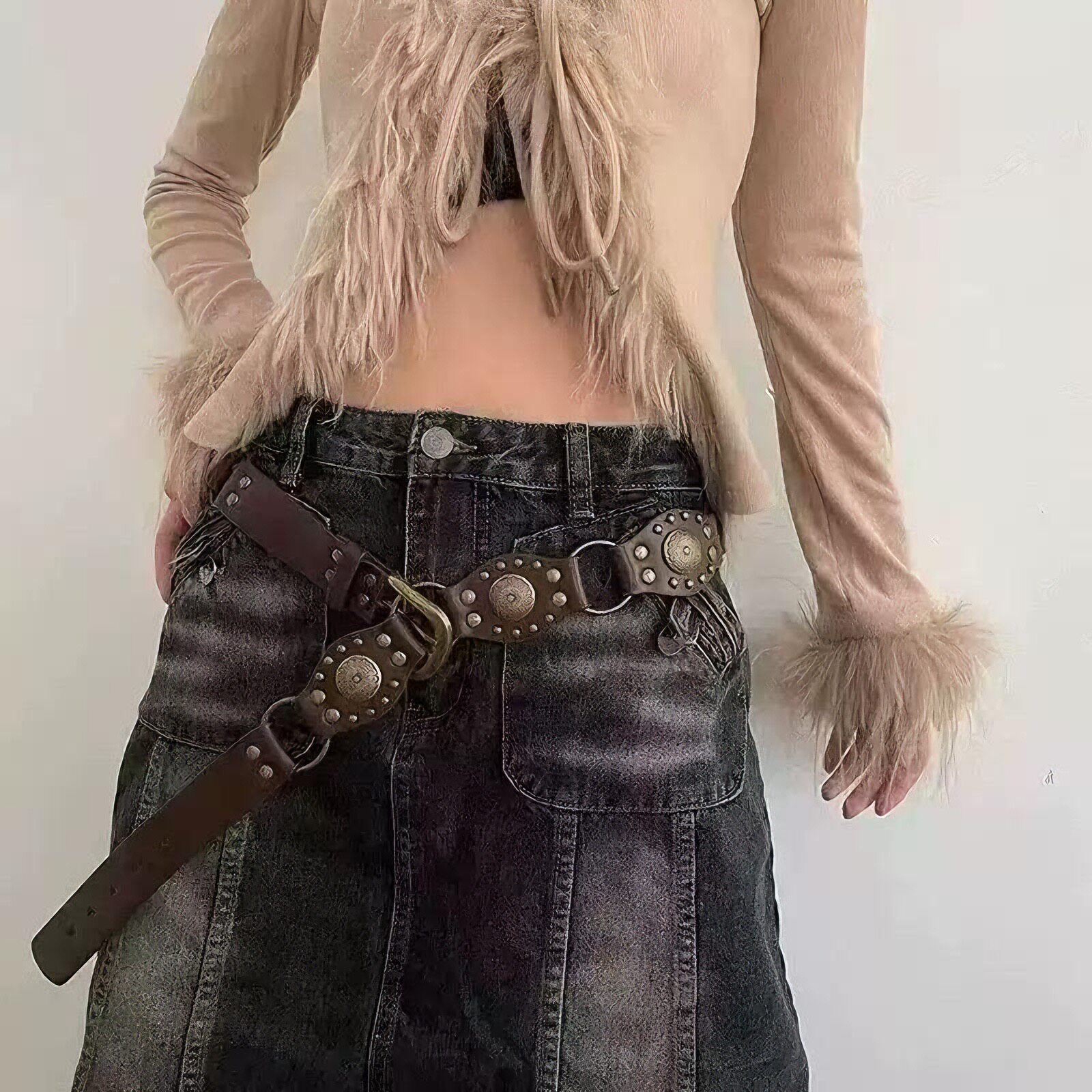 Vintage Belt with Brown Denim Patchwork, Studded Belt, Hot Girl American Style Hollow-Out ins Style Belt, Versatile Women's Belt