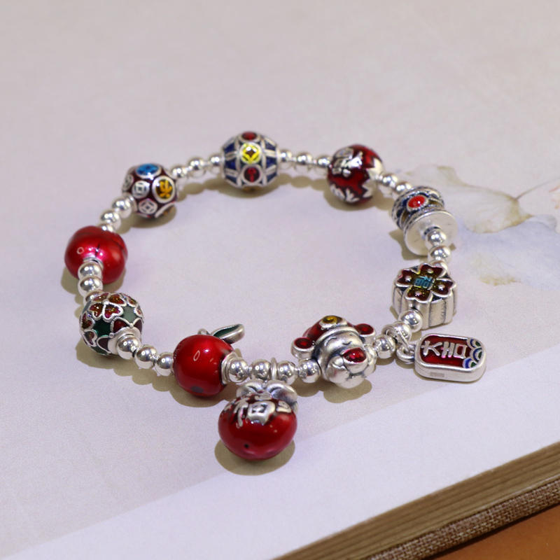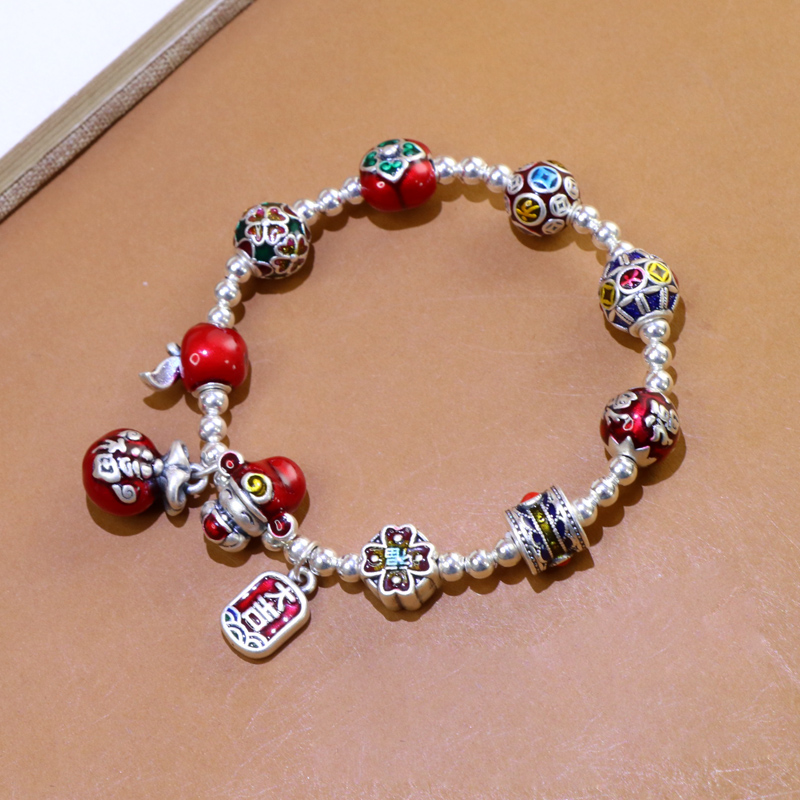 999 Pure Silver God of Wealth Bracelet Men's and Women's Multi-Treasure Bracelet New Chinese Style Money Bag Persimmon Accessories Burnt Blue Craft Jewelry