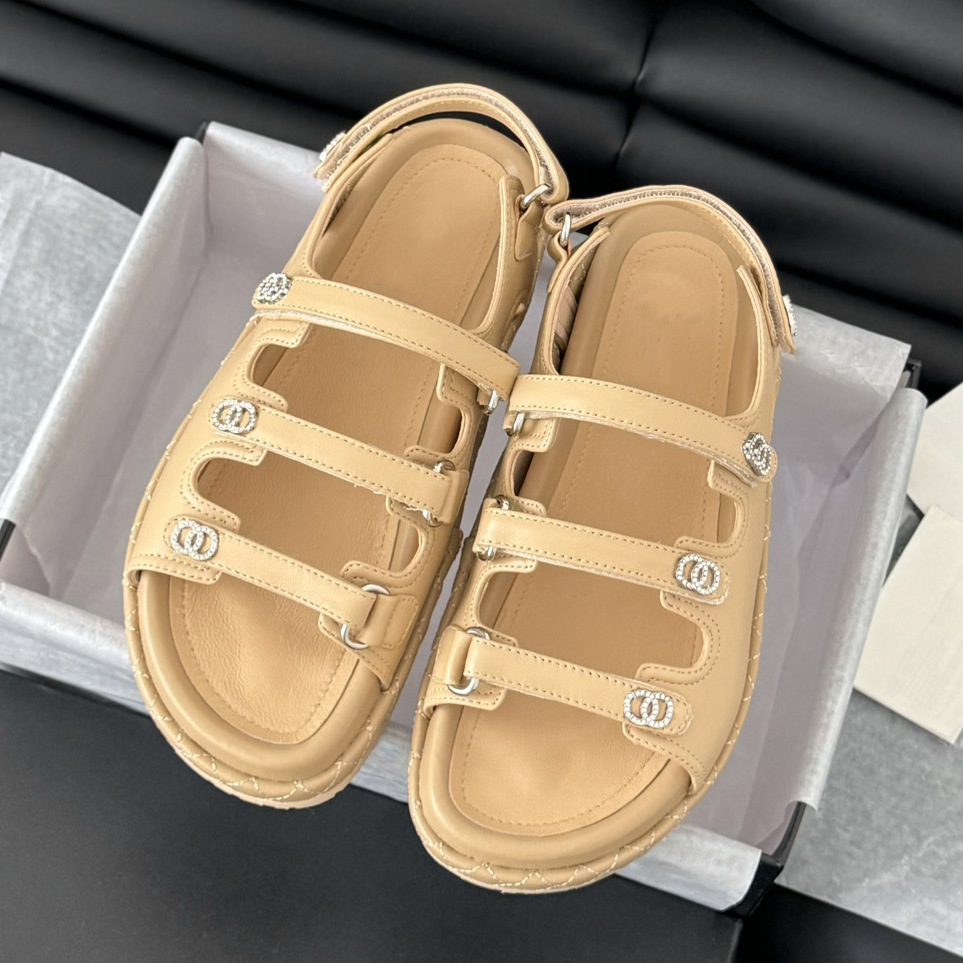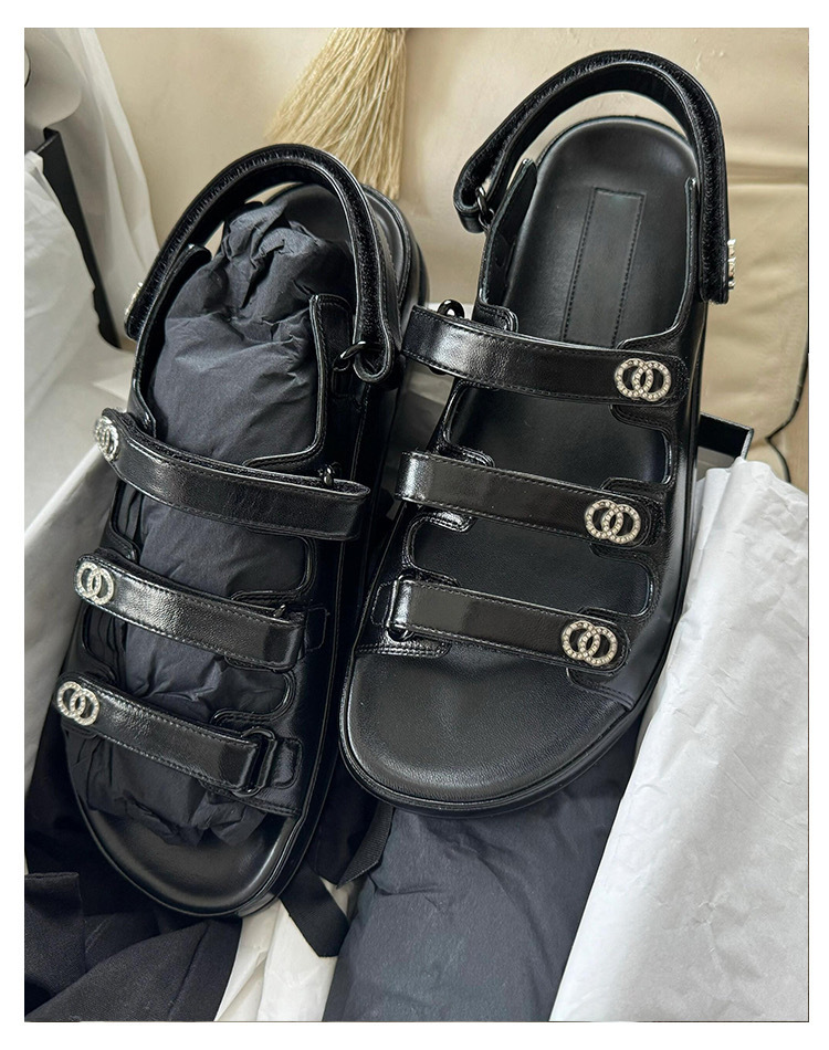 2025 New Model Chanel-Style Rhinestone Velcro Sandals for Women, Four-Strap Round Toe Open-Toe Thick-Soled Beach Shoes