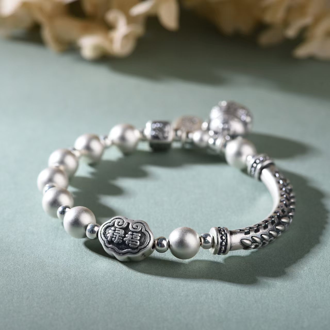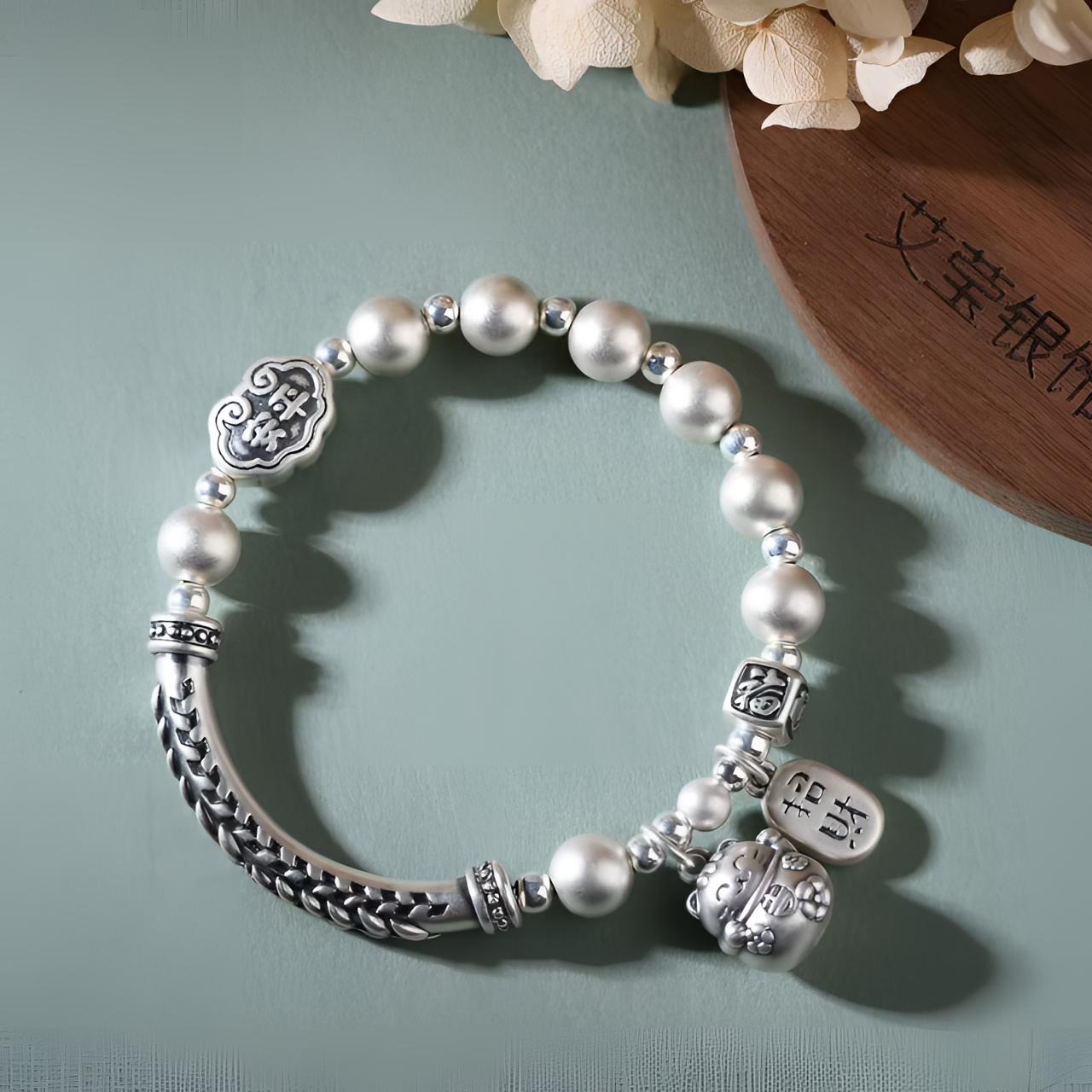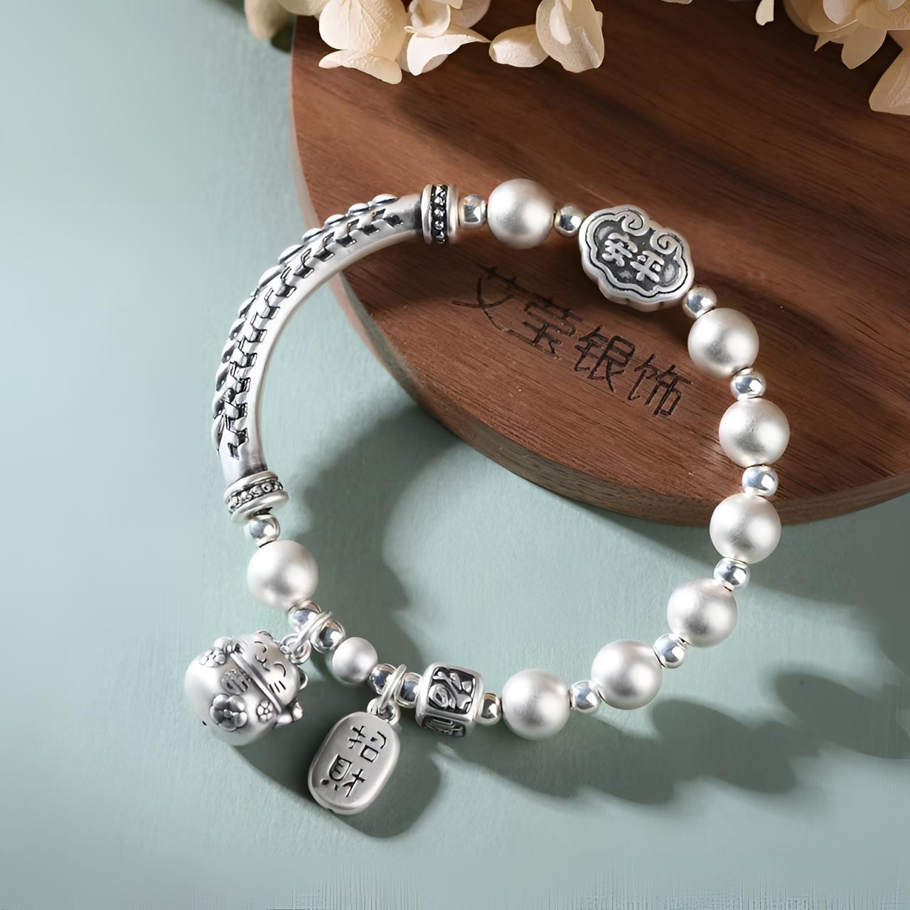 999 Pure Silver Wheat Ear Lucky Cat Bracelet for Women, Traditional Silver Bead Bracelet with the Character for Good Fortune, Peace Lock Half-Bracelet