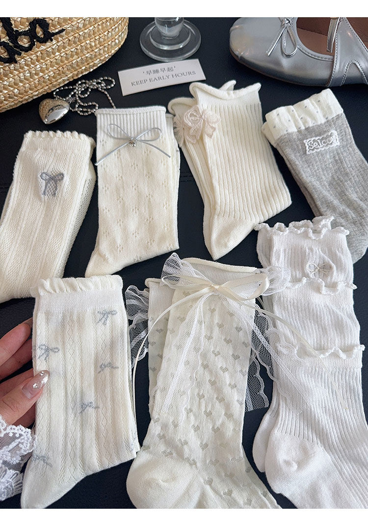 New White Lace Trim Socks for Women, Mid-Calf Socks, Summer Thin Cotton Socks with Bow, Jk Ballet Style Slouch Socks