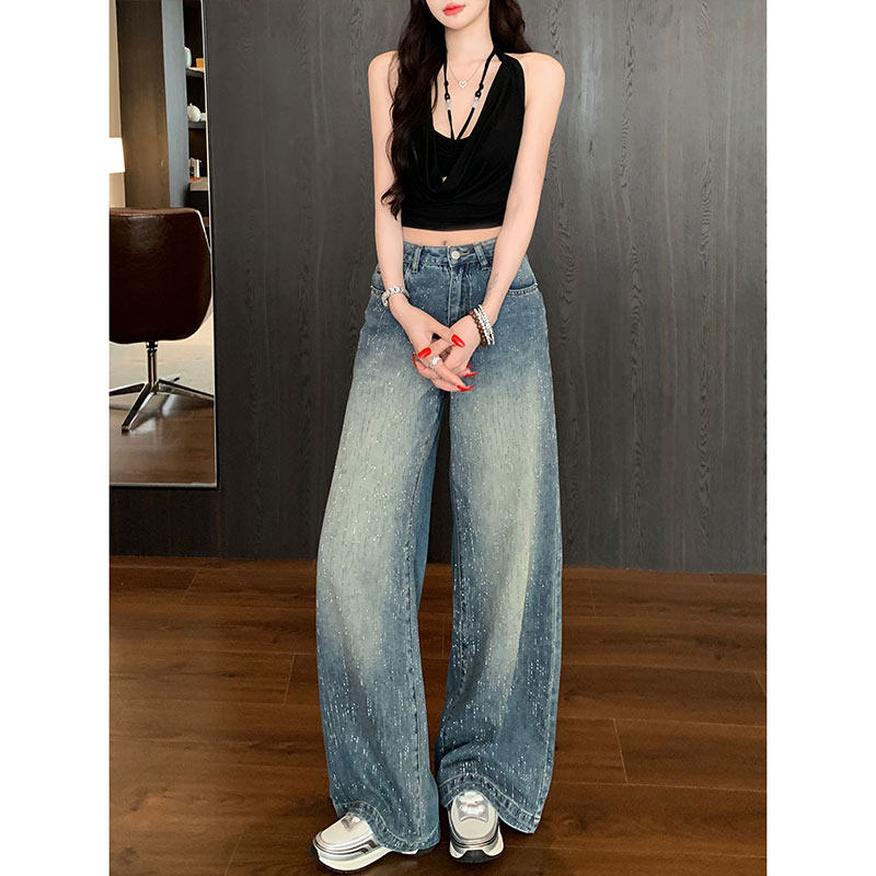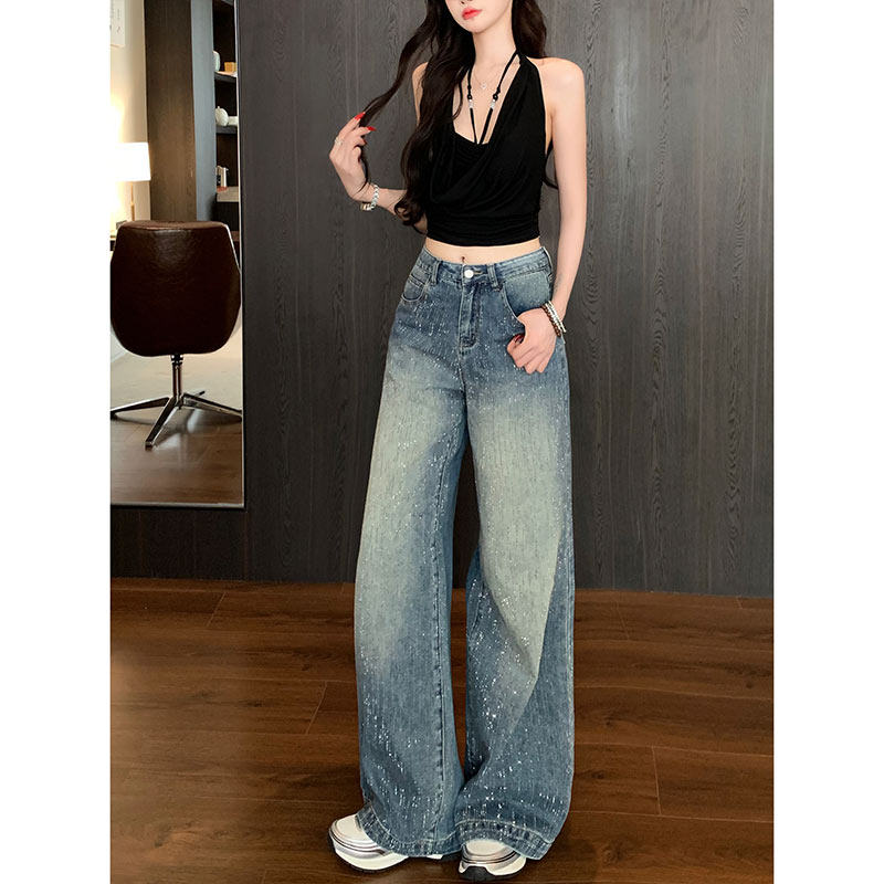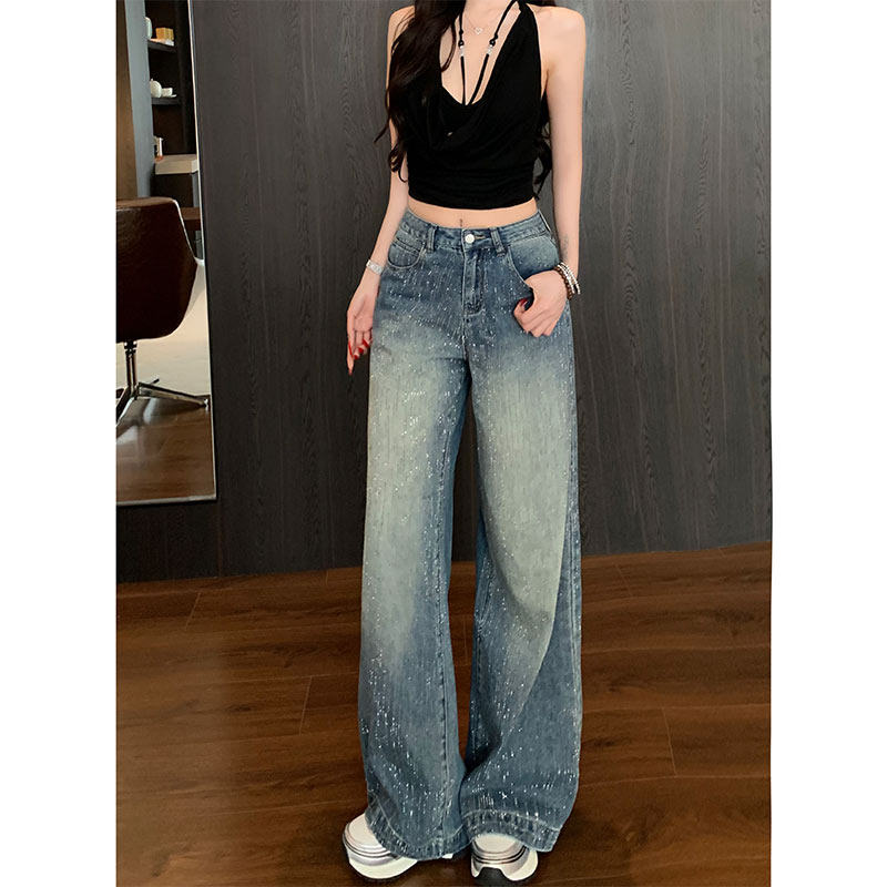 Li Li Clothing Fleece-Lined Starry Rhinestone Sparkling Wide-Leg Loose Jeans for Women 2026 Super Popular Winter Floor-Length Pants