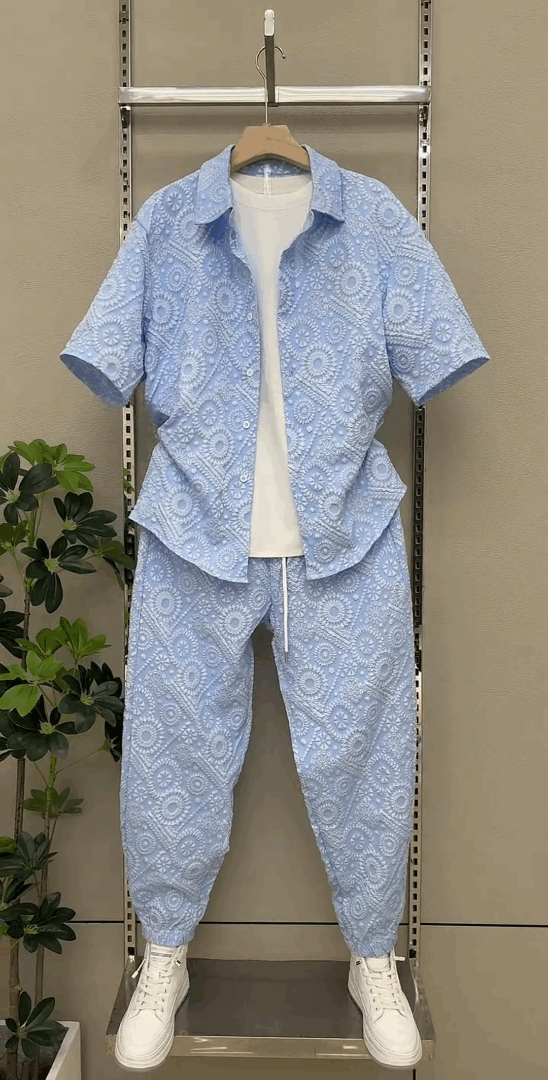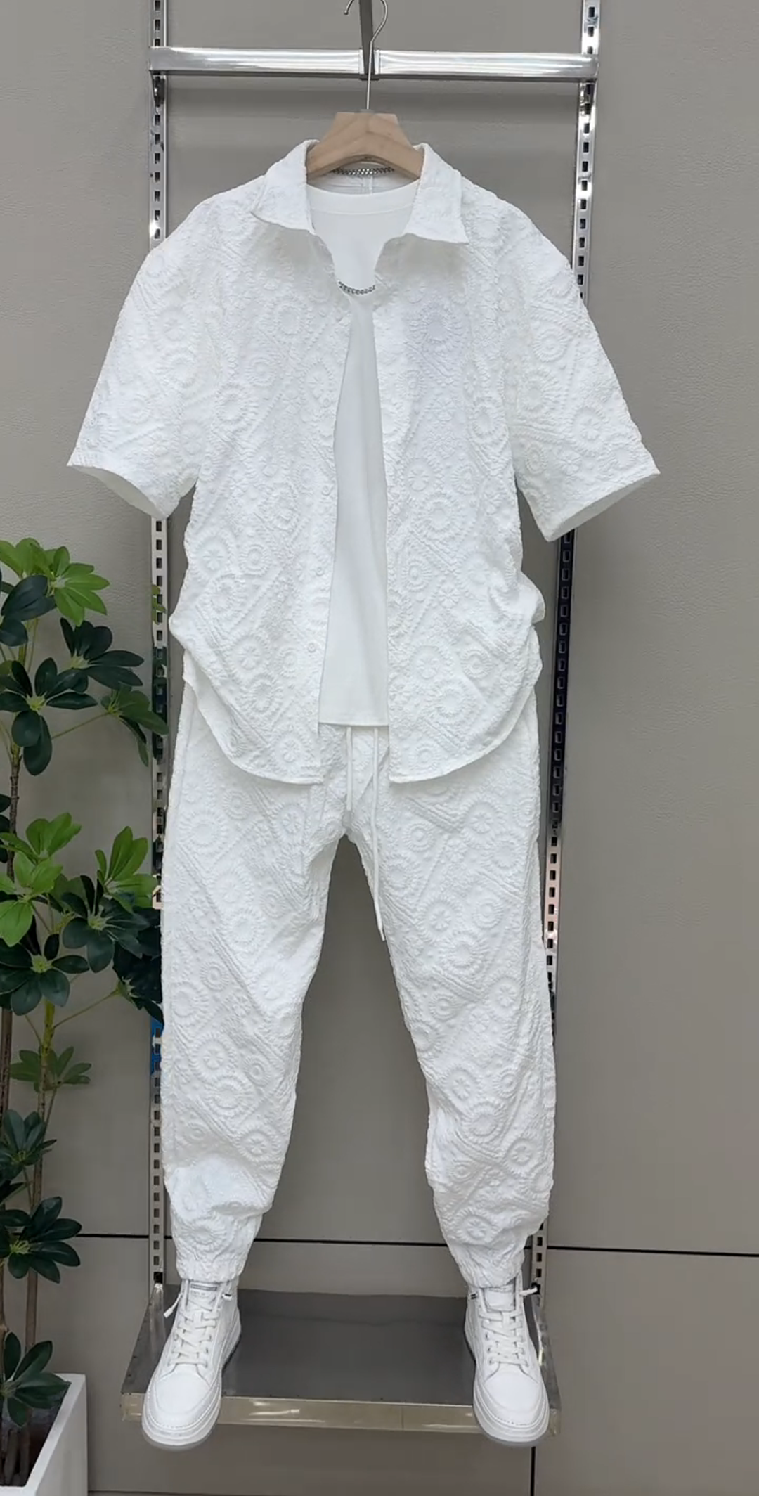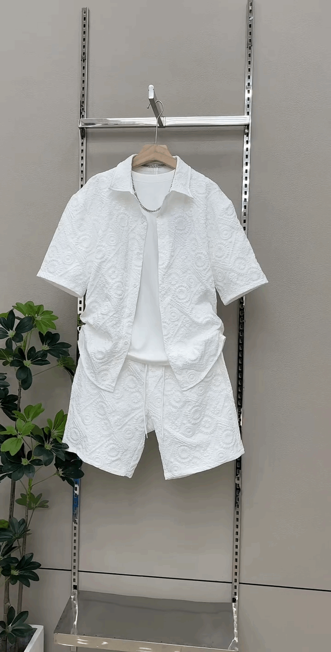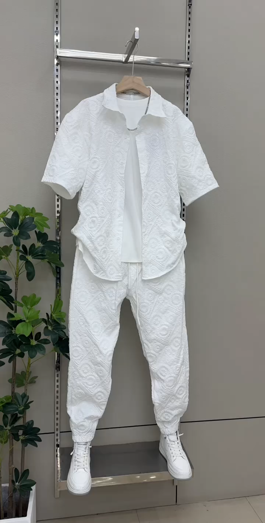 Summer Thin Men's Lapel Chanel-Style Embossed Suit with Shorts, Short-Sleeved, Fashionable, Loose Two-Piece Set, Long Pants, Couple Style