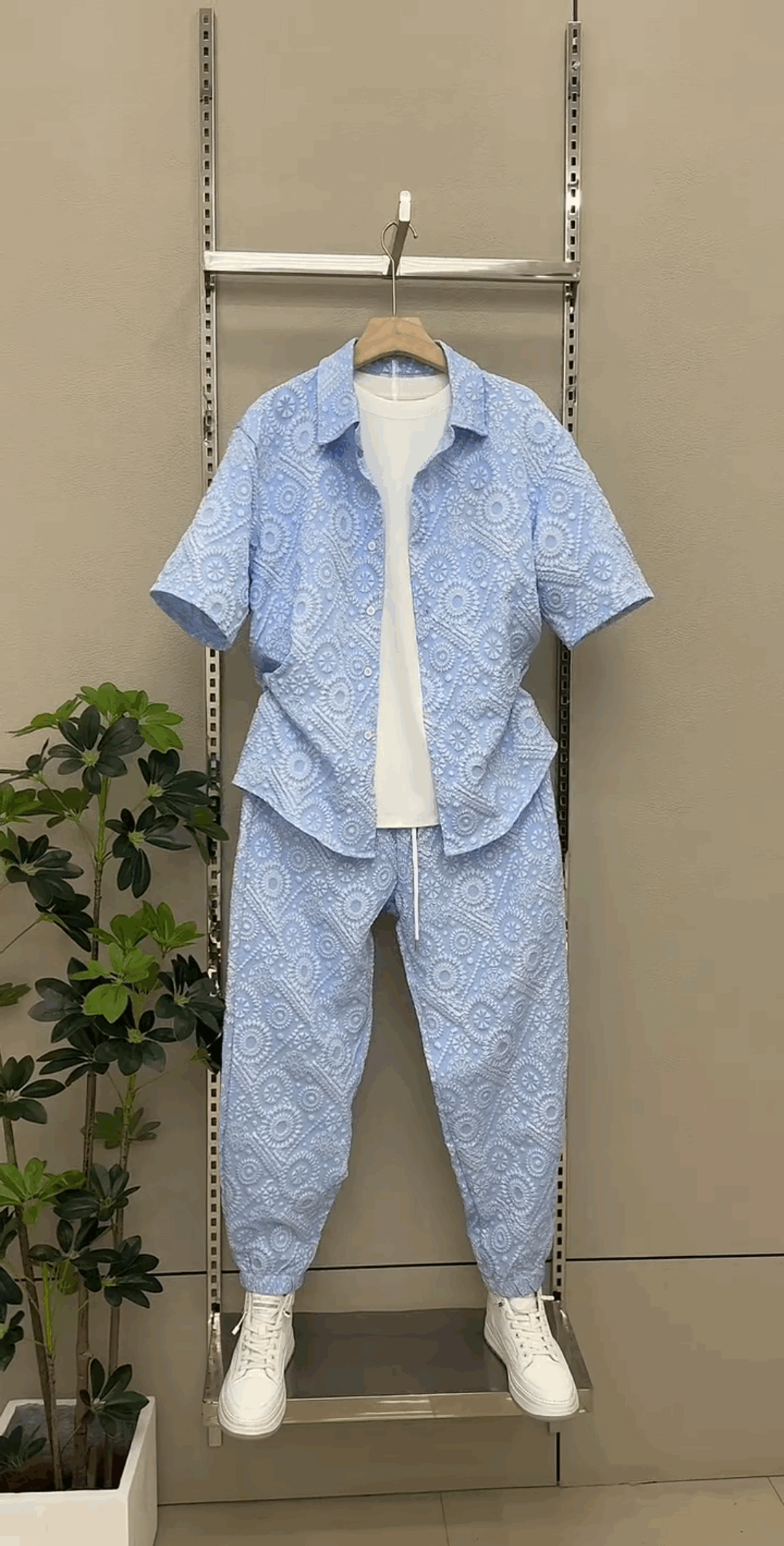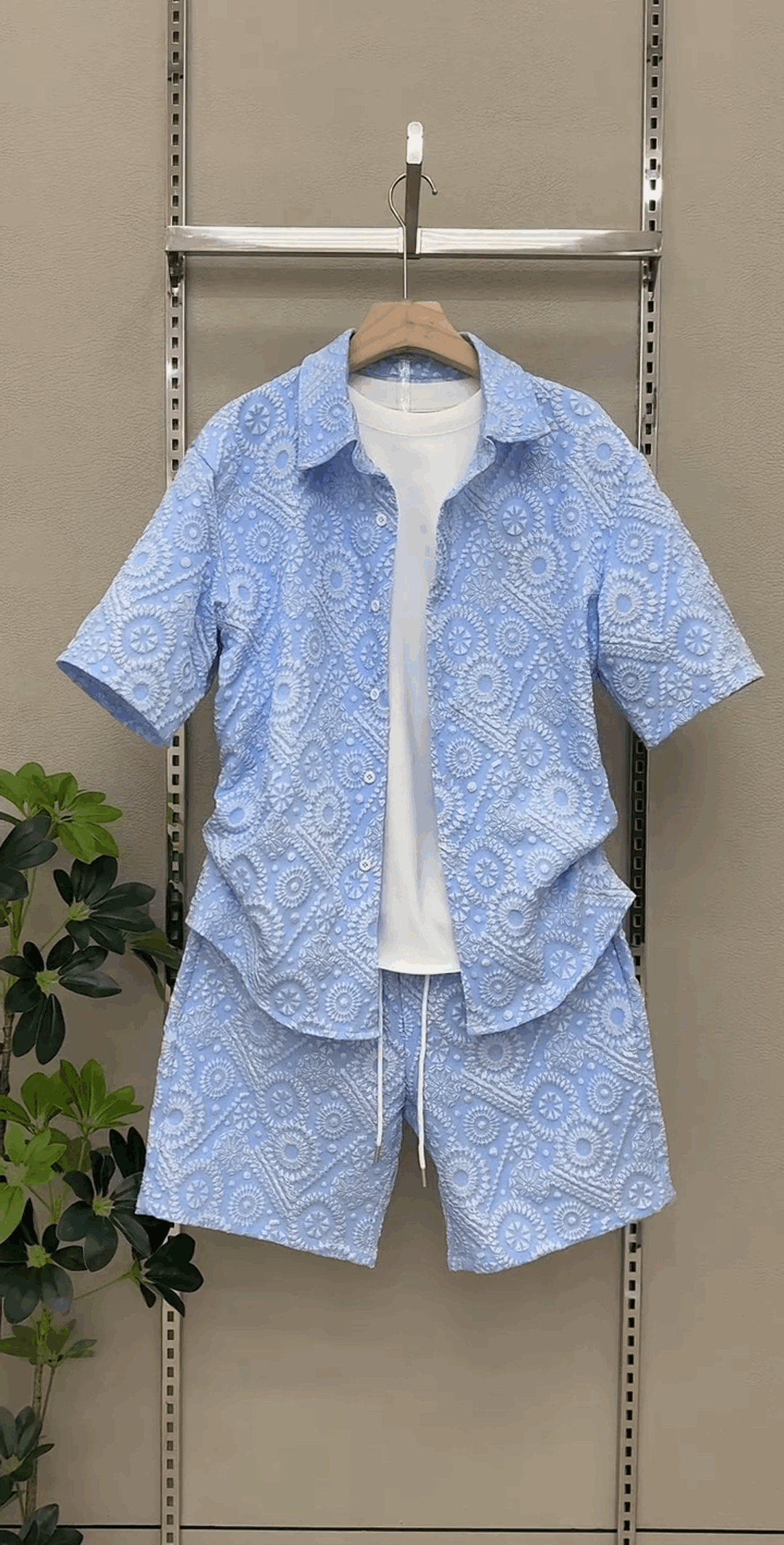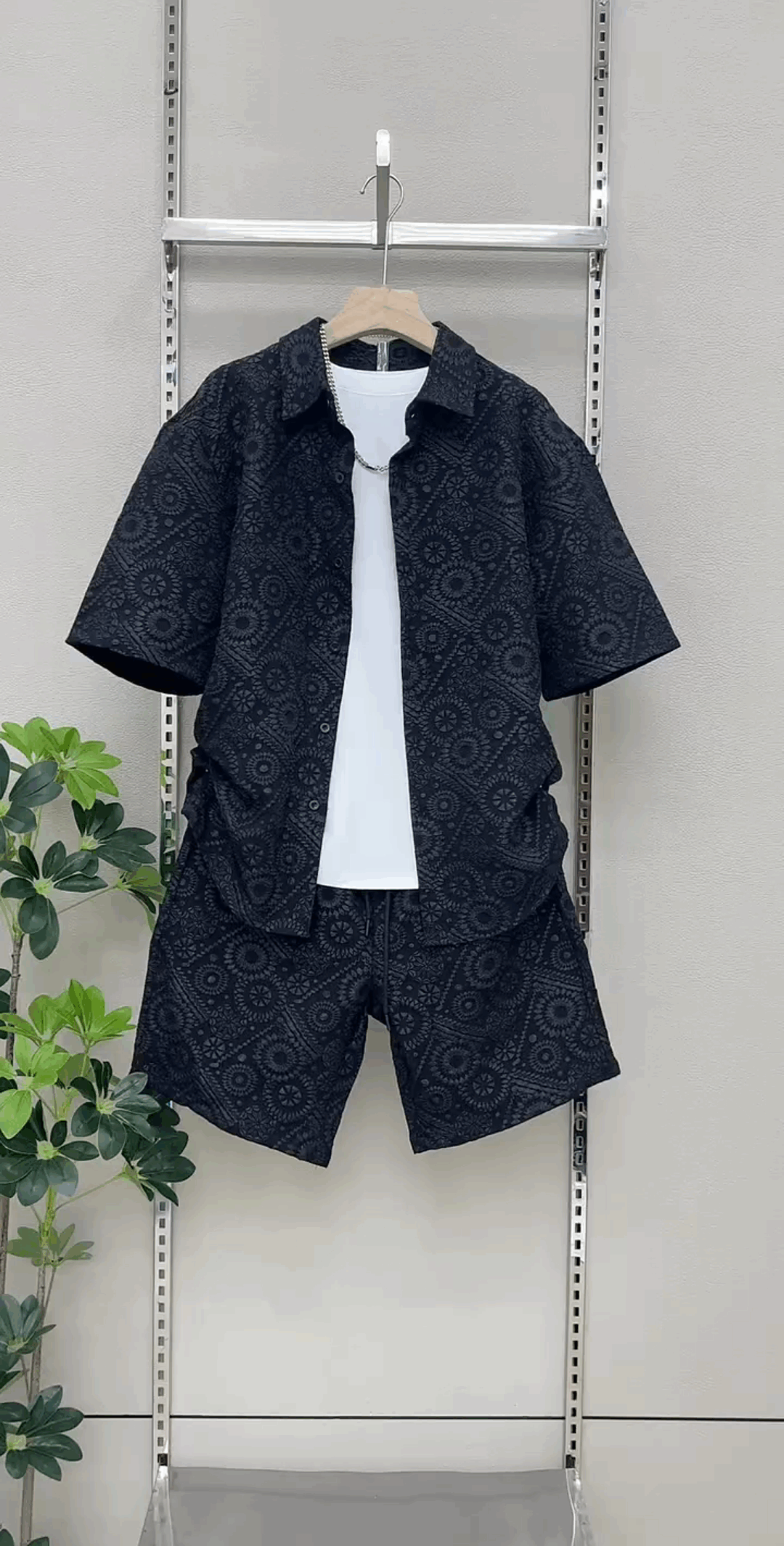 Summer Thin Men's Lapel Chanel-Style Embossed Suit with Shorts, Short-Sleeved, Fashionable, Loose Two-Piece Set, Long Pants, Couple Style