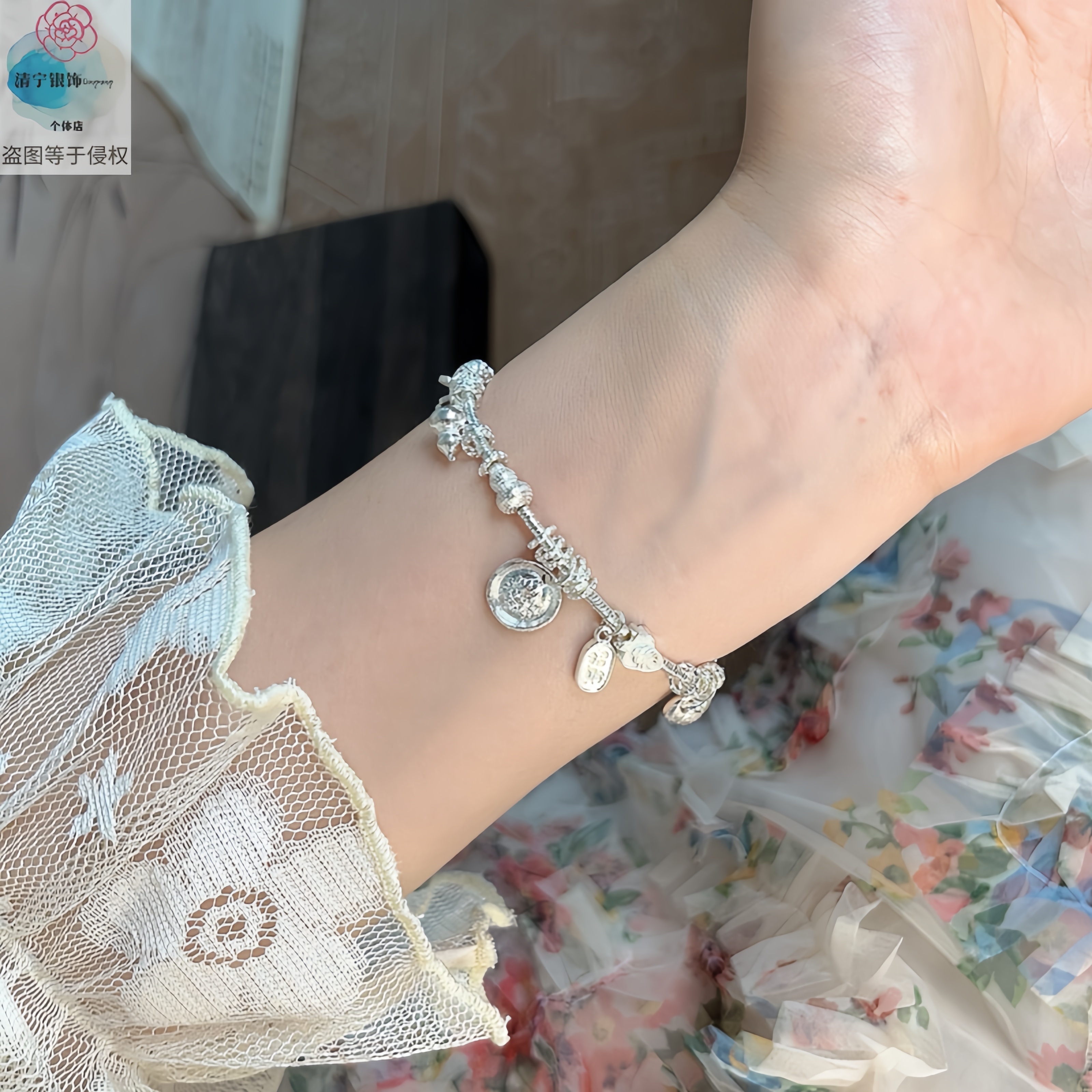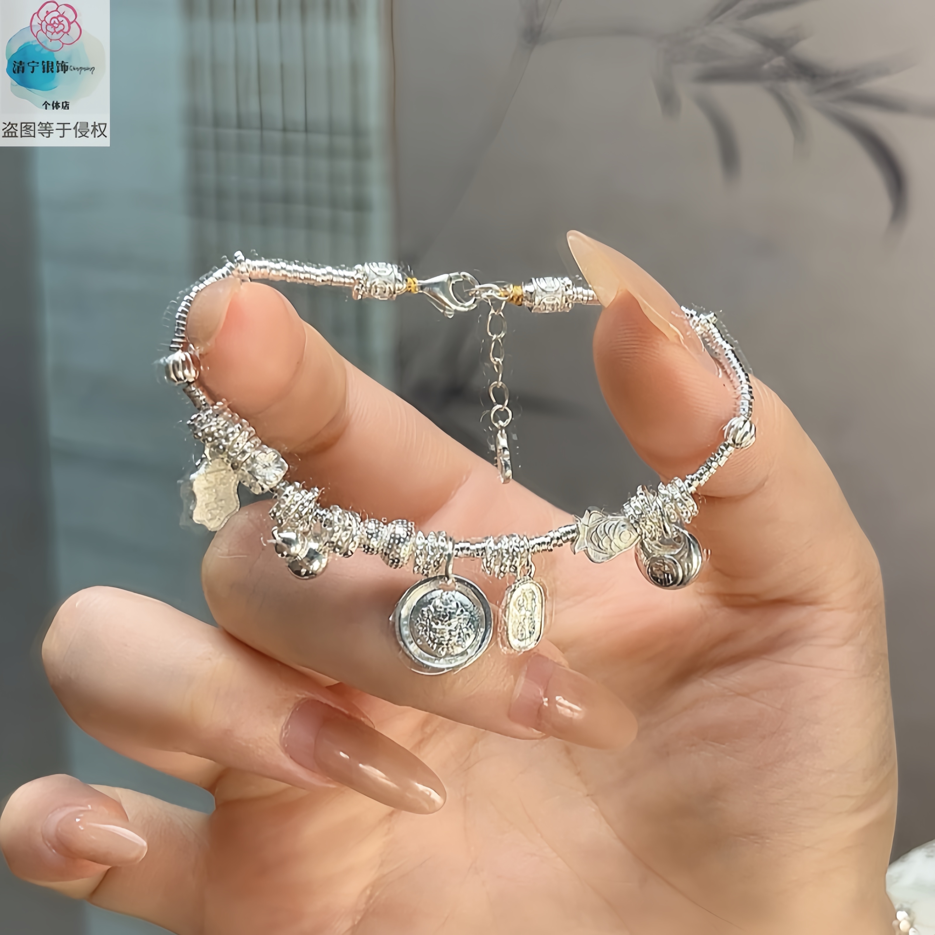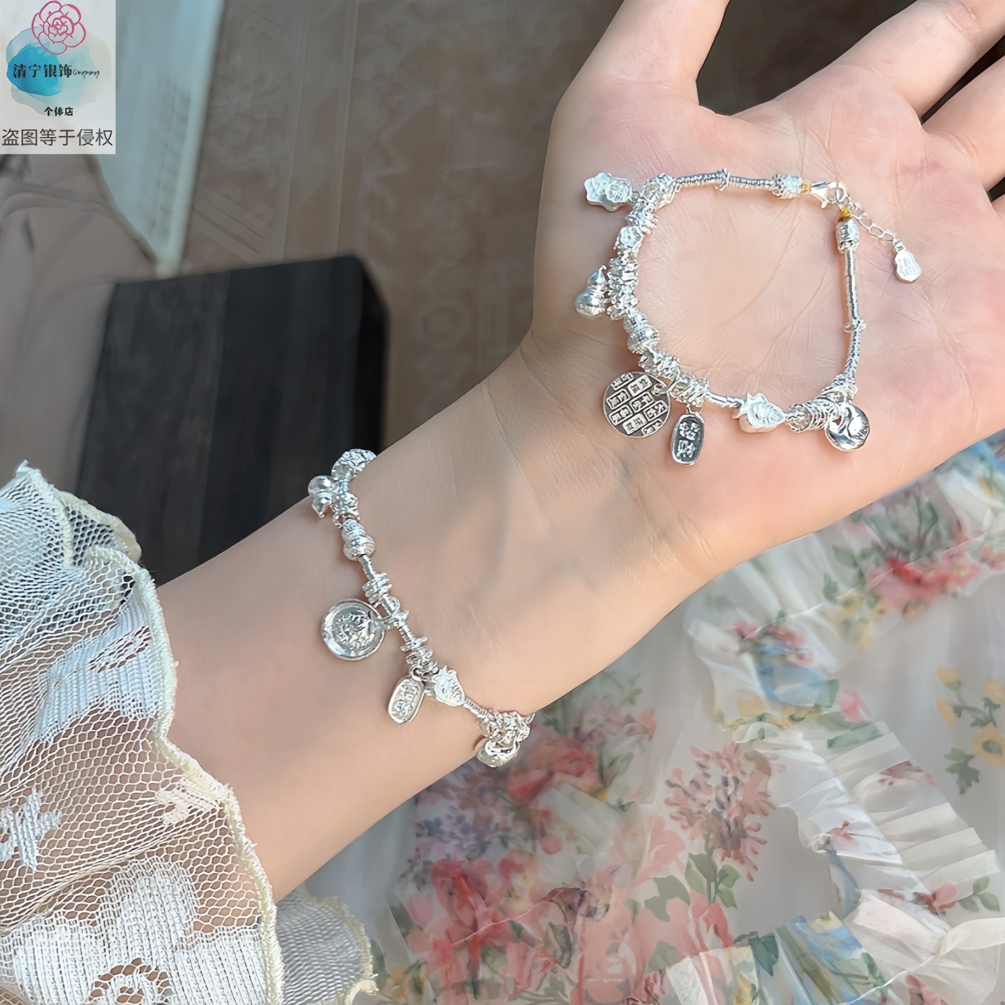 """"""Pure Silver 999 Baiyun""""Pure Silver Bracelet. National Trend Niche Chinoiserie Plate Wrapped with Yellow God of Wealth and Fat Blessings as a Gift for Your Girlfriend