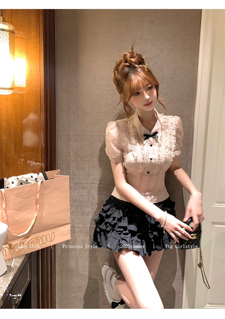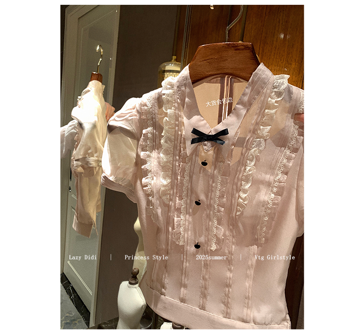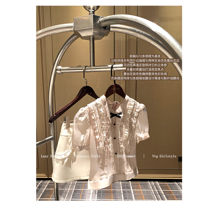 分别拼接本布荷叶边抽褶与两种定染杏色蕾丝花边 本布荷叶边经高温定型保持立体感 蕾丝采用定染杏色确保色彩统一多重材质叠加打造视觉焦点腰部下摆细节 腰部同样采用12条倒褶收腰设计 精准勾勒纤细腰线 下摆两侧分叉开口 更显瘦 改良泡泡袖型 袖口3条可调节倒褶 可自由开合调整围度 解决传统泡泡袖卡腋下的问题 立体剪裁有效修饰手臂线条 兼顾复古造型与穿着实用性