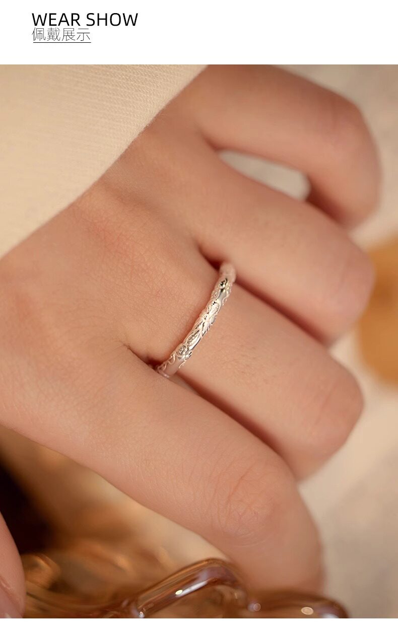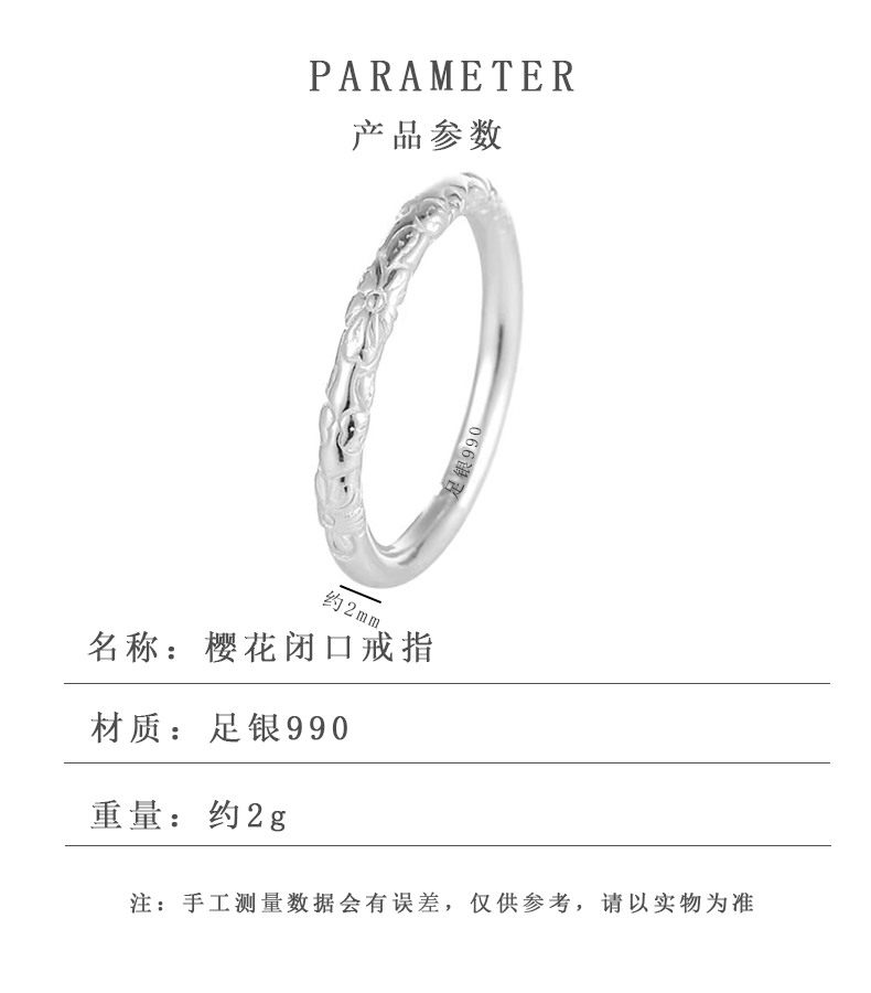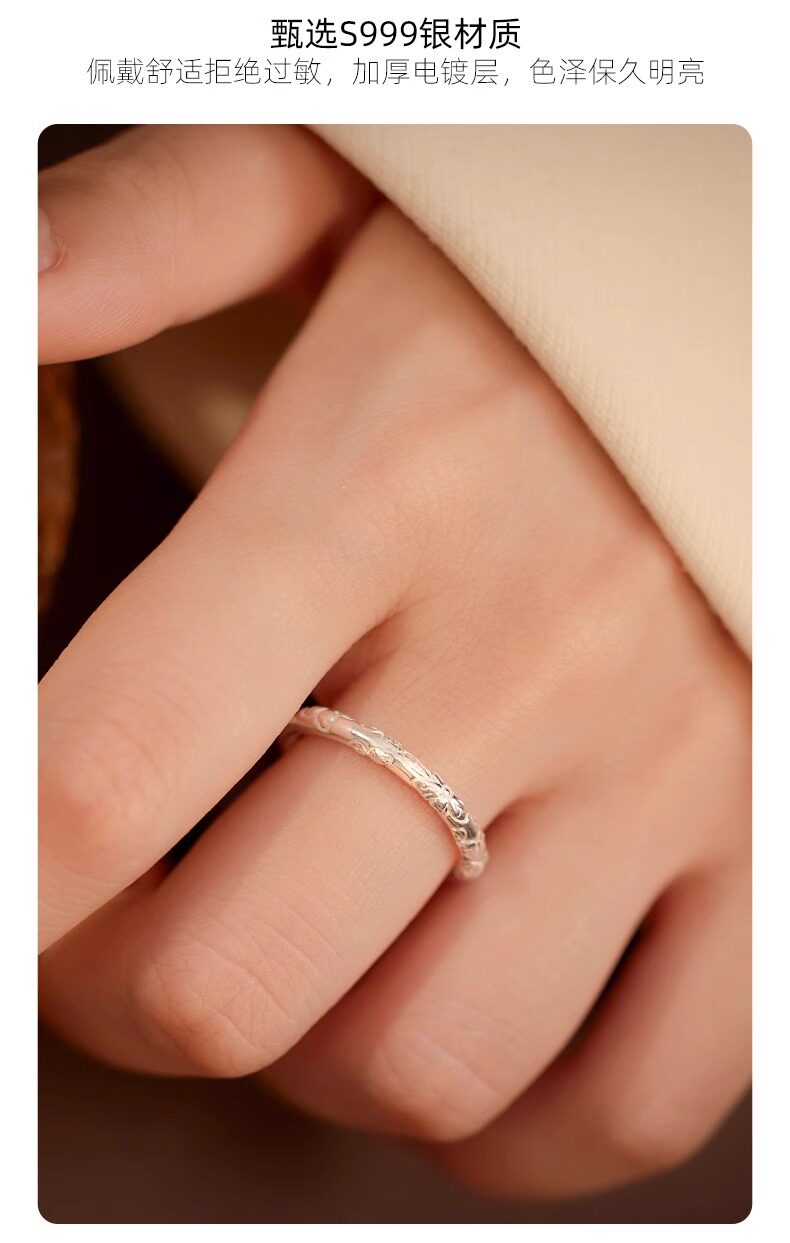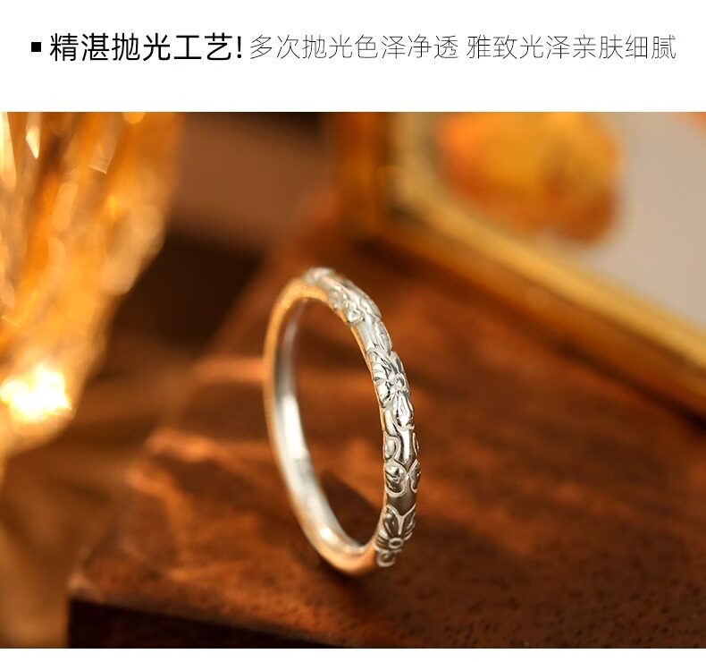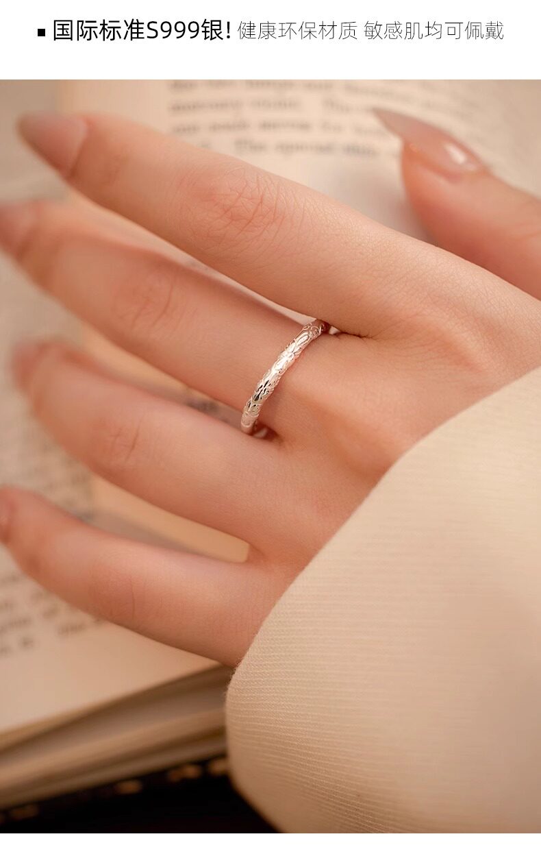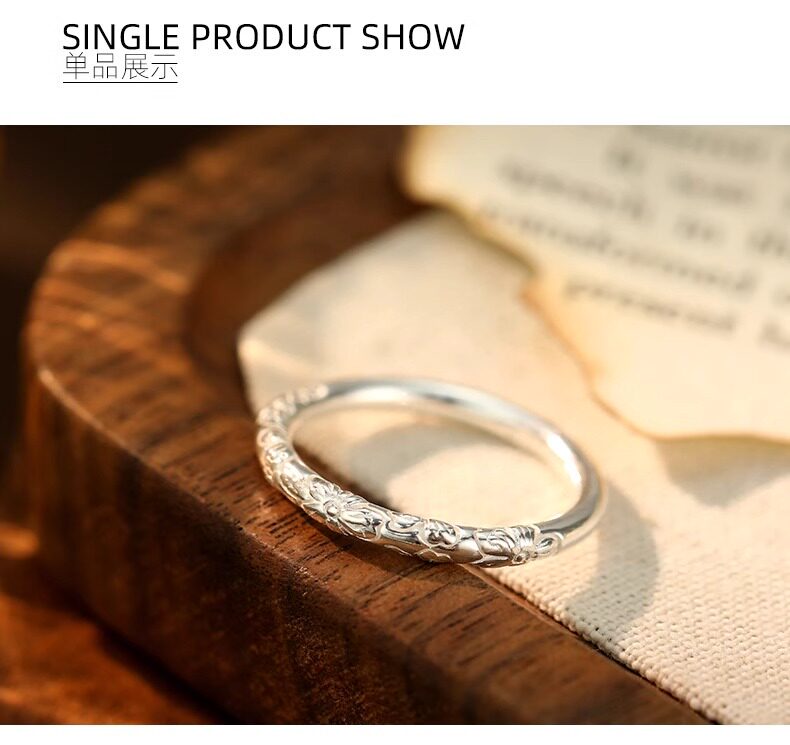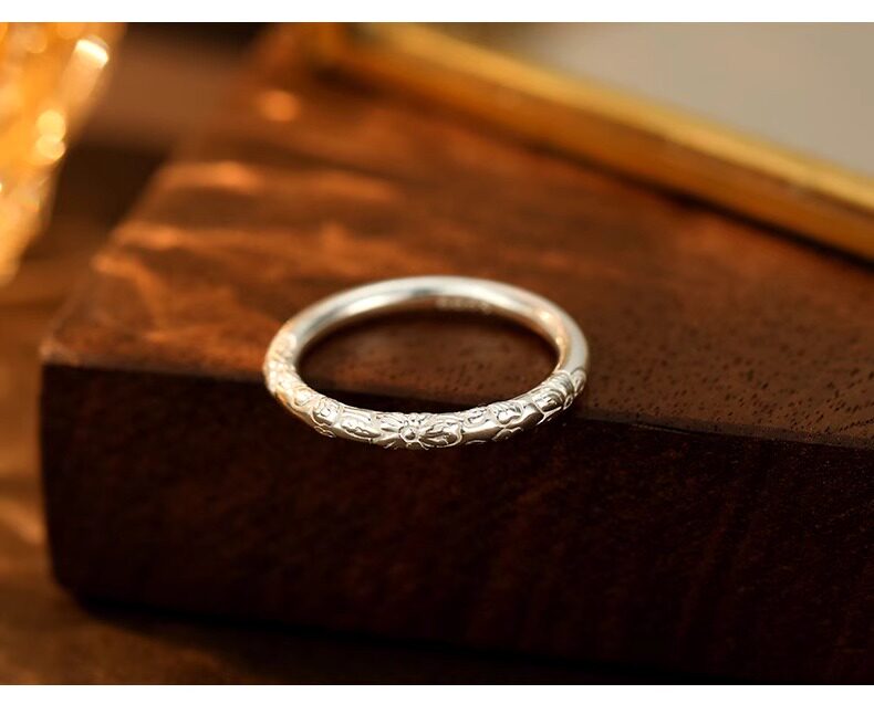 999 Pure Silver Cherry Blossom Ring, Pure Silver Embossed Antique Style, Unisex Closed Band, Solid Ring, Couple Style, Versatile